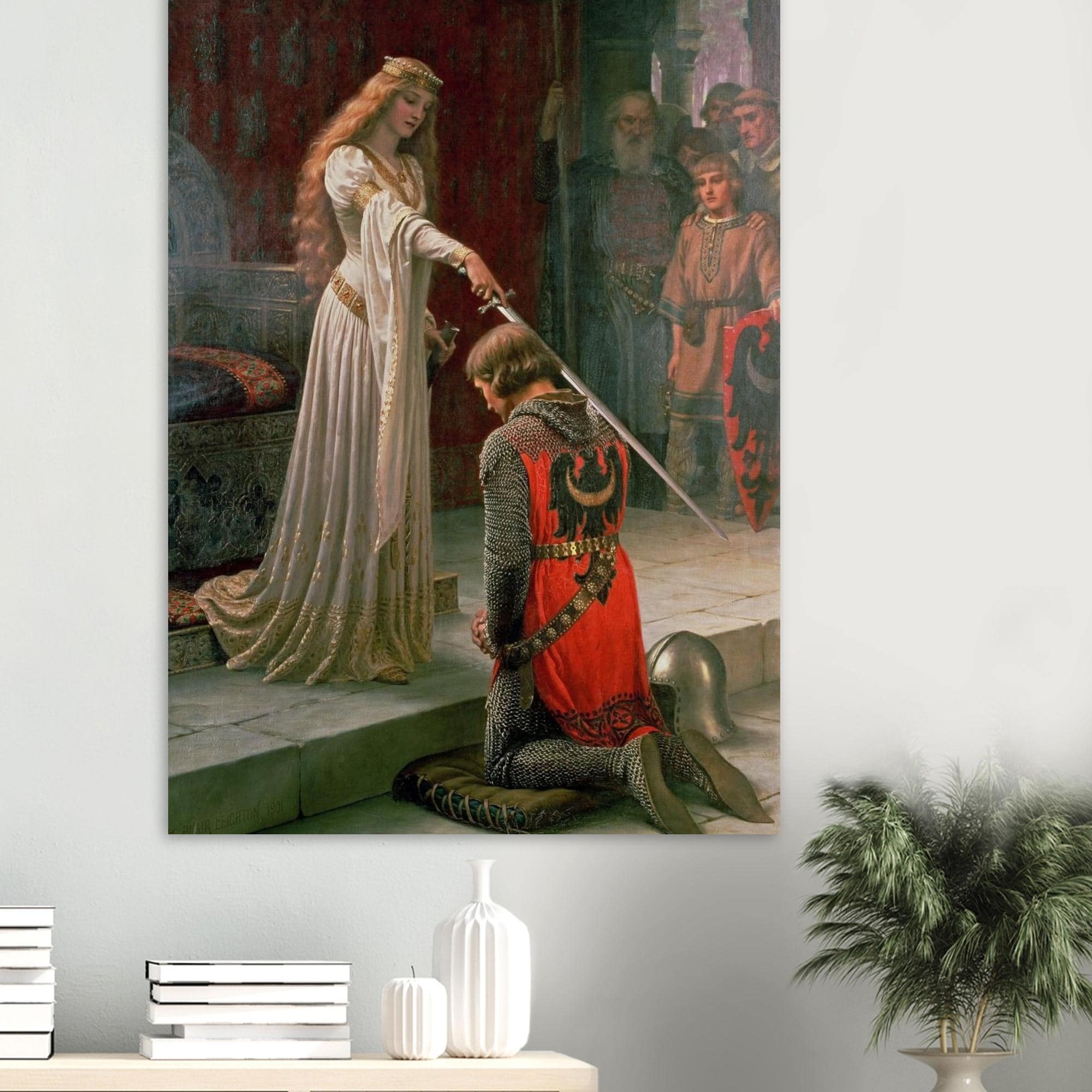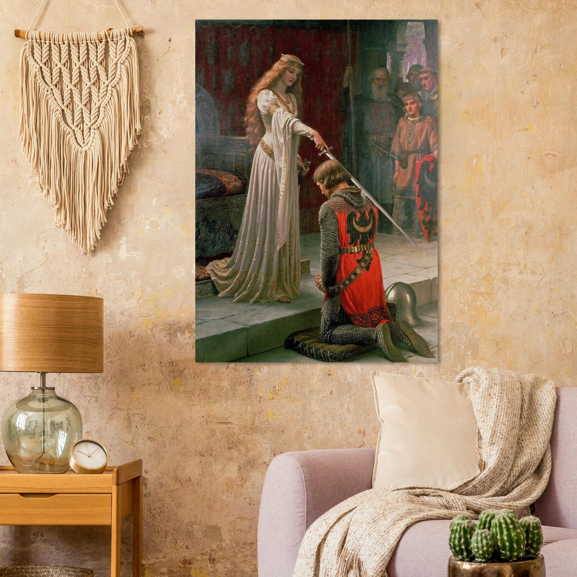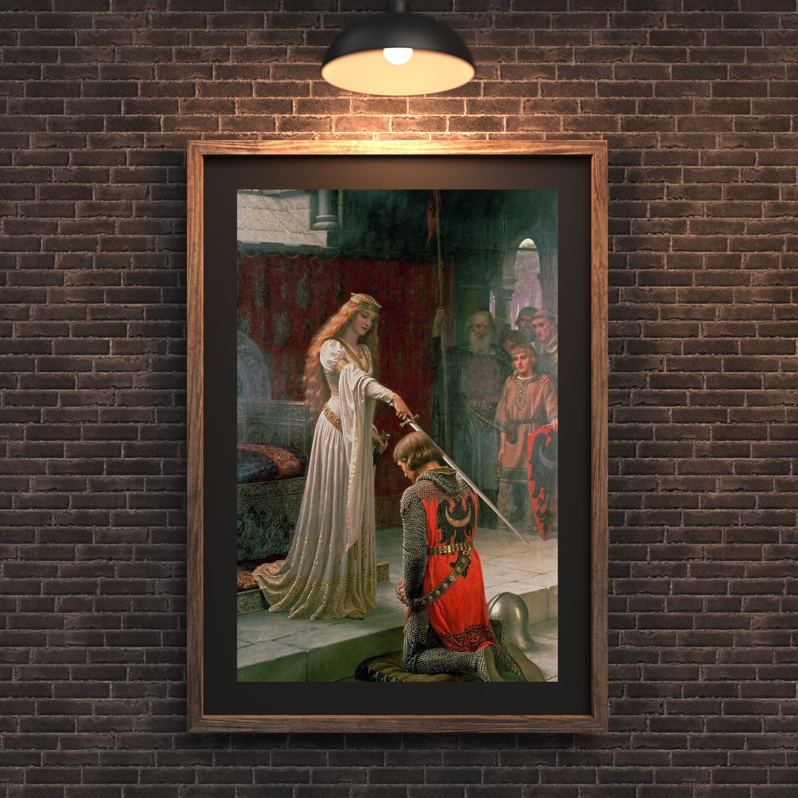 Immerse your space in the romantic drama of the Victorian Era with this iconic art print: "The Accolade" (1901) by Edmund Blair Leighton. This masterpiece captures the solemn, majestic moment of a knight's investiture, where a queen or noblewoman bestows the final touch of knighthood upon a kneeling warrior.
