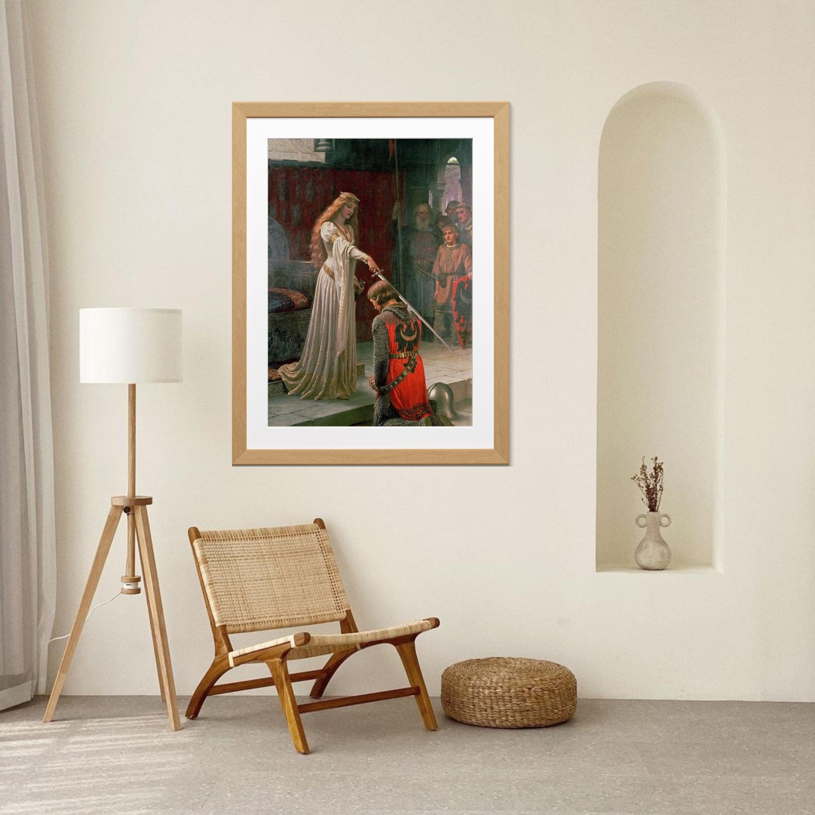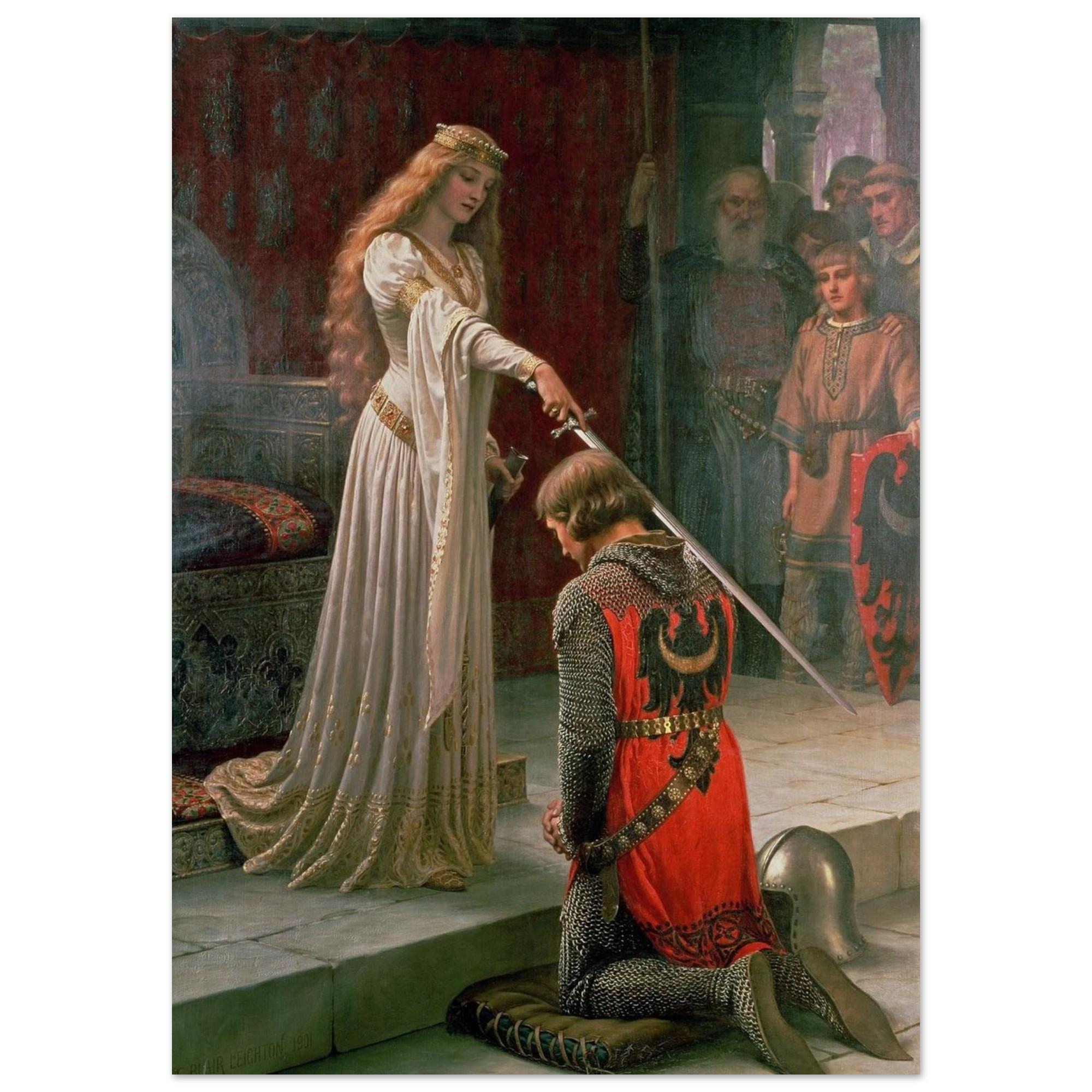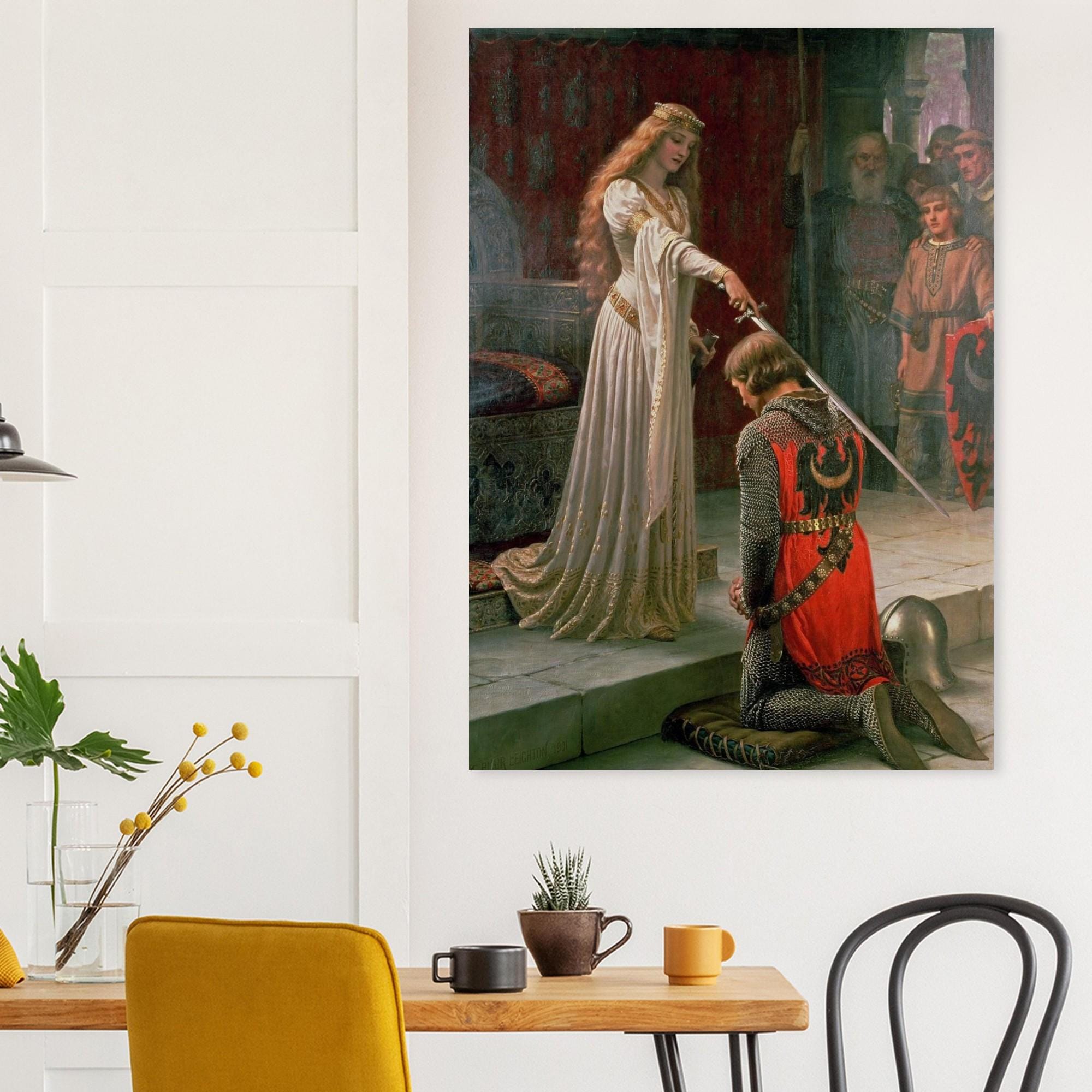 Immerse your space in the romantic drama of the Victorian Era with this iconic art print: "The Accolade" (1901) by Edmund Blair Leighton. This masterpiece captures the solemn, majestic moment of a knight's investiture, where a queen or noblewoman bestows the final touch of knighthood upon a kneeling warrior.