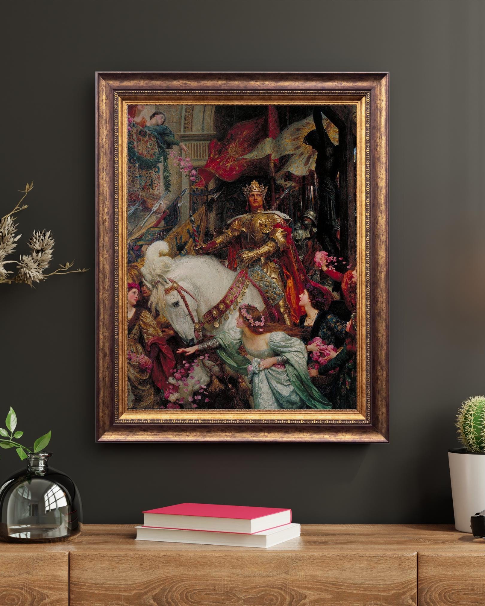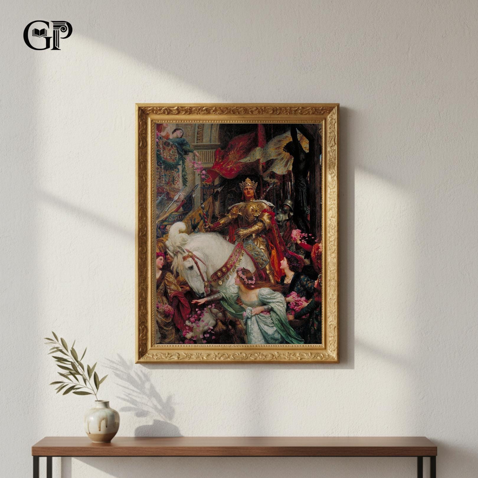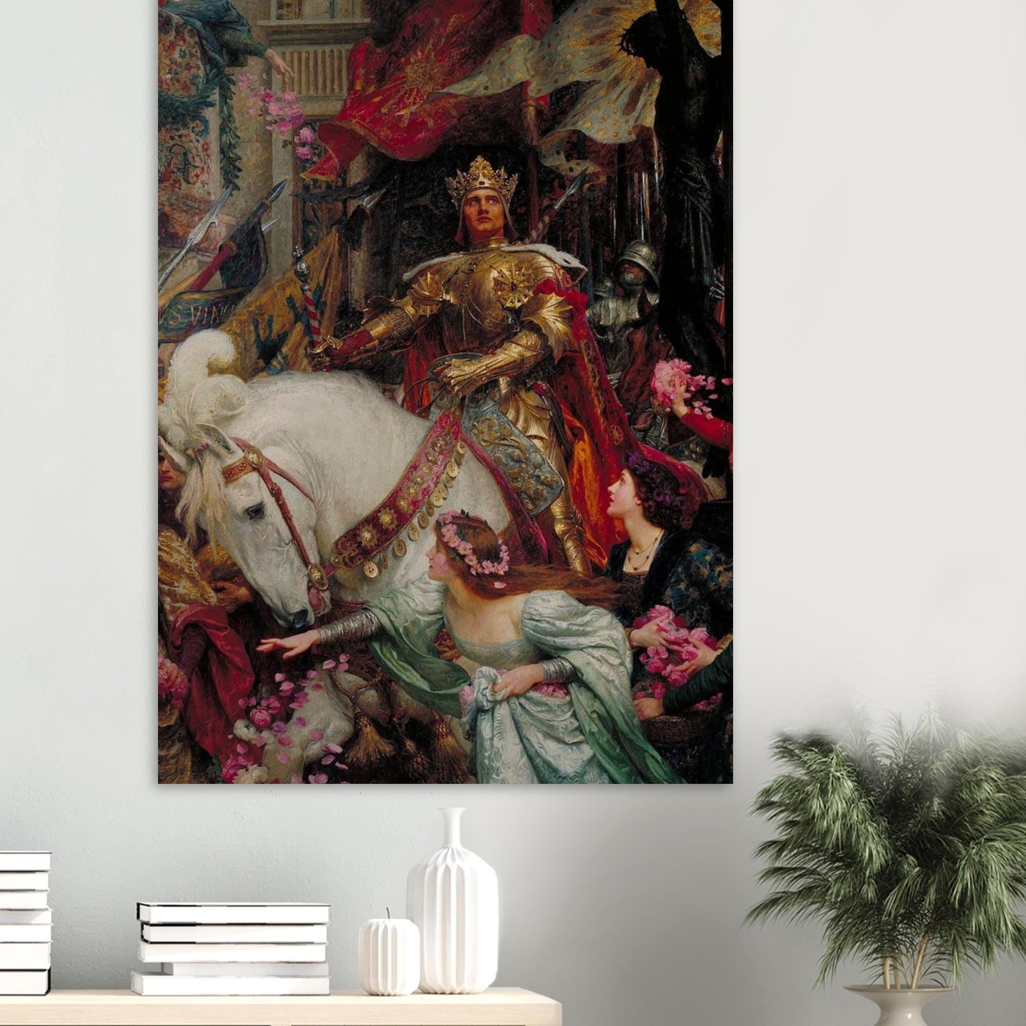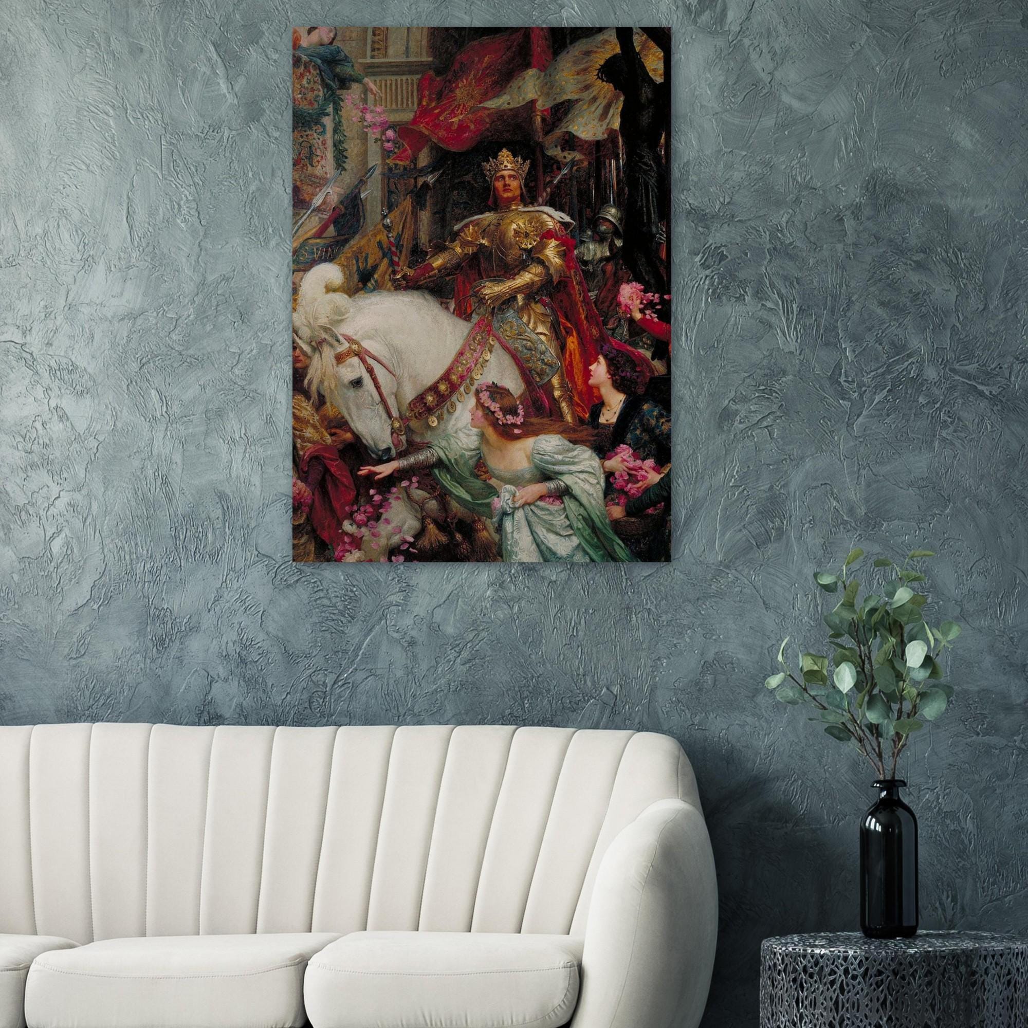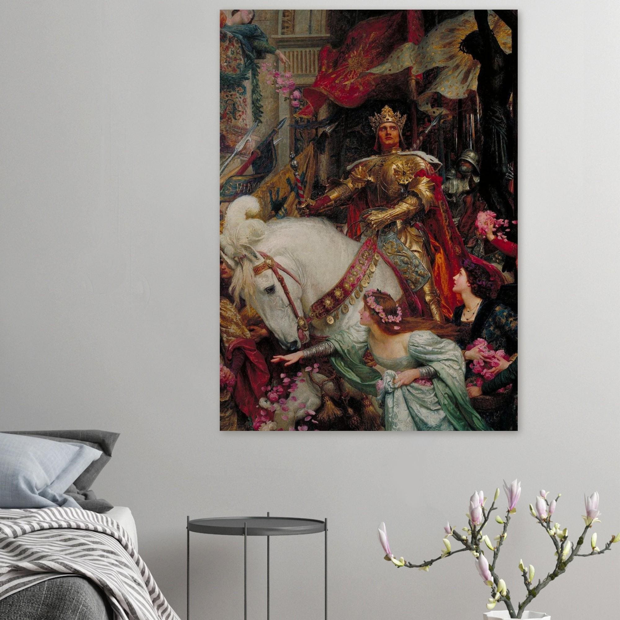 Push past common decor with this captivating Victorian Knight King Canvas Print. Reminiscent of the dramatic historical works of Edwin Austin Abbey, this painting captures a magnificent, triumphant scene of a King or noble Knight riding through a jubilant crowd, showering him with rose petals. The richness of the armor, the royal robes, and the intense emotion make this a powerful **Medieval Revival** piece. Perfect for those who love historical drama, **Dark Academia**, and the opulent storytelling of the Victorian era.