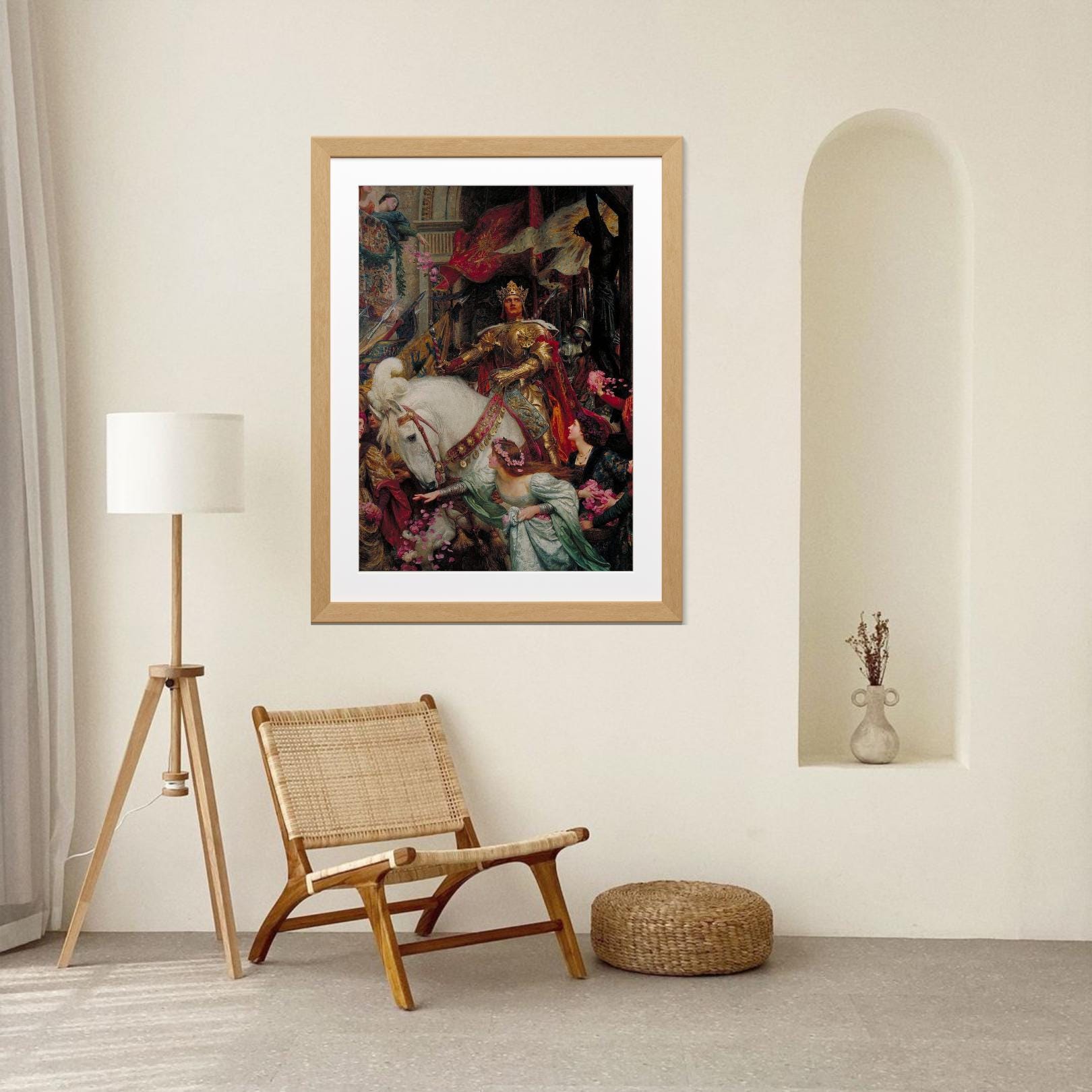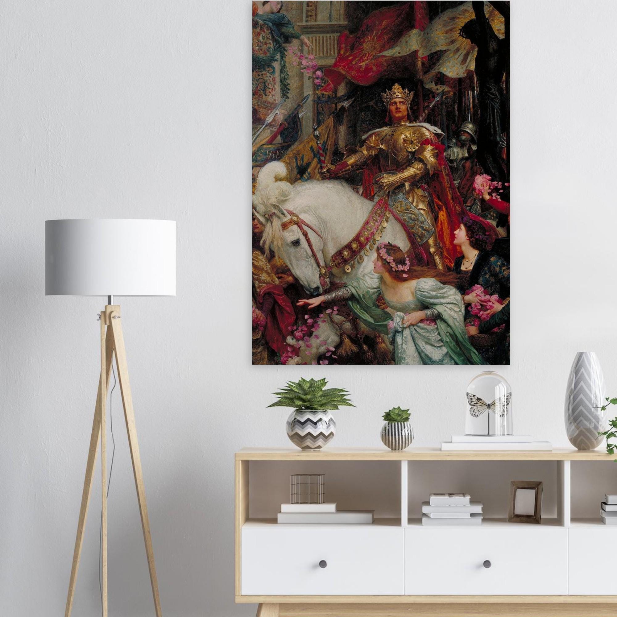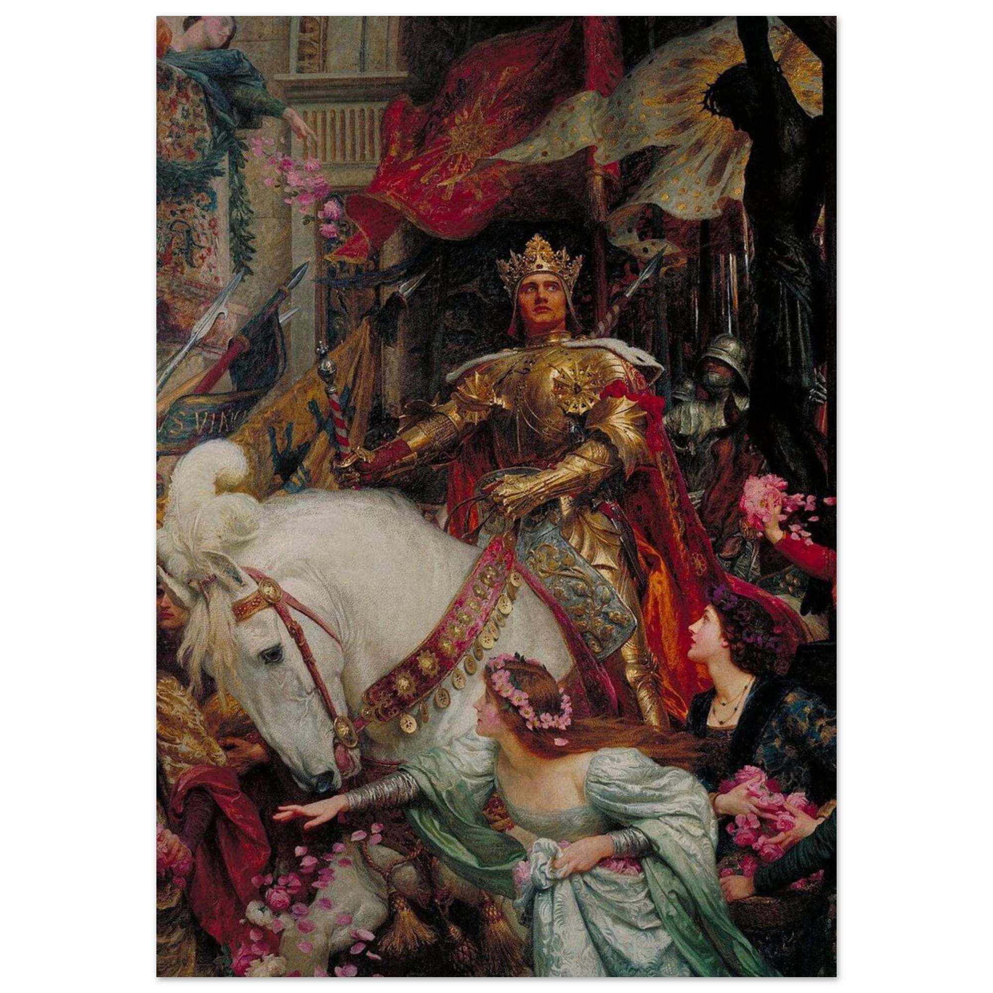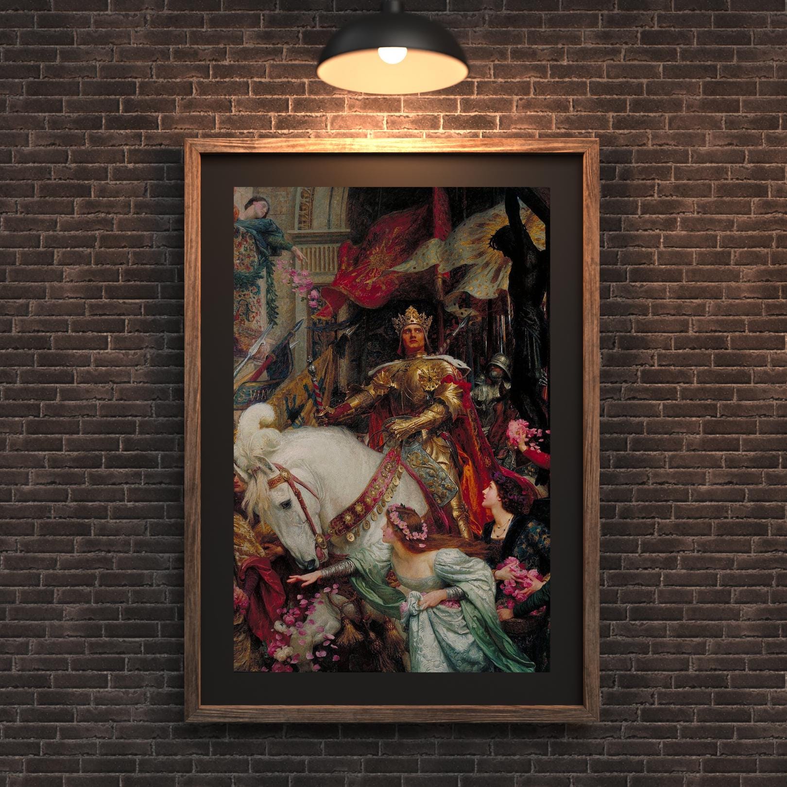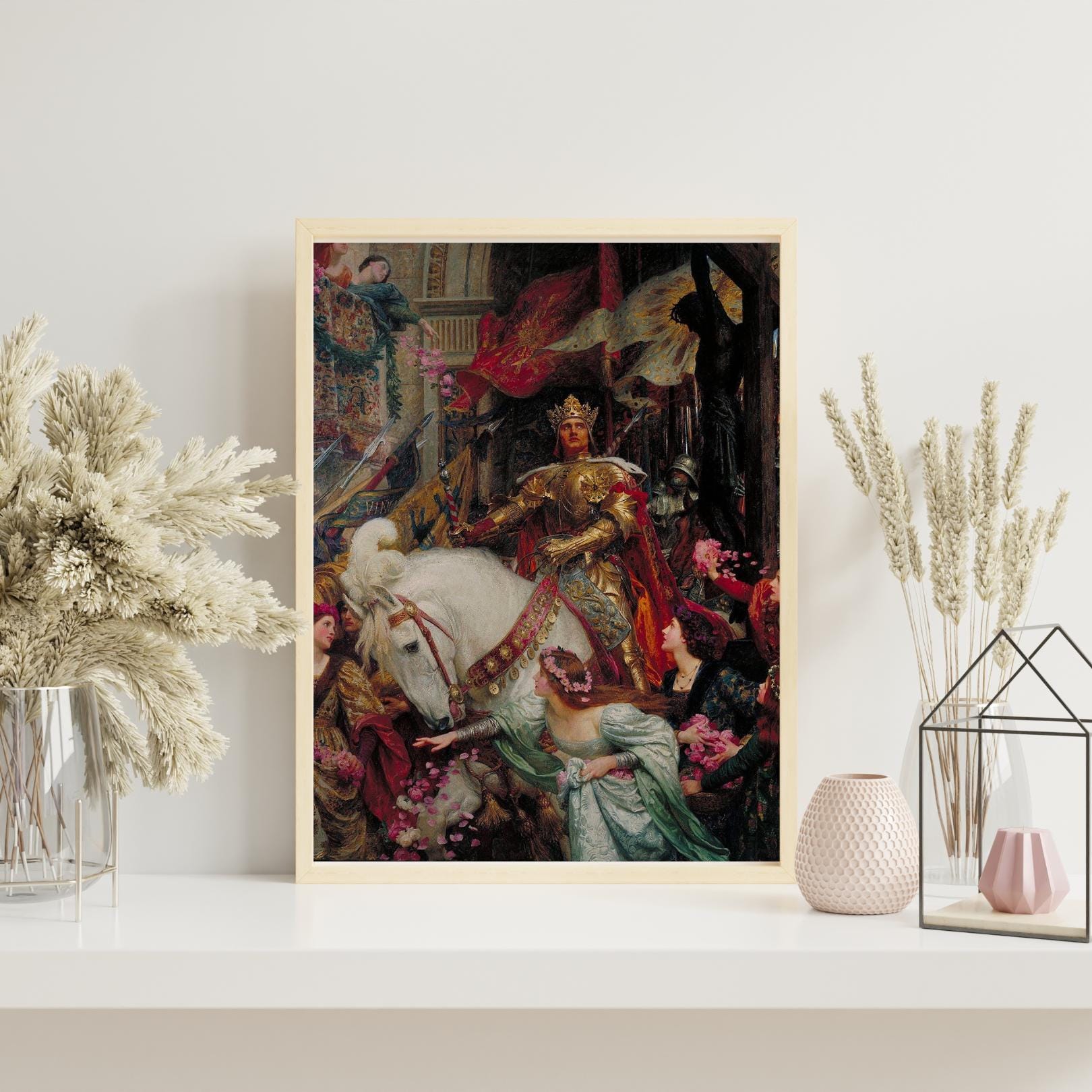 Push past common decor with this captivating Victorian Knight King Canvas Print. Reminiscent of the dramatic historical works of Edwin Austin Abbey, this painting captures a magnificent, triumphant scene of a King or noble Knight riding through a jubilant crowd, showering him with rose petals. The richness of the armor, the royal robes, and the intense emotion make this a powerful **Medieval Revival** piece. Perfect for those who love historical drama, **Dark Academia**, and the opulent storytelling of the Victorian era.