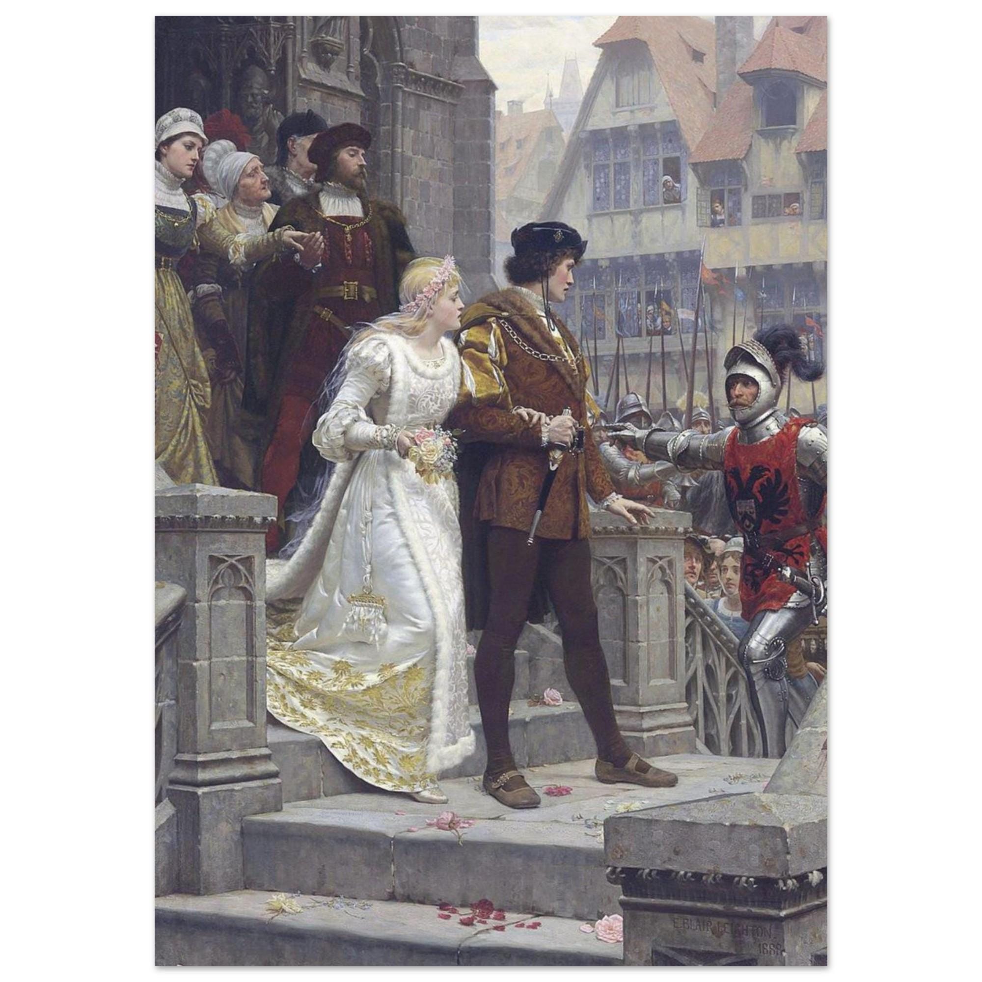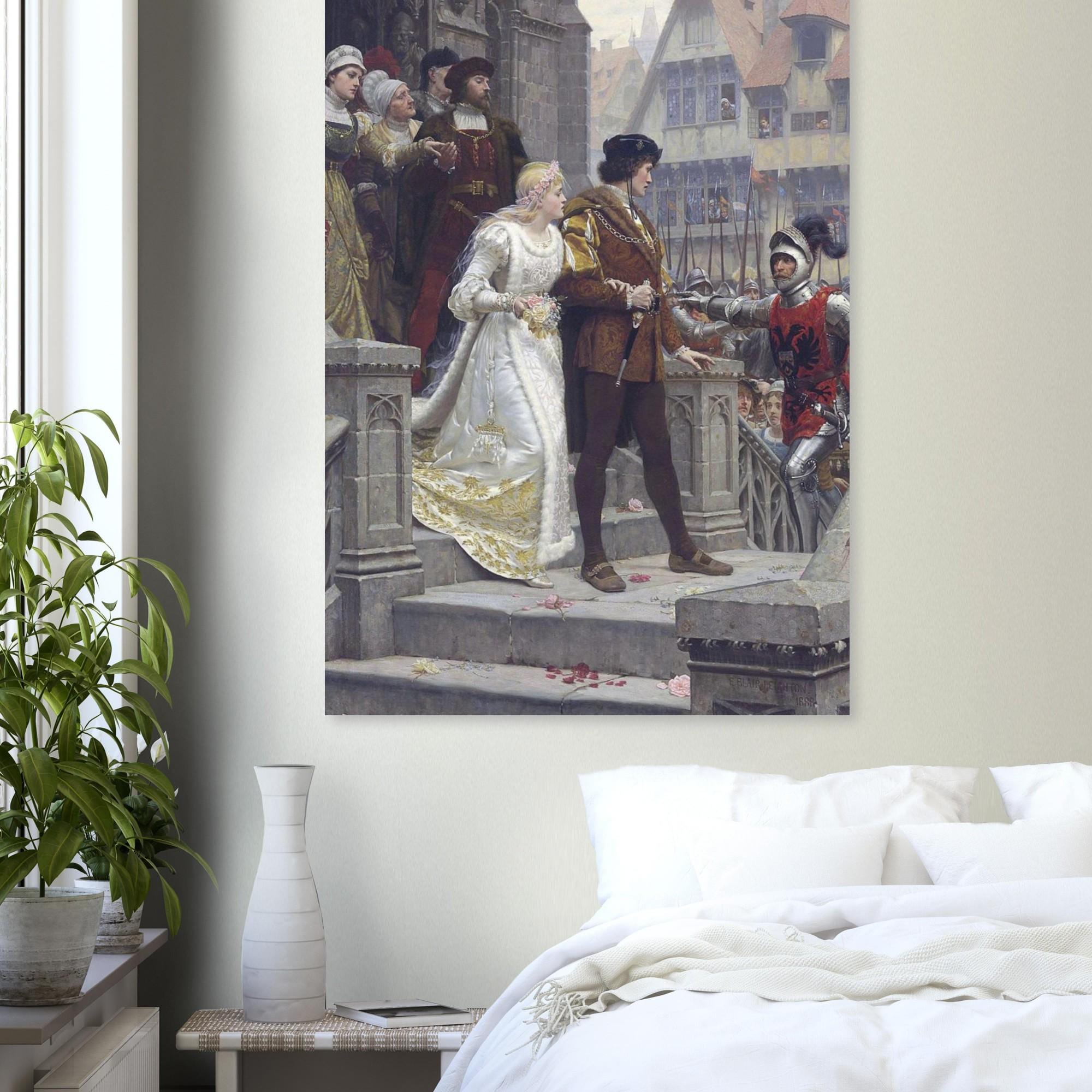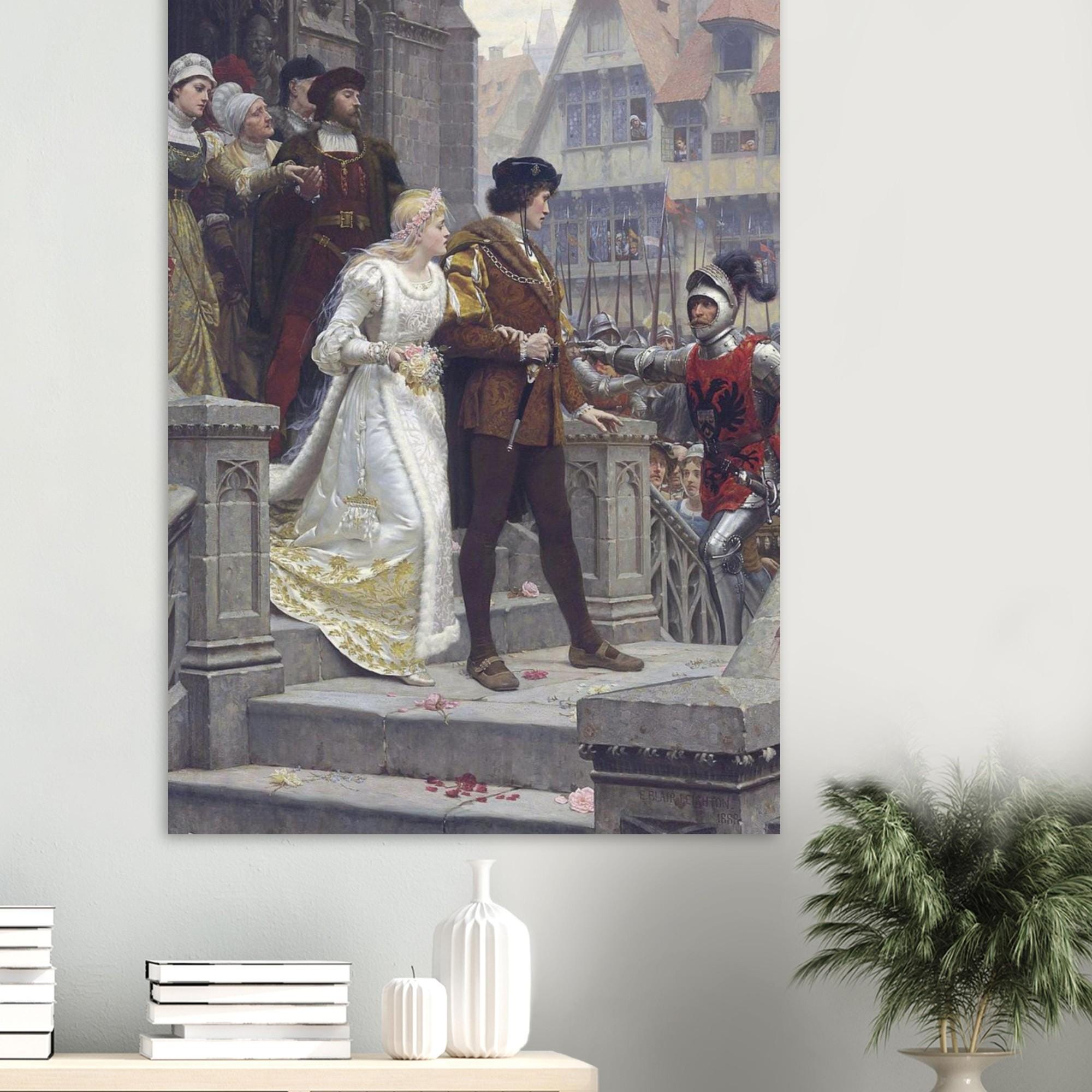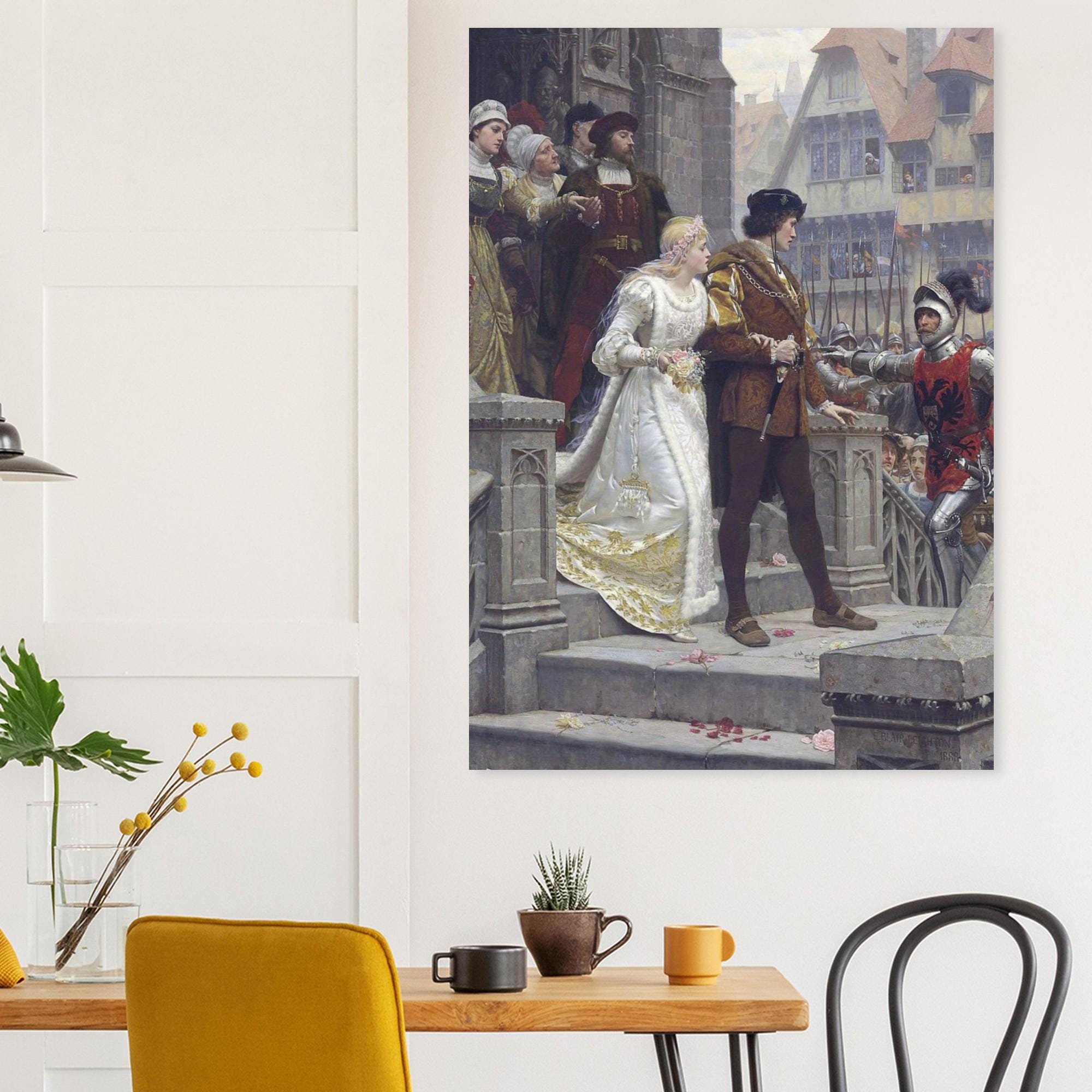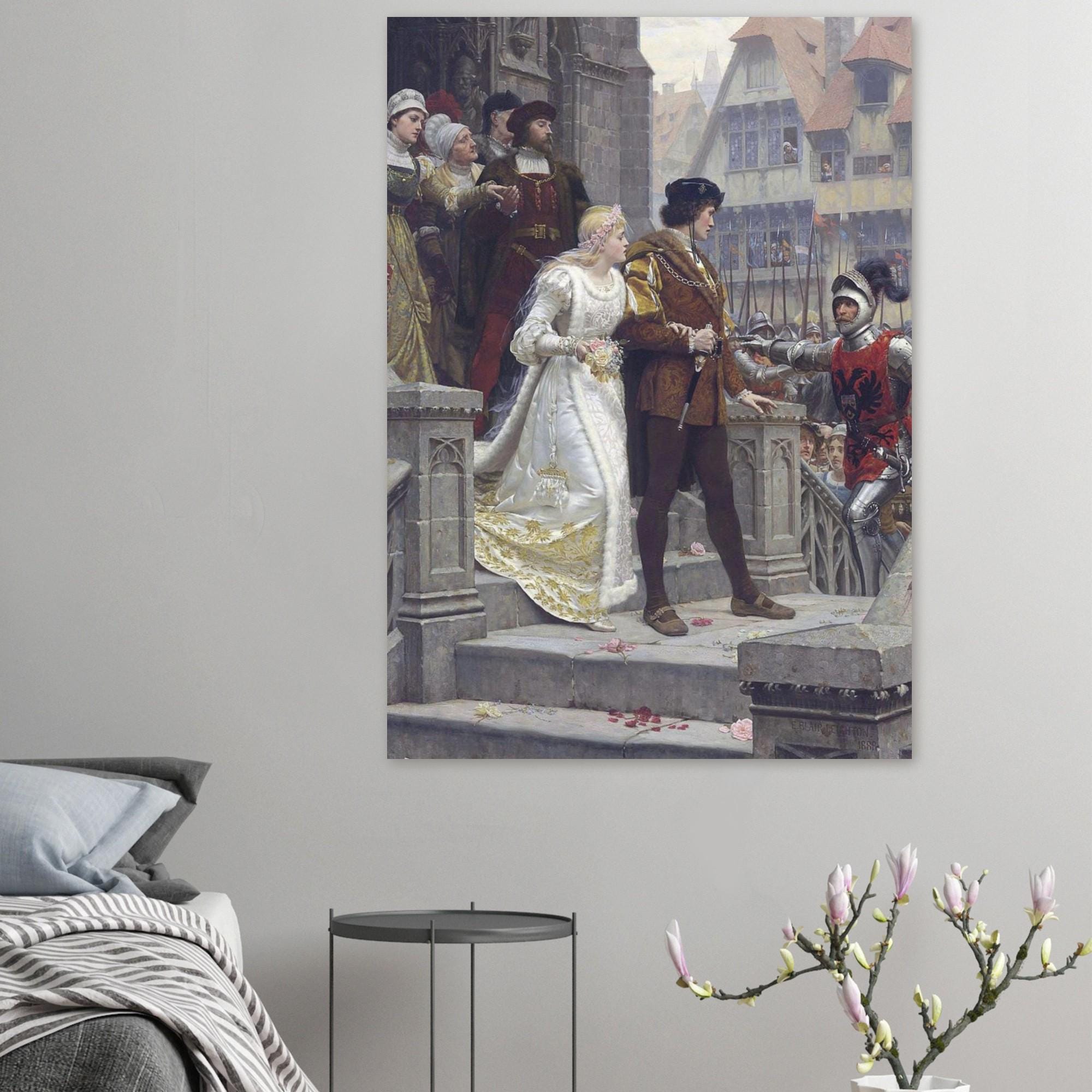 Push past common decor with this captivating E.B. Leighton The Register Canvas Print. This magnificent Victorian painting, known as "The Register," captures a moment of intense drama as a newly wed couple, richly dressed in medieval attire, is confronted by an armored knight upon leaving the church. The piece perfectly embodies the rich storytelling and historical romance of the **Victorian Medieval Revival**. Perfect for lovers of historical fiction, **Dark Academia**, and dramatic narrative art.