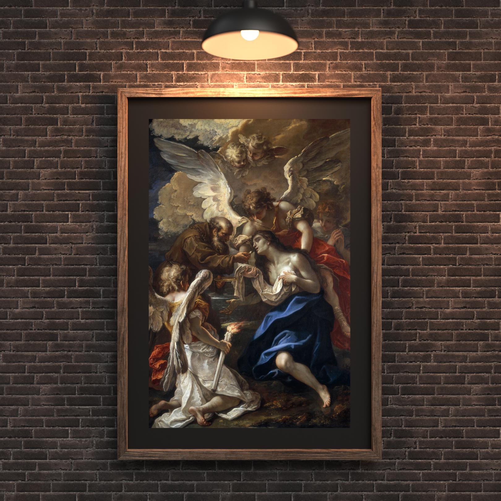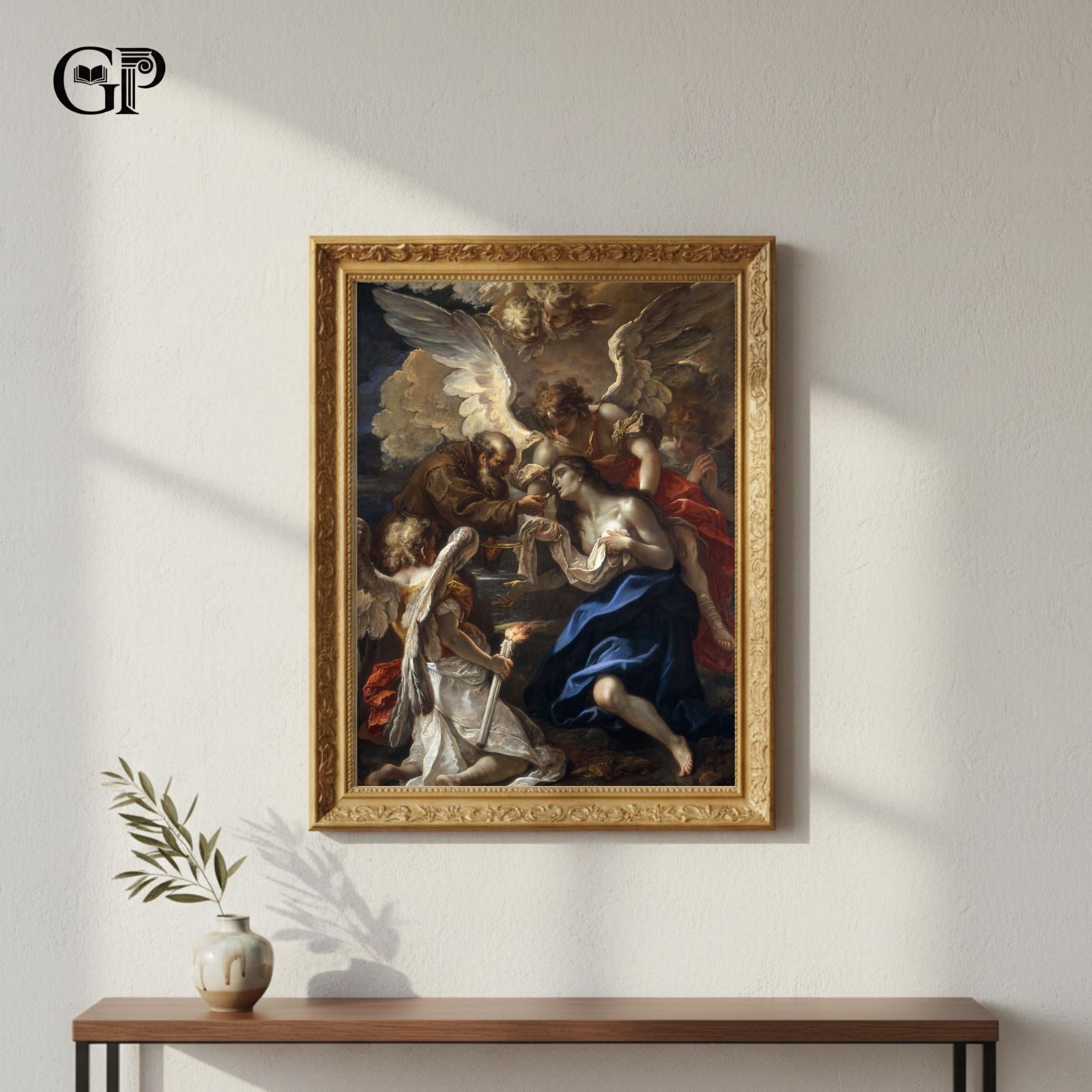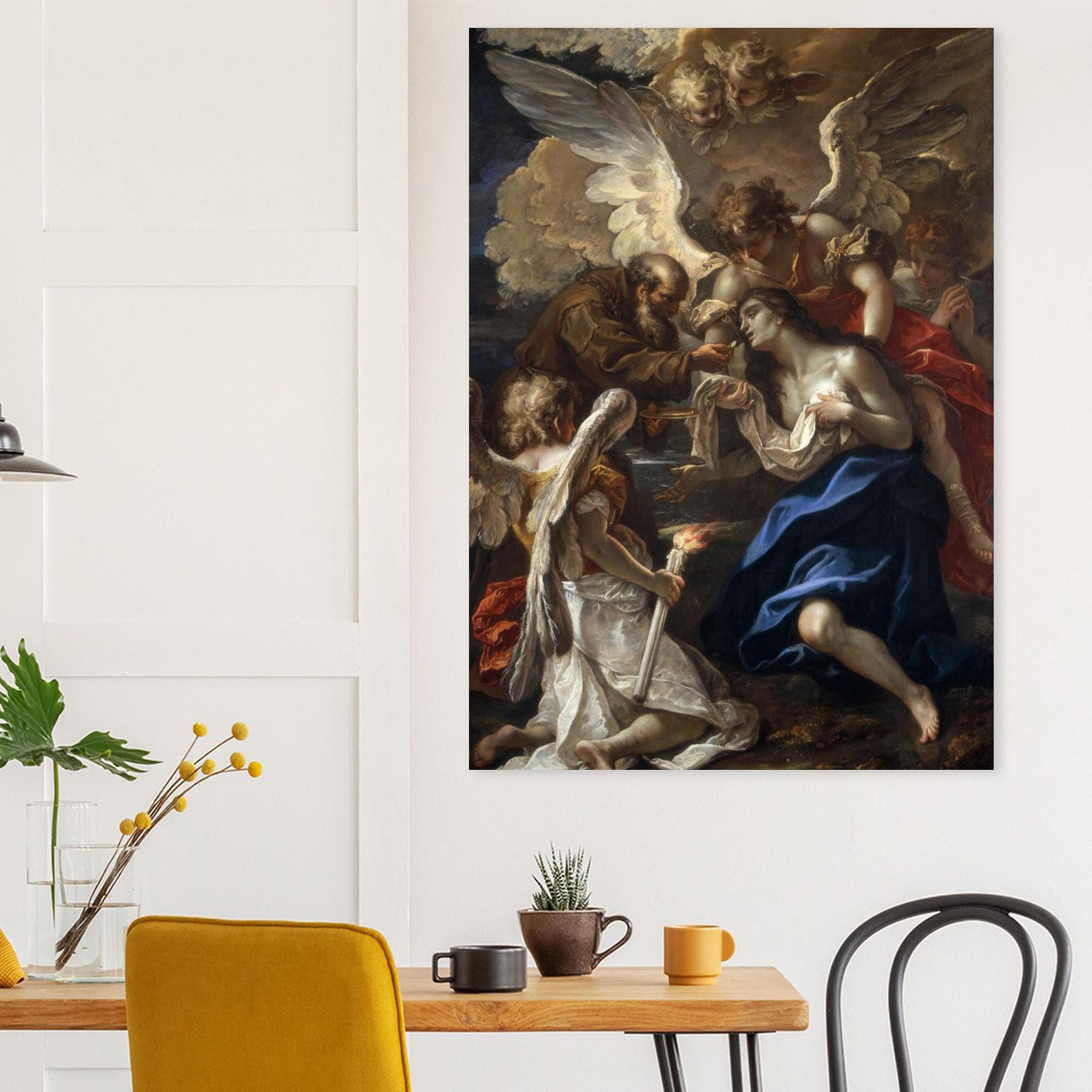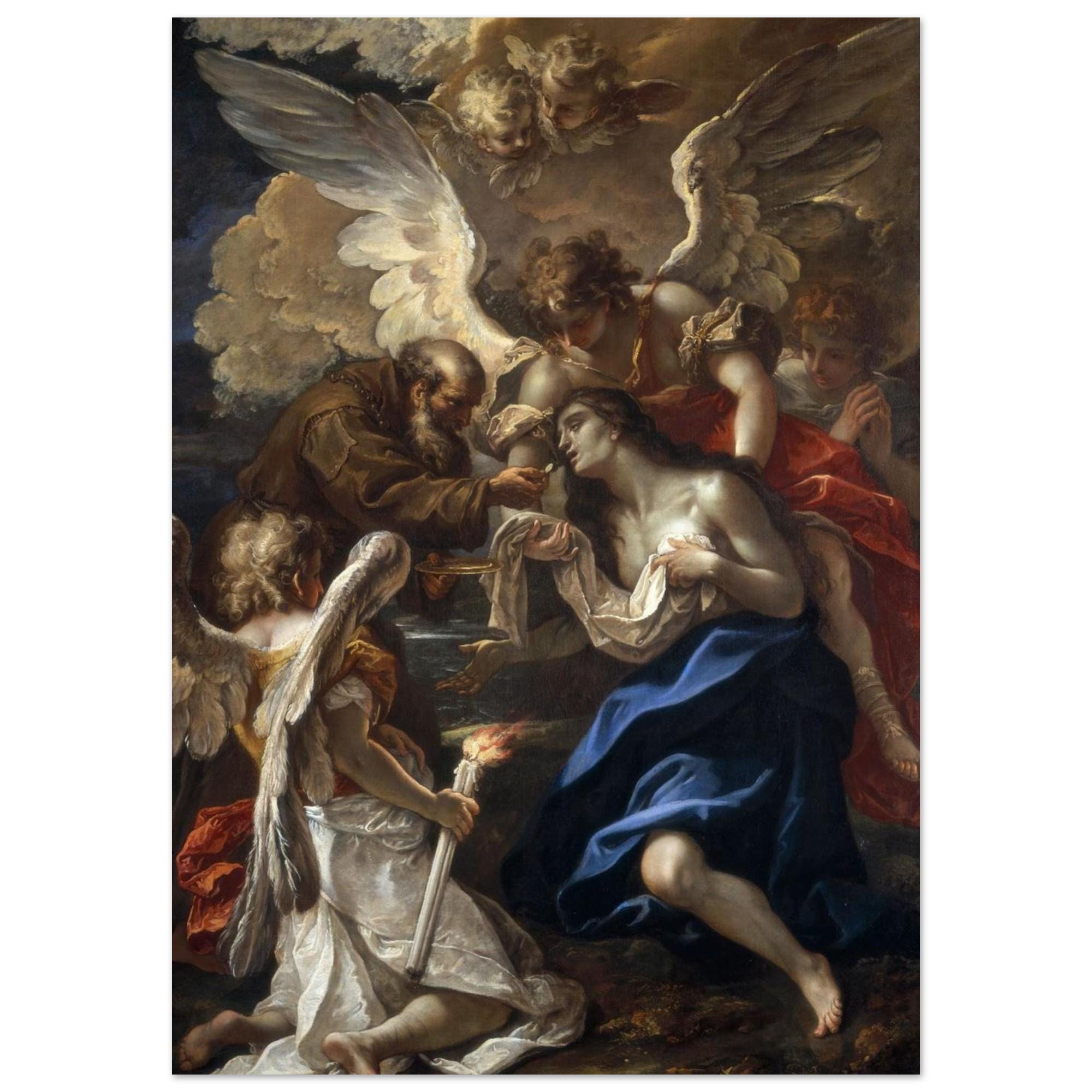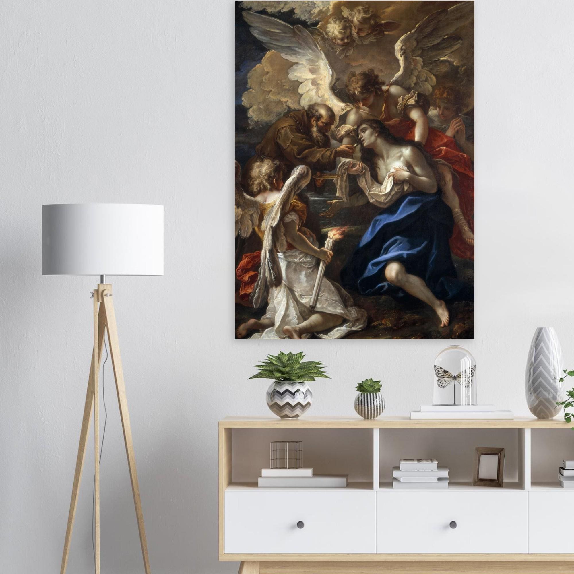 Push past common decor with this captivating Italian Baroque Mary Magdalene Canvas Print. This dramatic painting, evocative of masters like Solimena, captures Saint Mary Magdalene receiving her final communion in a moment of profound spiritual ecstasy, attended by angels and a saint. The composition's intense **Chiaroscuro**, flowing drapery, and emotional depth are quintessential features of the 17th-century **Baroque** style. Perfect for collectors, spiritual art lovers, and those seeking a powerful, museum-quality religious statement piece.