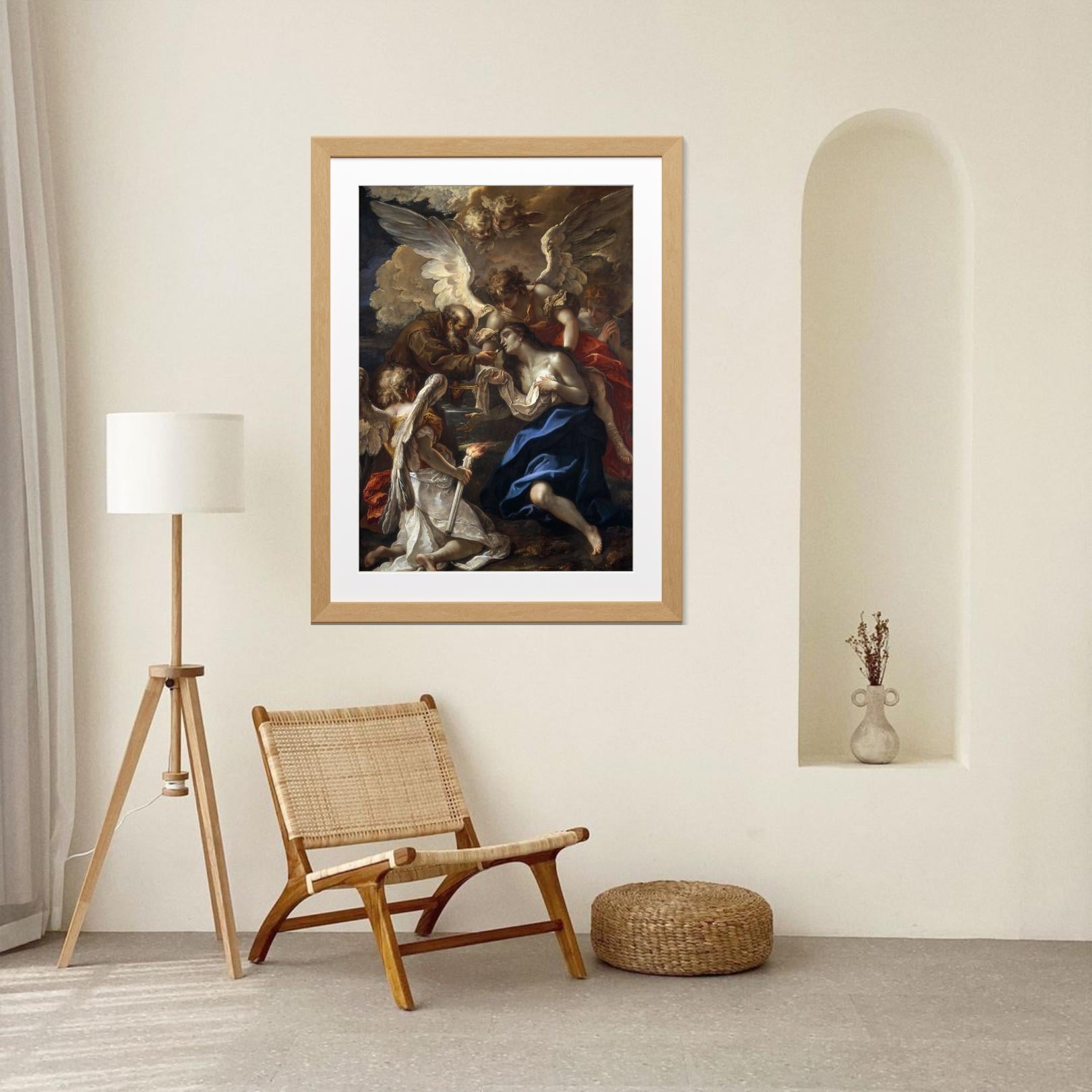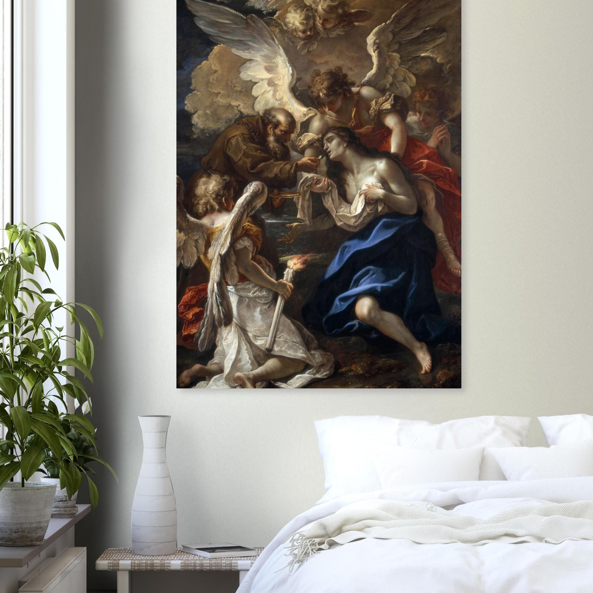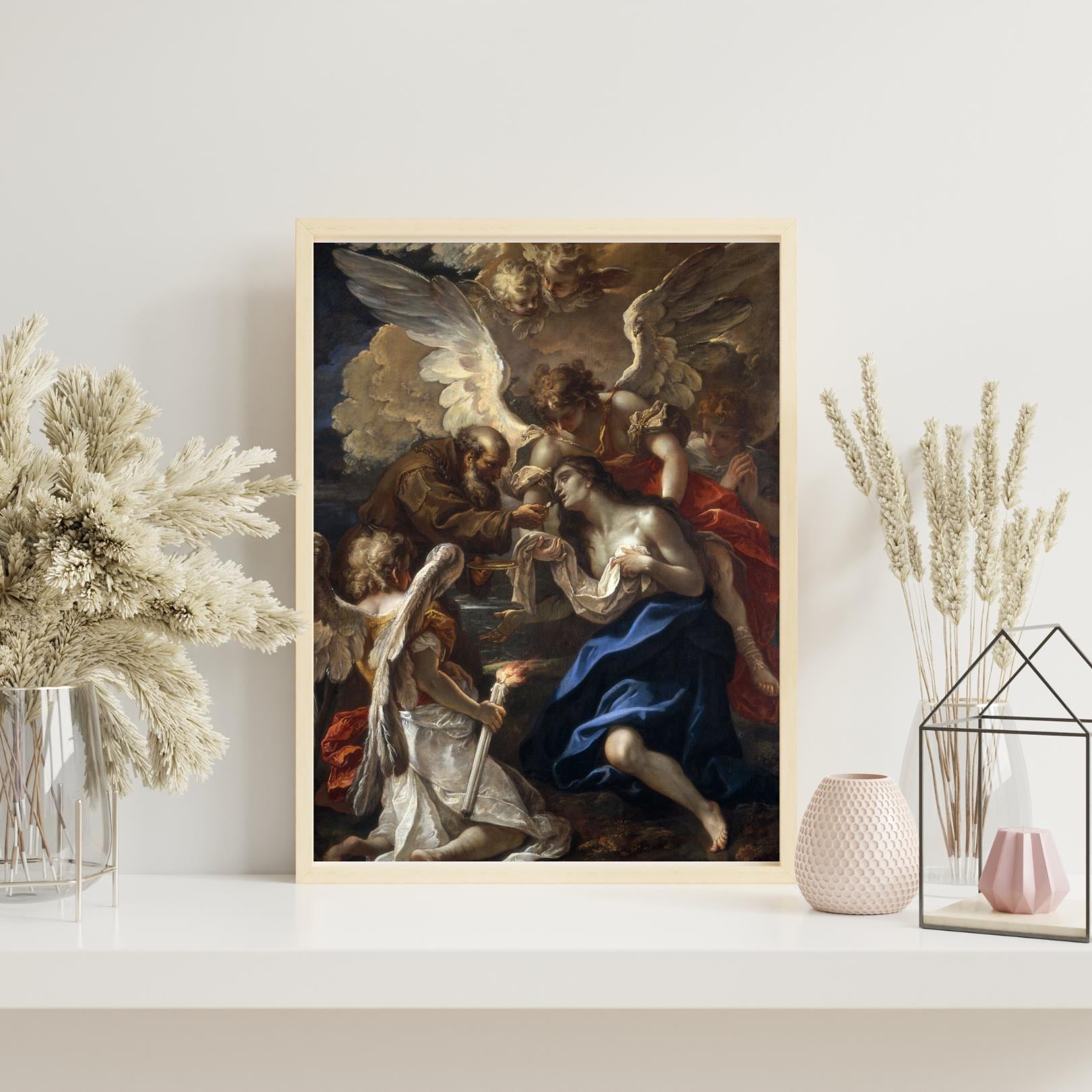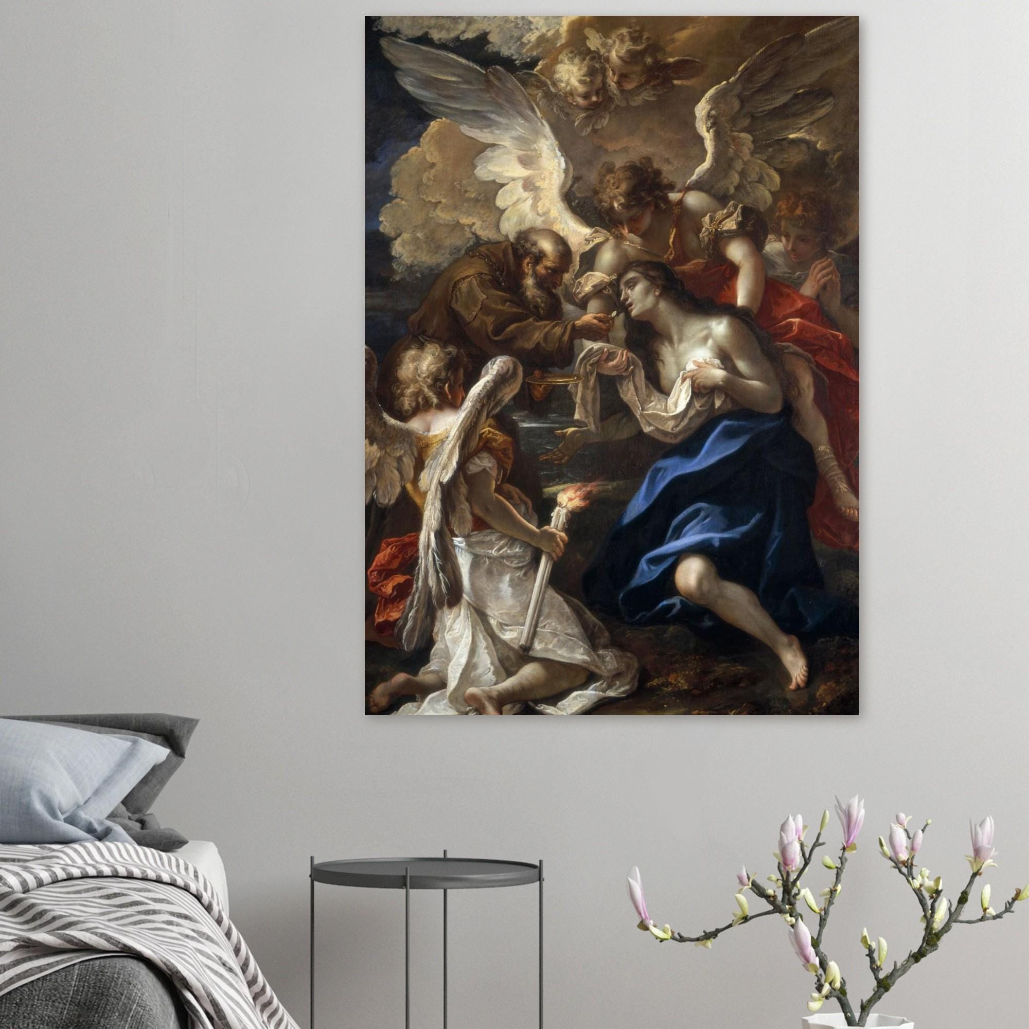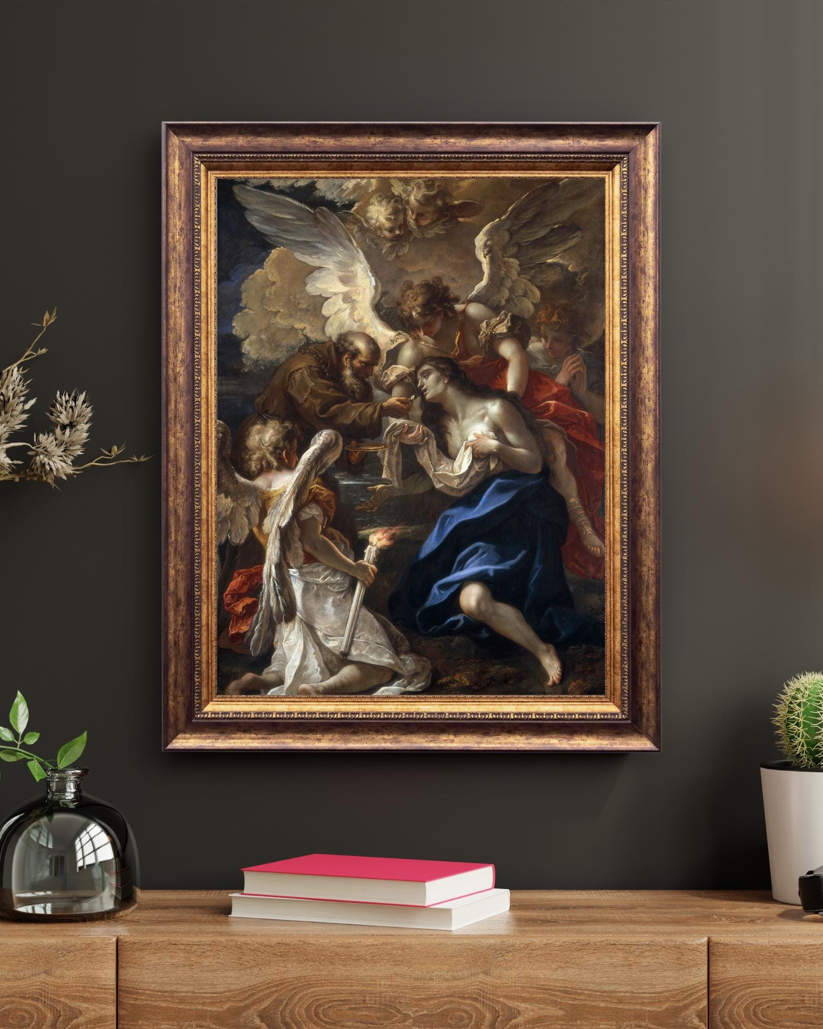 Push past common decor with this captivating Italian Baroque Mary Magdalene Canvas Print. This dramatic painting, evocative of masters like Solimena, captures Saint Mary Magdalene receiving her final communion in a moment of profound spiritual ecstasy, attended by angels and a saint. The composition's intense **Chiaroscuro**, flowing drapery, and emotional depth are quintessential features of the 17th-century **Baroque** style. Perfect for collectors, spiritual art lovers, and those seeking a powerful, museum-quality religious statement piece.