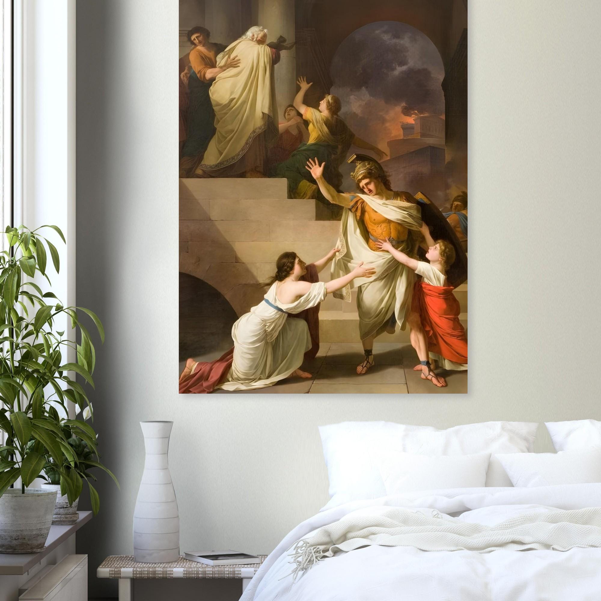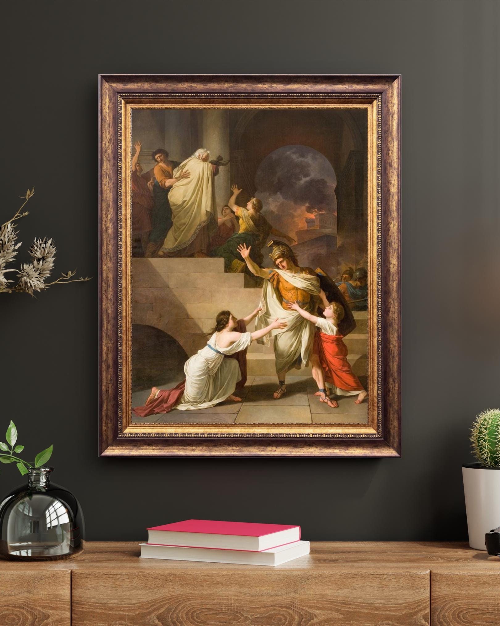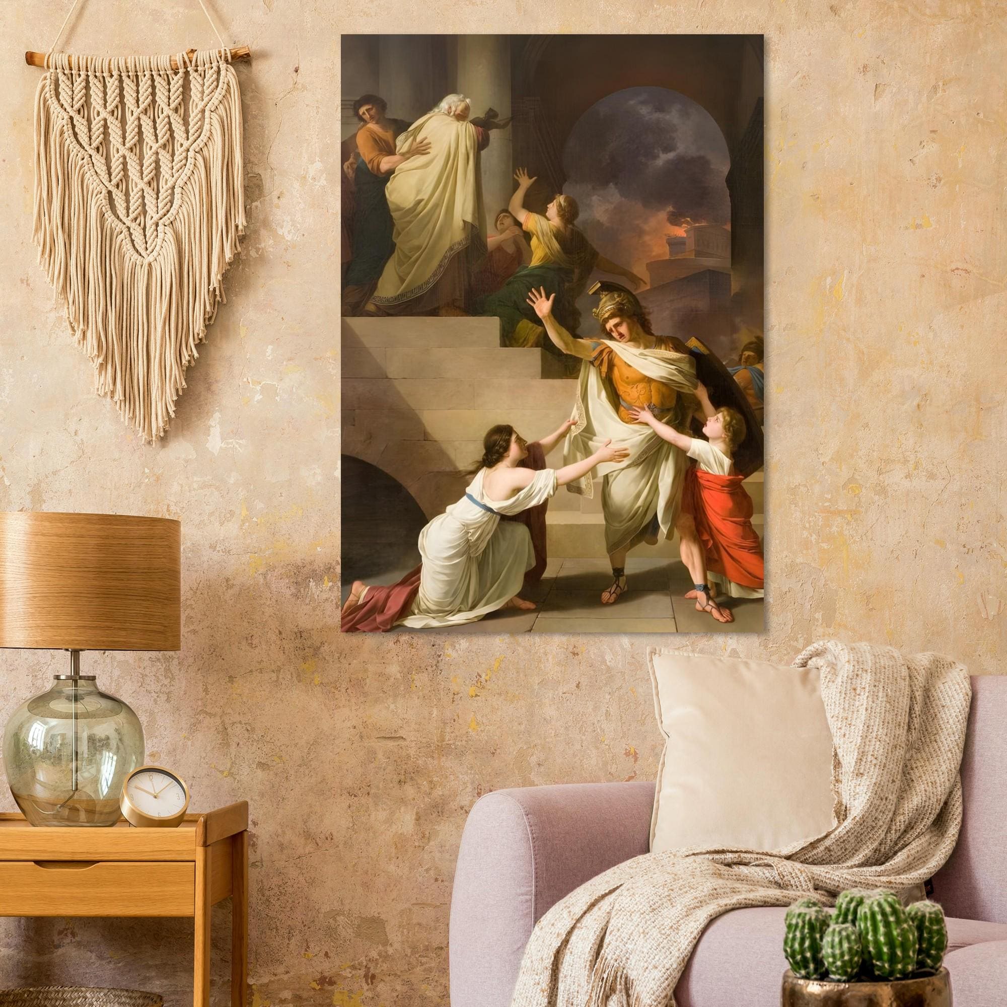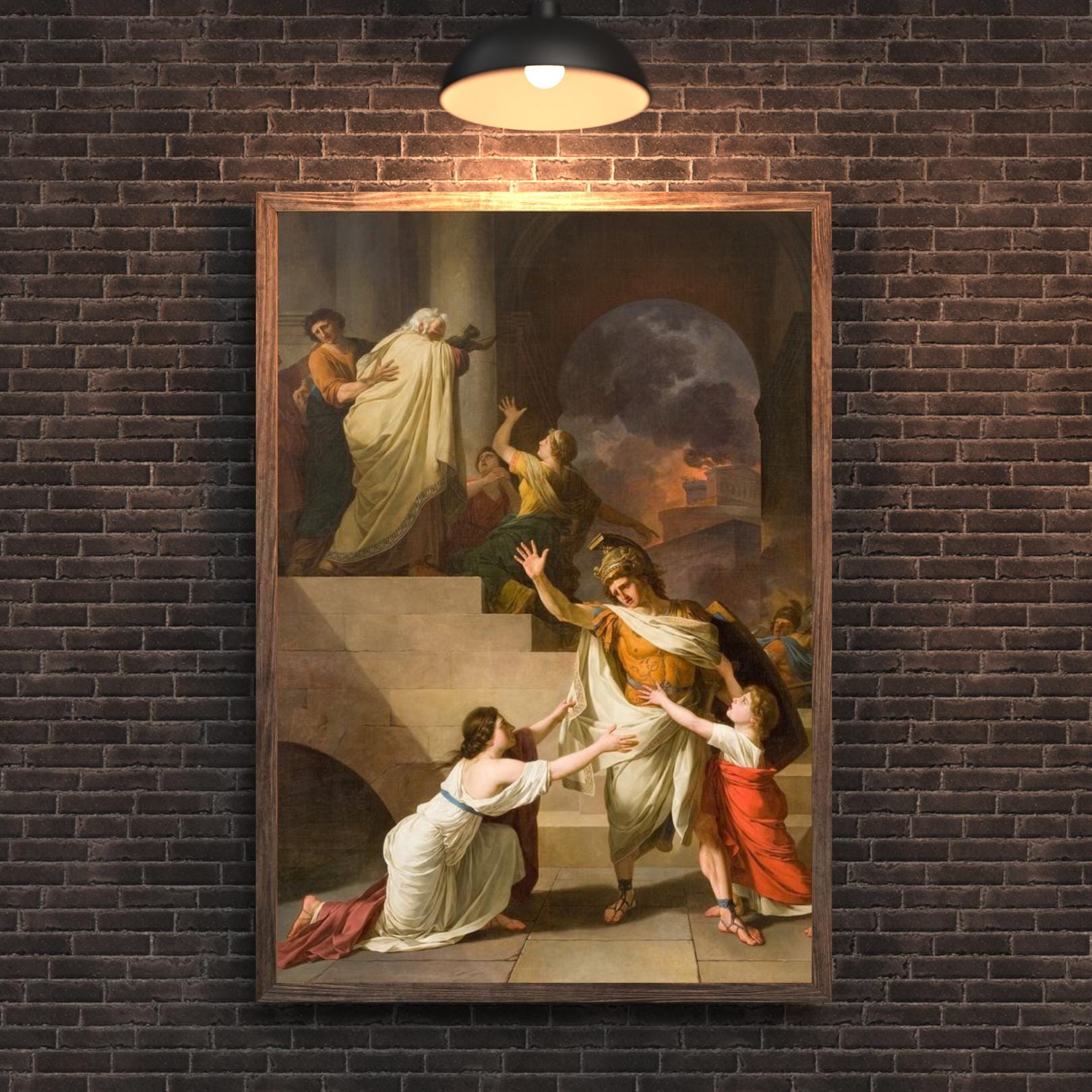 Push past common decor with this captivating Neoclassical Heroic Scene Canvas Print. This work reflects the emotional and architecturally strong style of French Neoclassical masters like **Jacques-Louis David** and **Pierre-Narcisse Guérin**. The dramatic farewell or rescue scene of an ancient hero (perhaps Aeneas or Pyrrhus) and his family is emphasized by a burning city (perhaps Troy) in the background. The powerful figures and lighting bring the heroism and tragic emotionalism of the **Neoclassical** era right into your home.