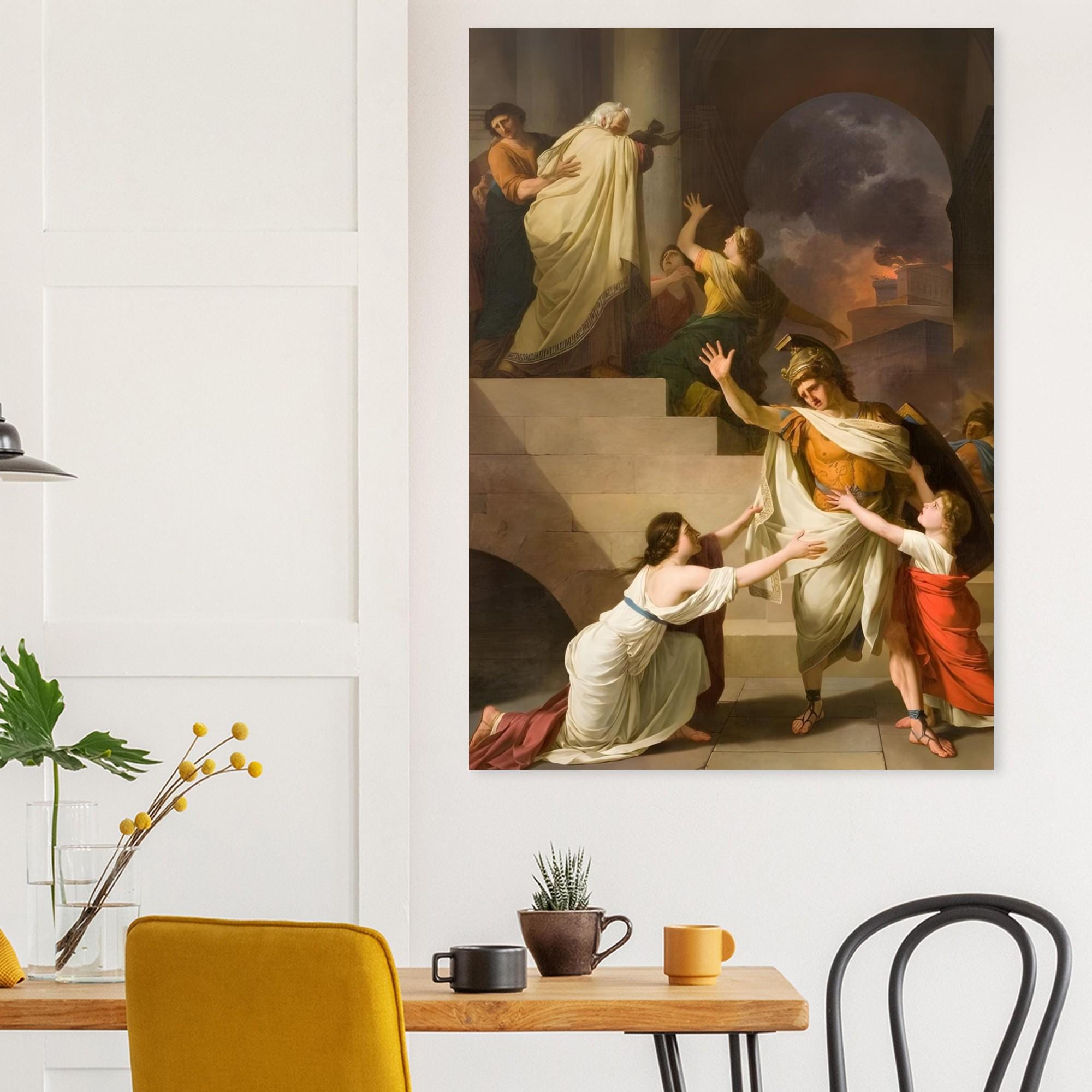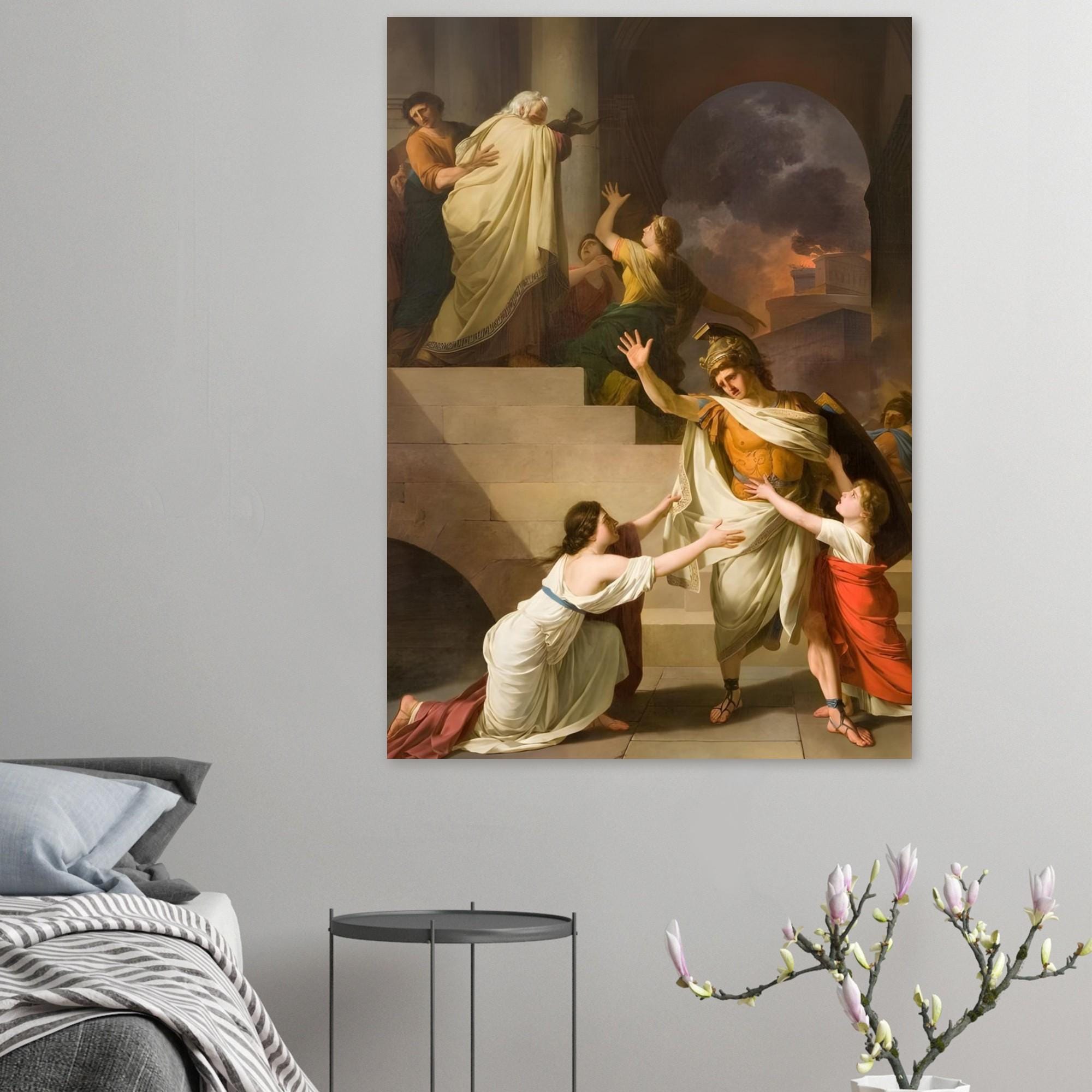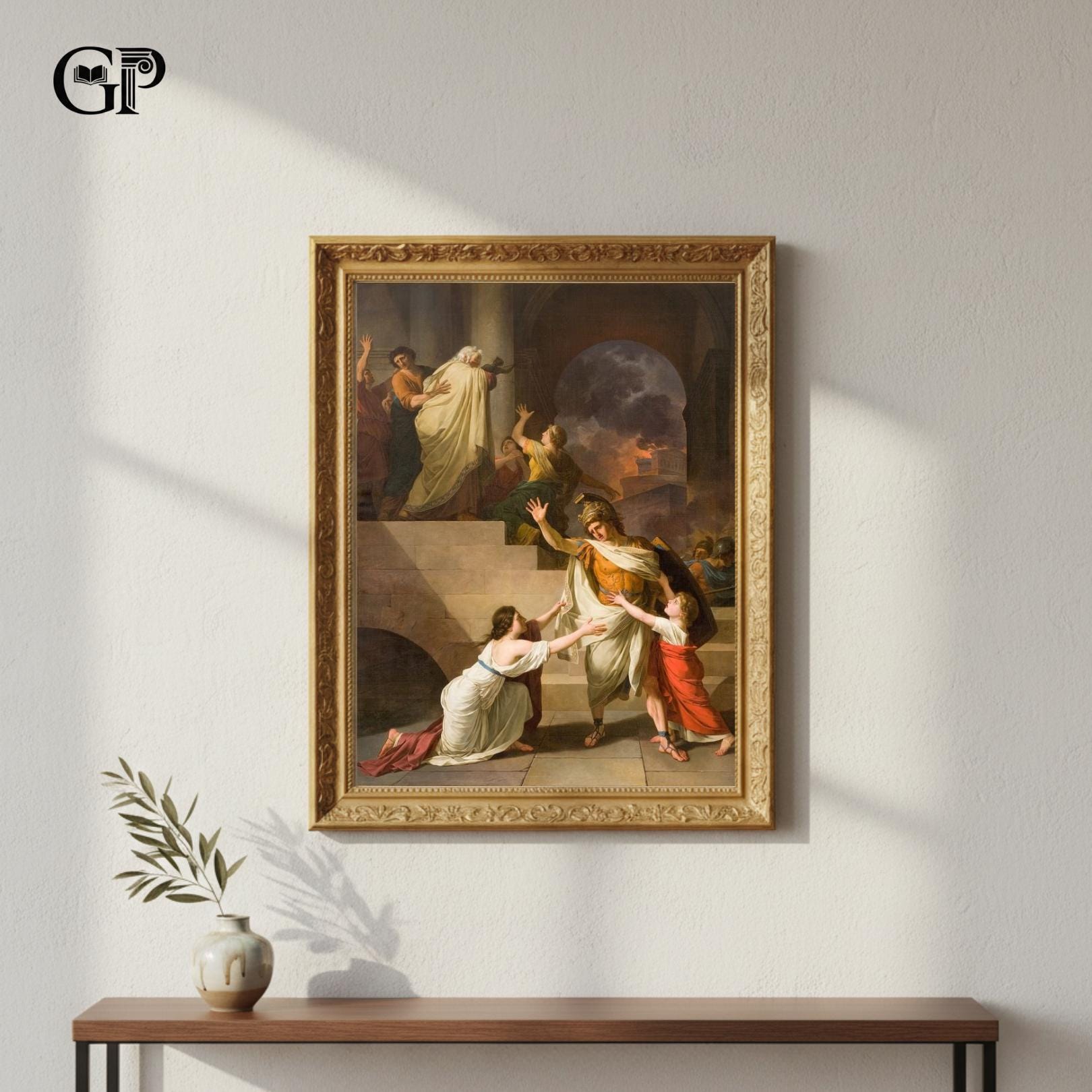 Push past common decor with this captivating Neoclassical Heroic Scene Canvas Print. This work reflects the emotional and architecturally strong style of French Neoclassical masters like **Jacques-Louis David** and **Pierre-Narcisse Guérin**. The dramatic farewell or rescue scene of an ancient hero (perhaps Aeneas or Pyrrhus) and his family is emphasized by a burning city (perhaps Troy) in the background. The powerful figures and lighting bring the heroism and tragic emotionalism of the **Neoclassical** era right into your home.