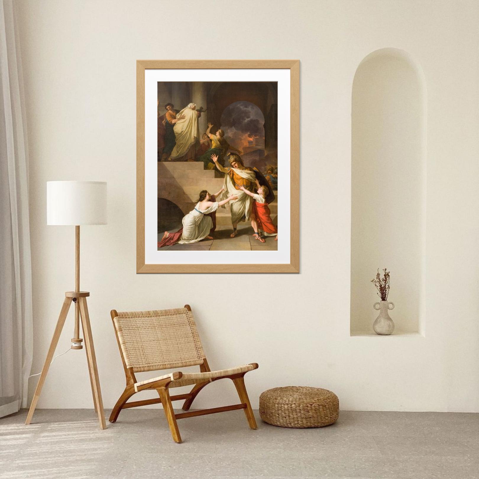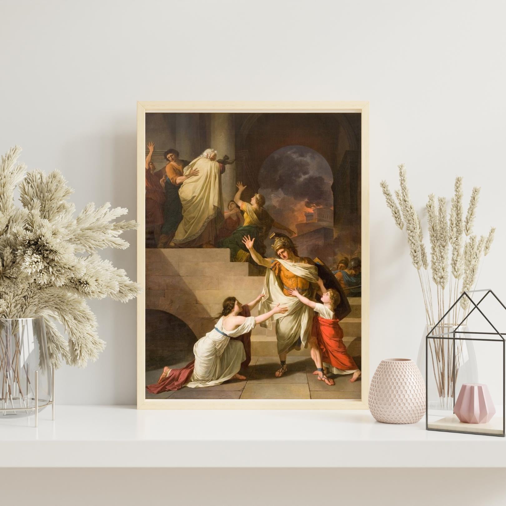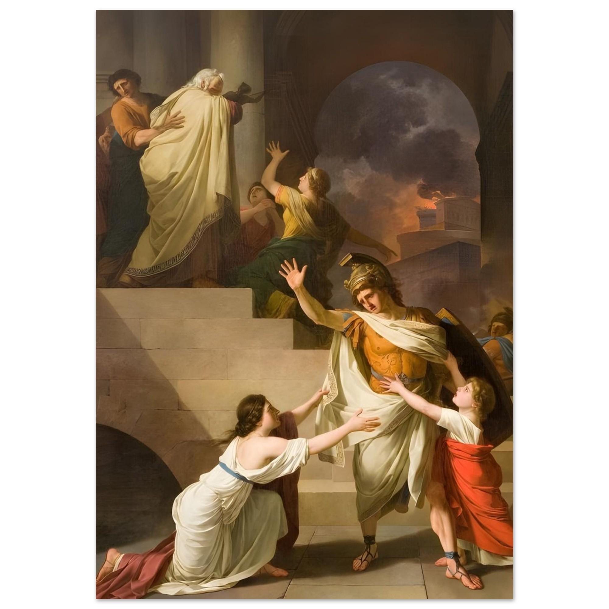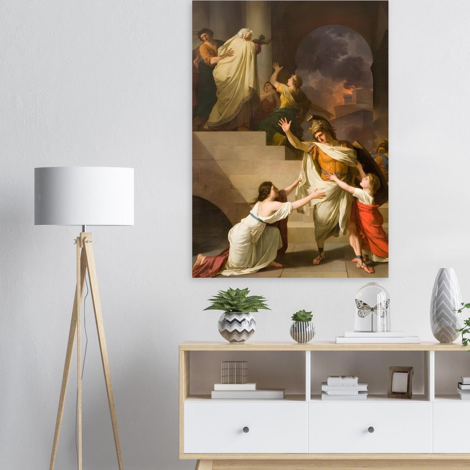 Push past common decor with this captivating Neoclassical Heroic Scene Canvas Print. This work reflects the emotional and architecturally strong style of French Neoclassical masters like **Jacques-Louis David** and **Pierre-Narcisse Guérin**. The dramatic farewell or rescue scene of an ancient hero (perhaps Aeneas or Pyrrhus) and his family is emphasized by a burning city (perhaps Troy) in the background. The powerful figures and lighting bring the heroism and tragic emotionalism of the **Neoclassical** era right into your home.