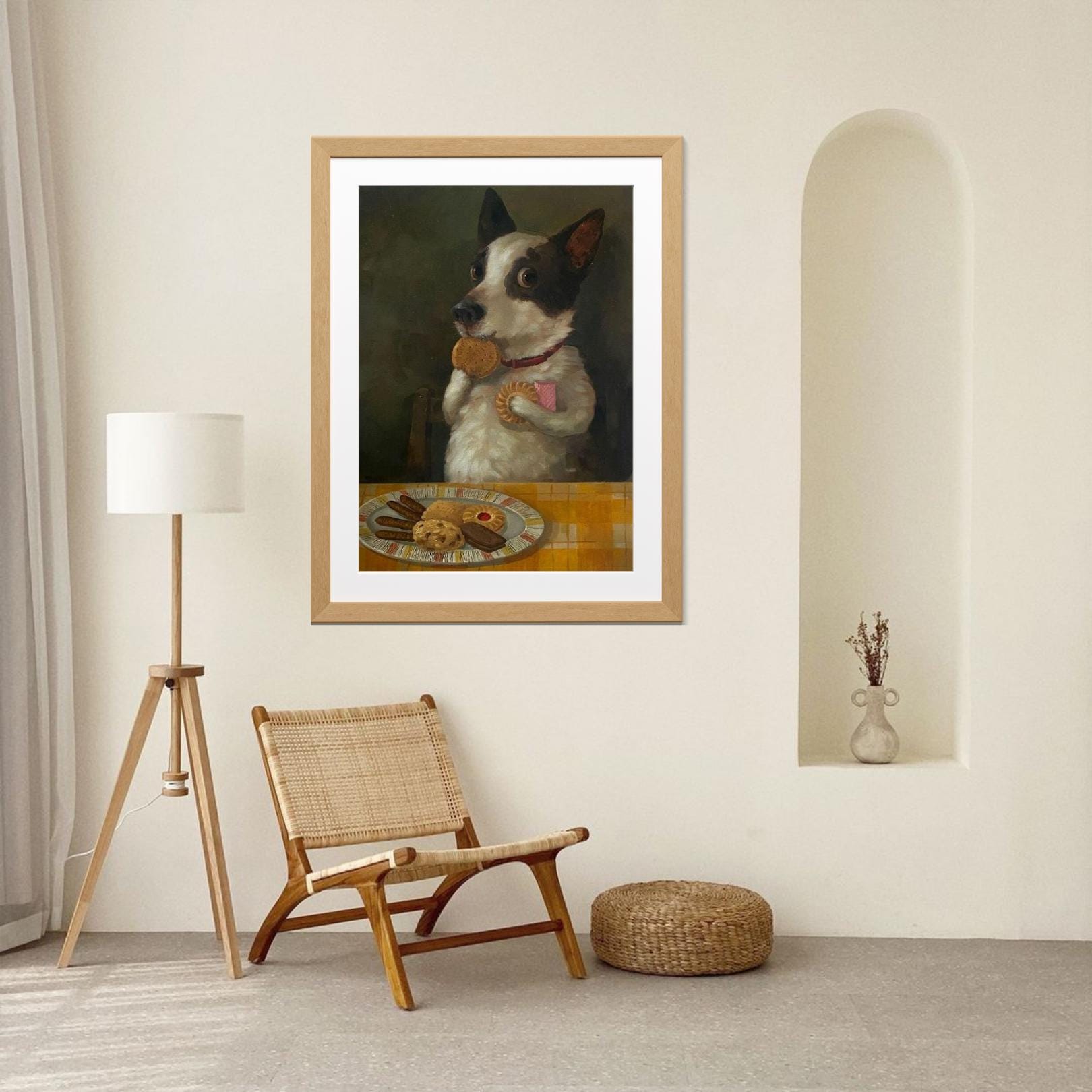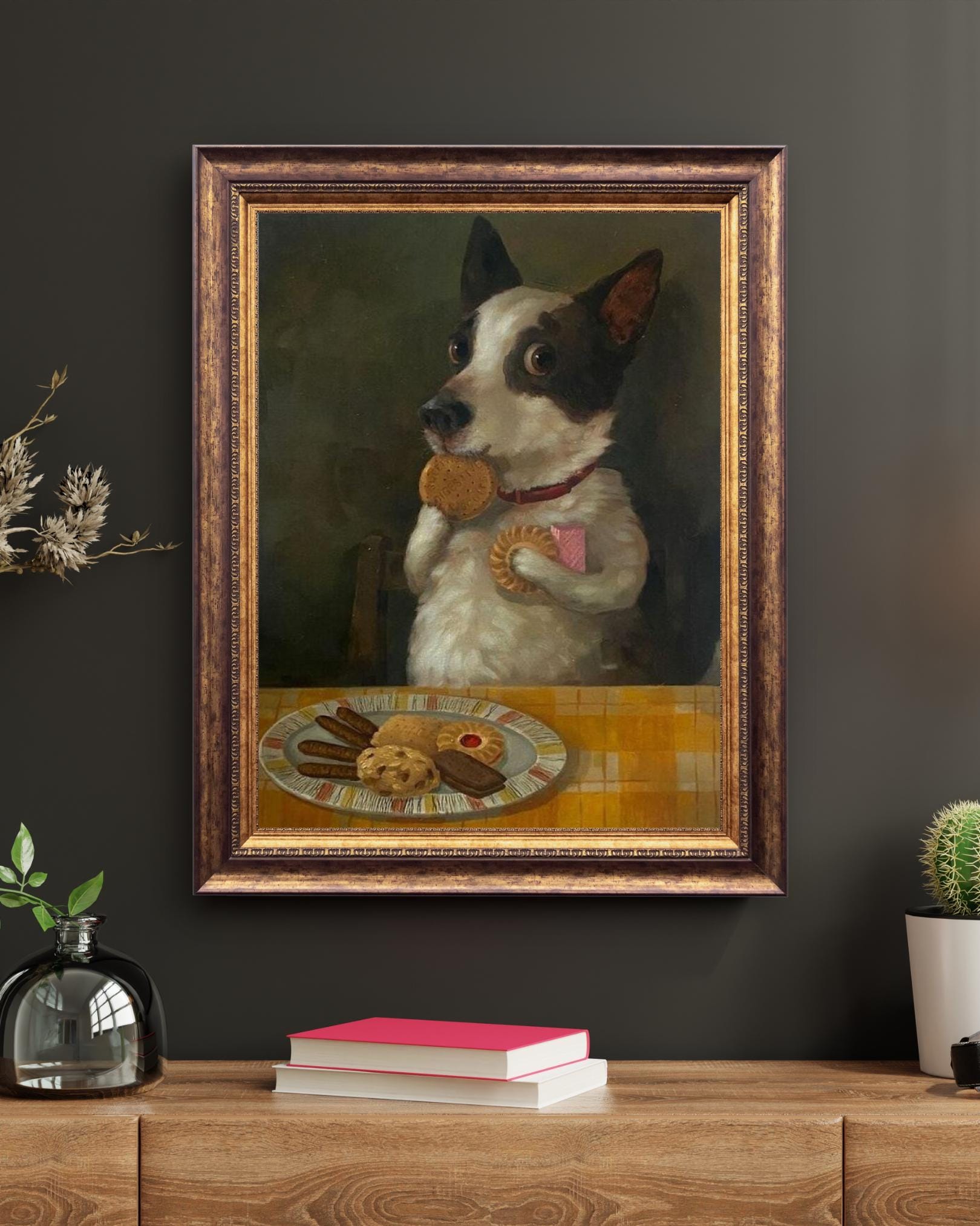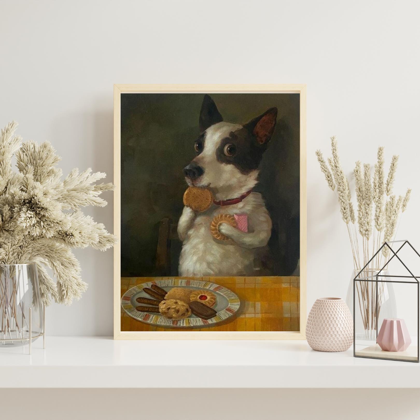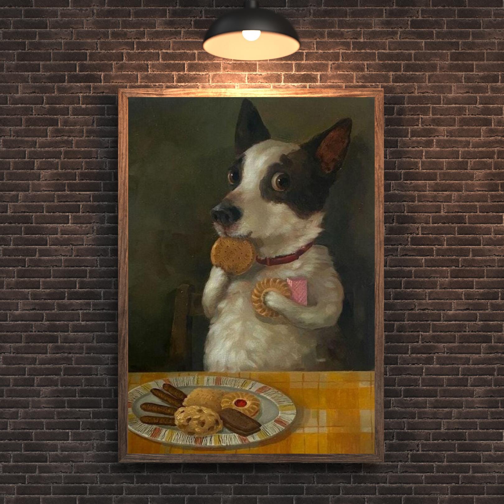 Funny Dog Stealing Biscuits Oil Painting | Humorous Canine Animal Art | Vintage Kitchen Retro Food Decor | Mailed Print
