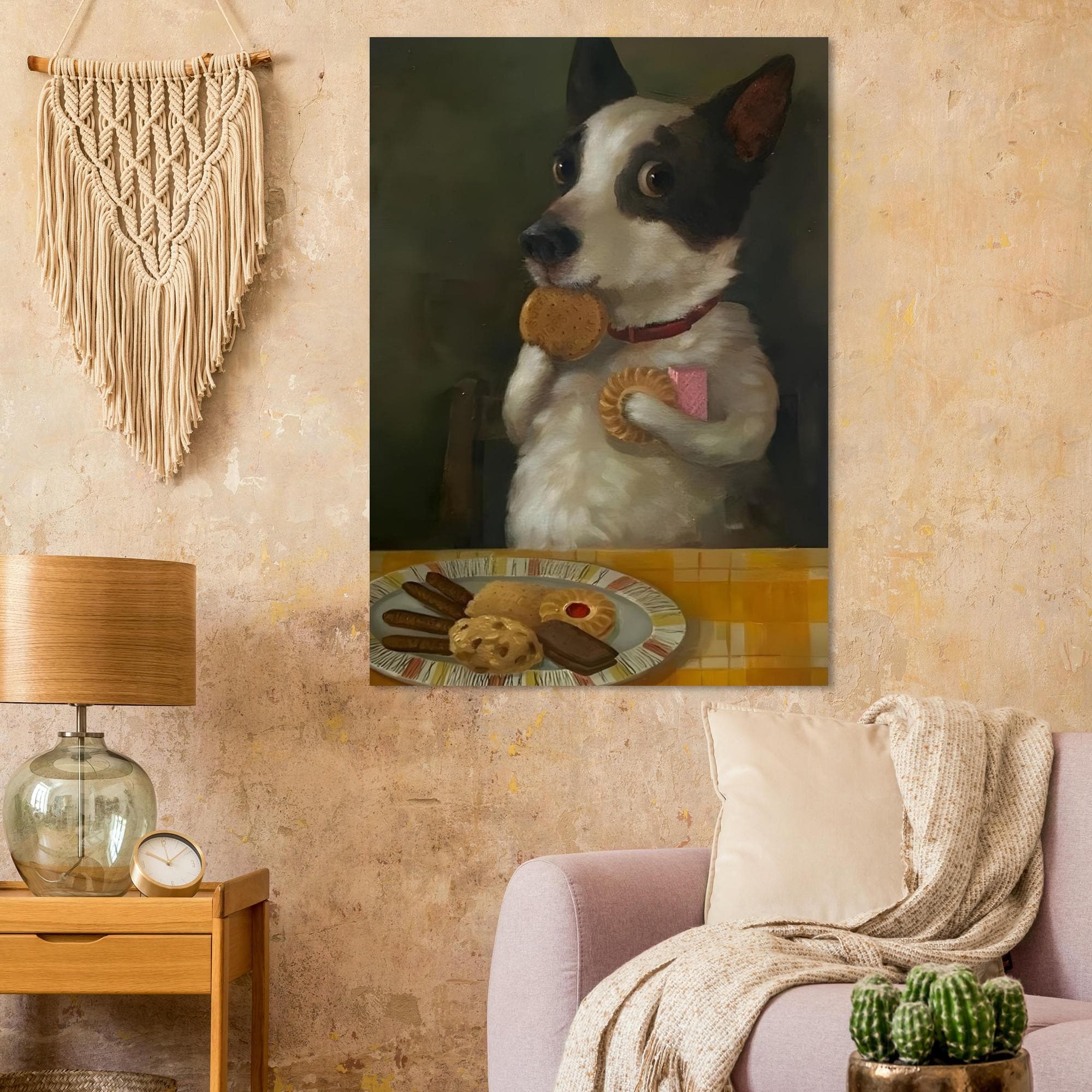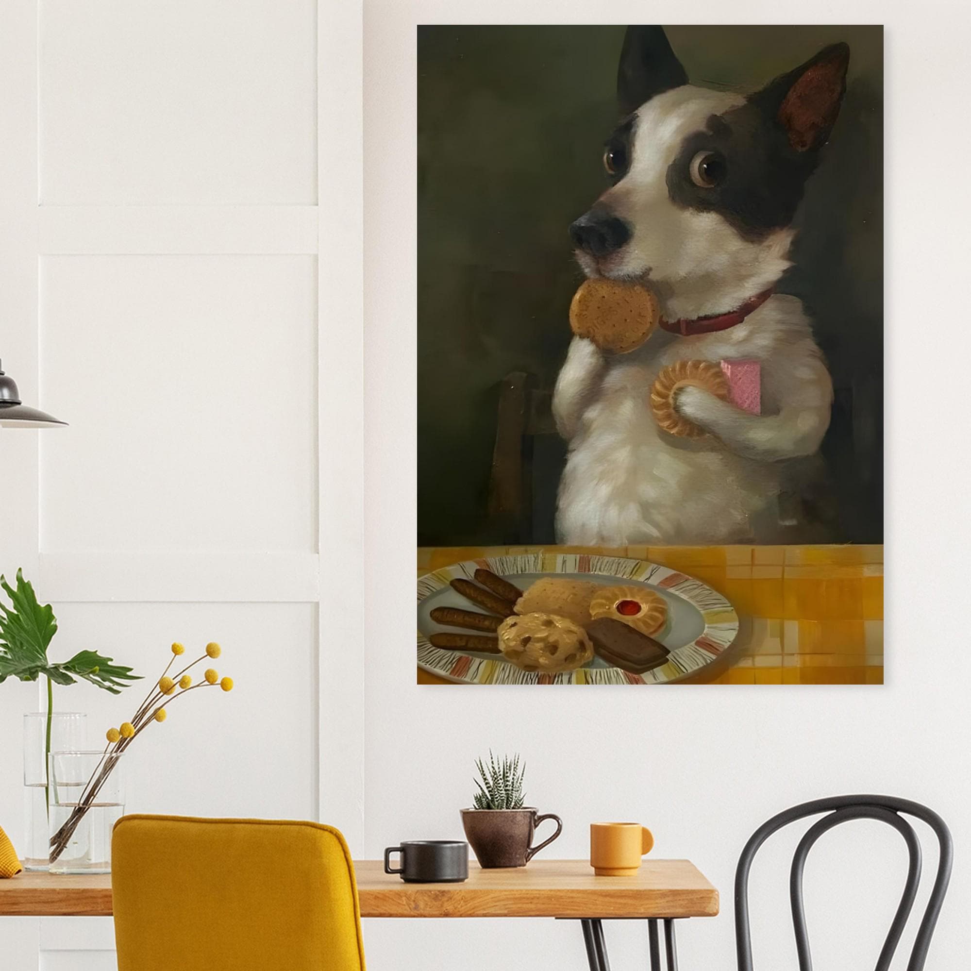 Push past common decor with this captivating **Funny Dog Stealing Biscuits Canvas Print**, capturing a moment of pure, guilt-ridden joy. This high-quality print features a dog caught in the act of sneaking a cookie, executed with the realistic detail of a classical oil painting but infused with modern humor. It’s perfect for dog lovers, bakers, and anyone looking to inject a touch of quirky, **Retro** charm into their kitchen or living space.