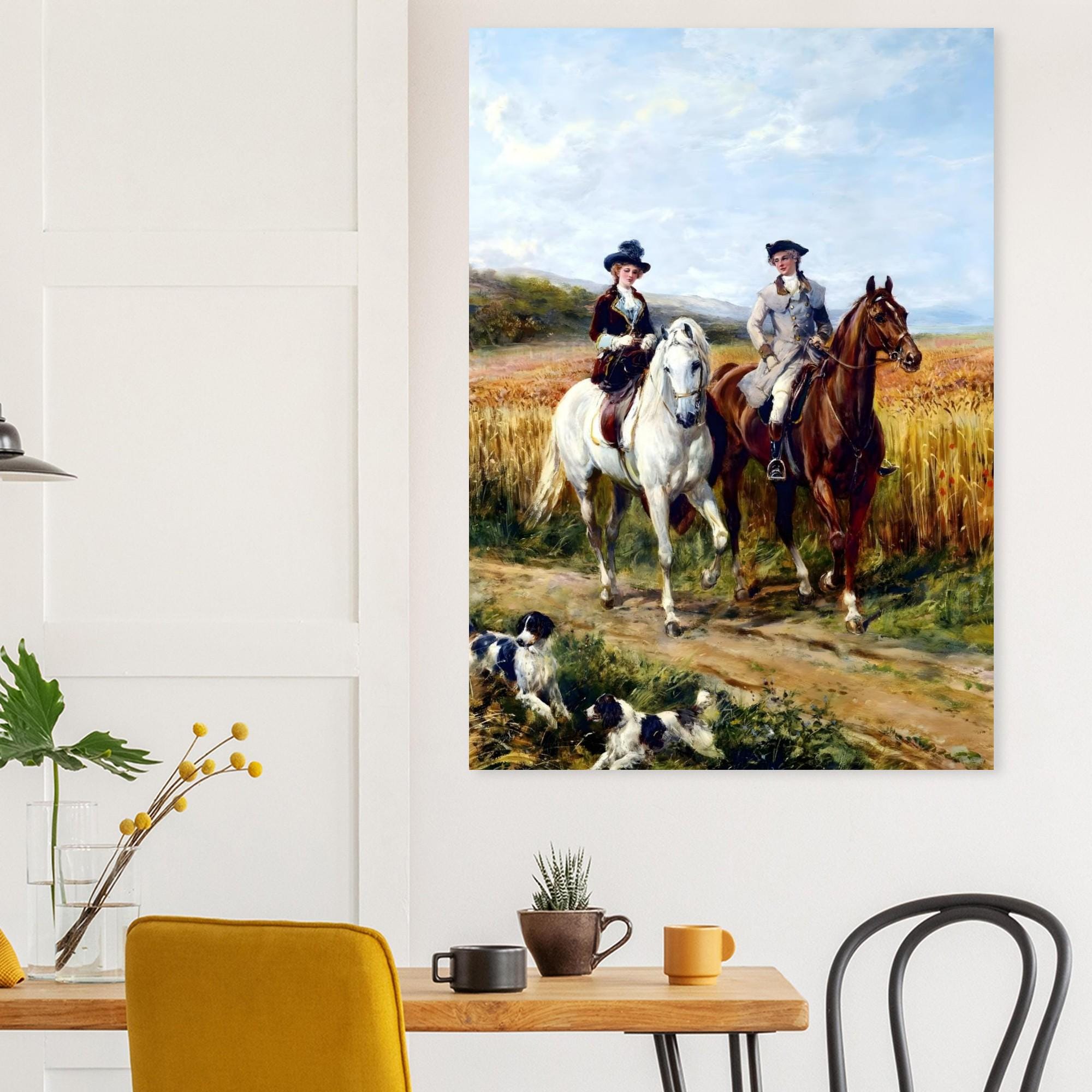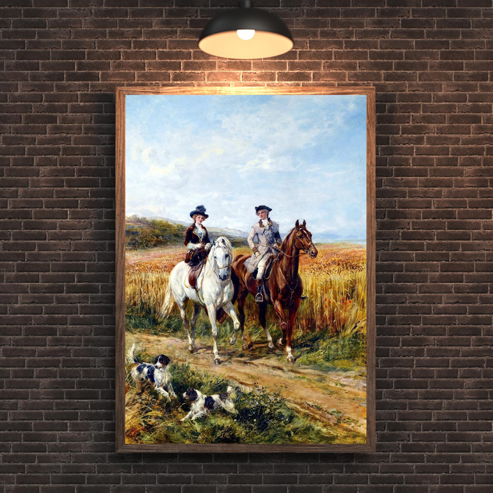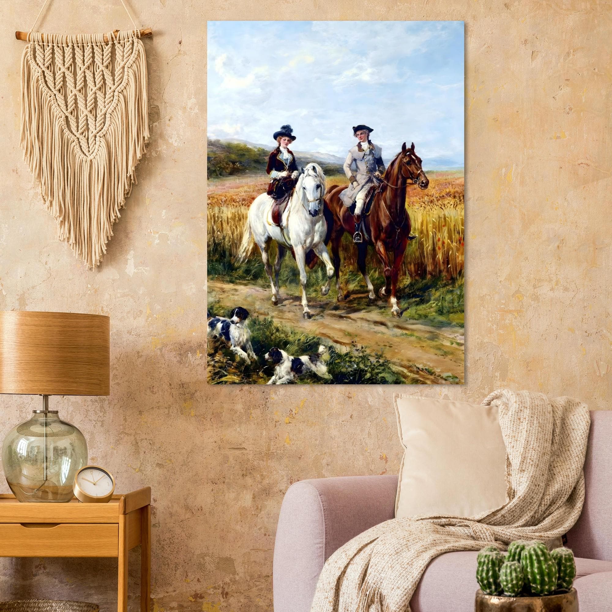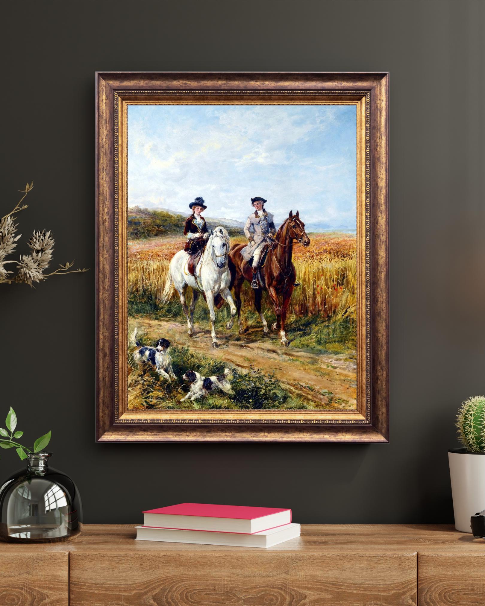 Push past common decor with this captivating **Antique Equestrian Couple and Hunting Dogs Canvas Print**, capturing the timeless beauty of the hunt and countryside elegance. This high-detail print features a historically dressed man and woman riding their magnificent horses through a field, closely followed by their energetic hunting dogs. As a piece of **Equestrian Sporting Art**, it is perfect for those who cherish horses, dogs, and a traditional, rustic aesthetic.