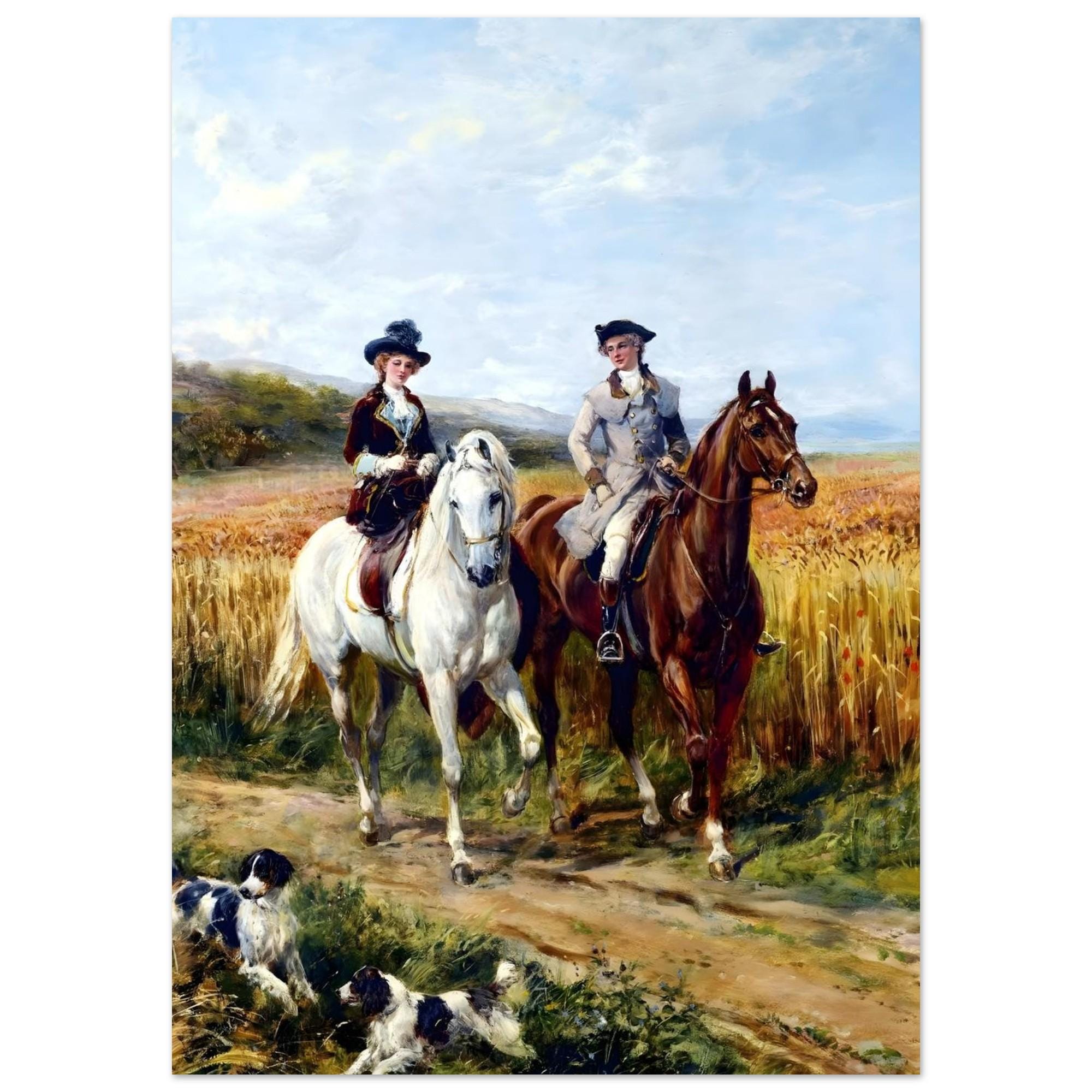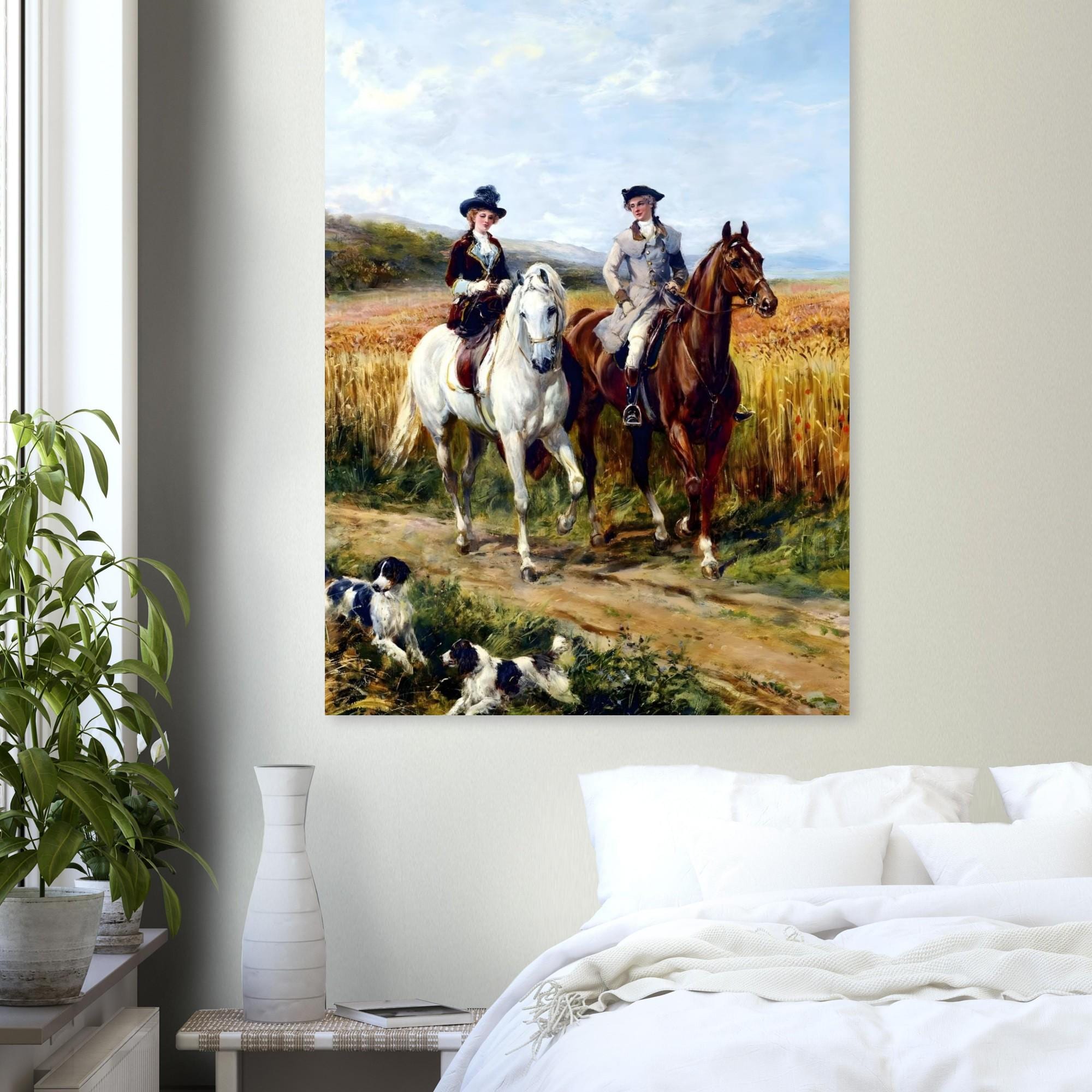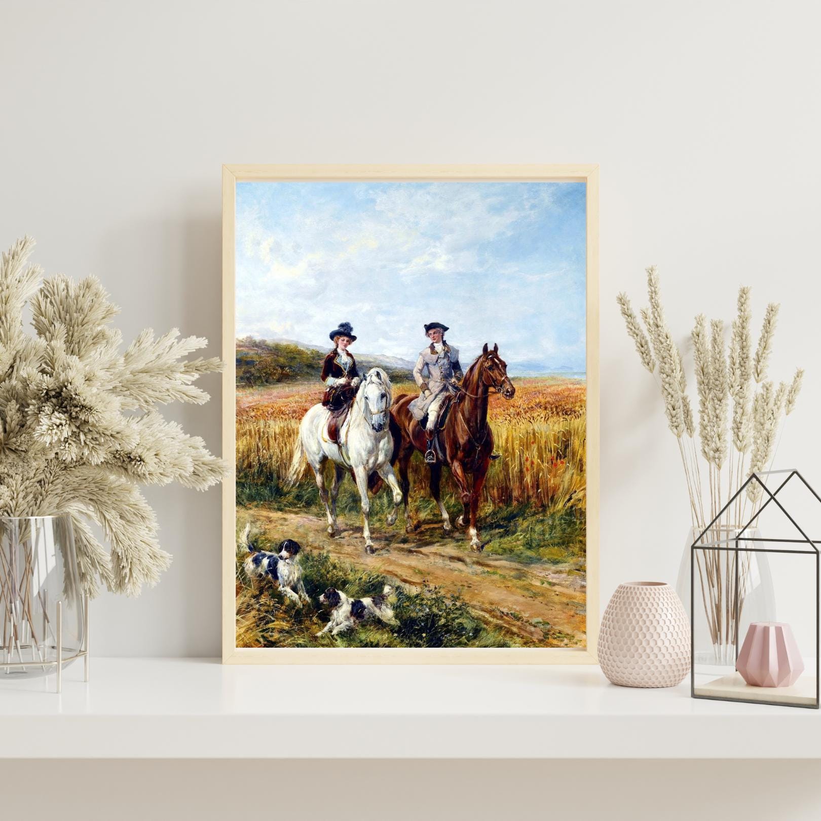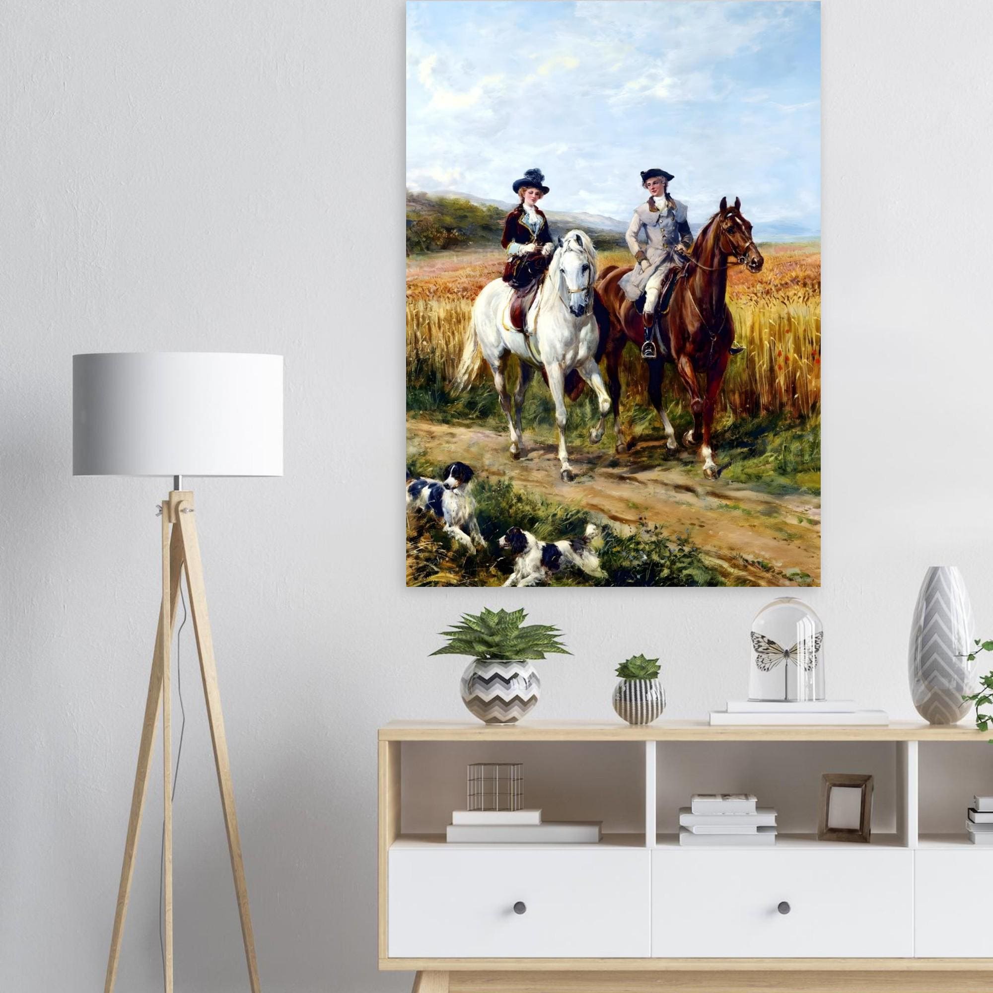 Push past common decor with this captivating **Antique Equestrian Couple and Hunting Dogs Canvas Print**, capturing the timeless beauty of the hunt and countryside elegance. This high-detail print features a historically dressed man and woman riding their magnificent horses through a field, closely followed by their energetic hunting dogs. As a piece of **Equestrian Sporting Art**, it is perfect for those who cherish horses, dogs, and a traditional, rustic aesthetic.
