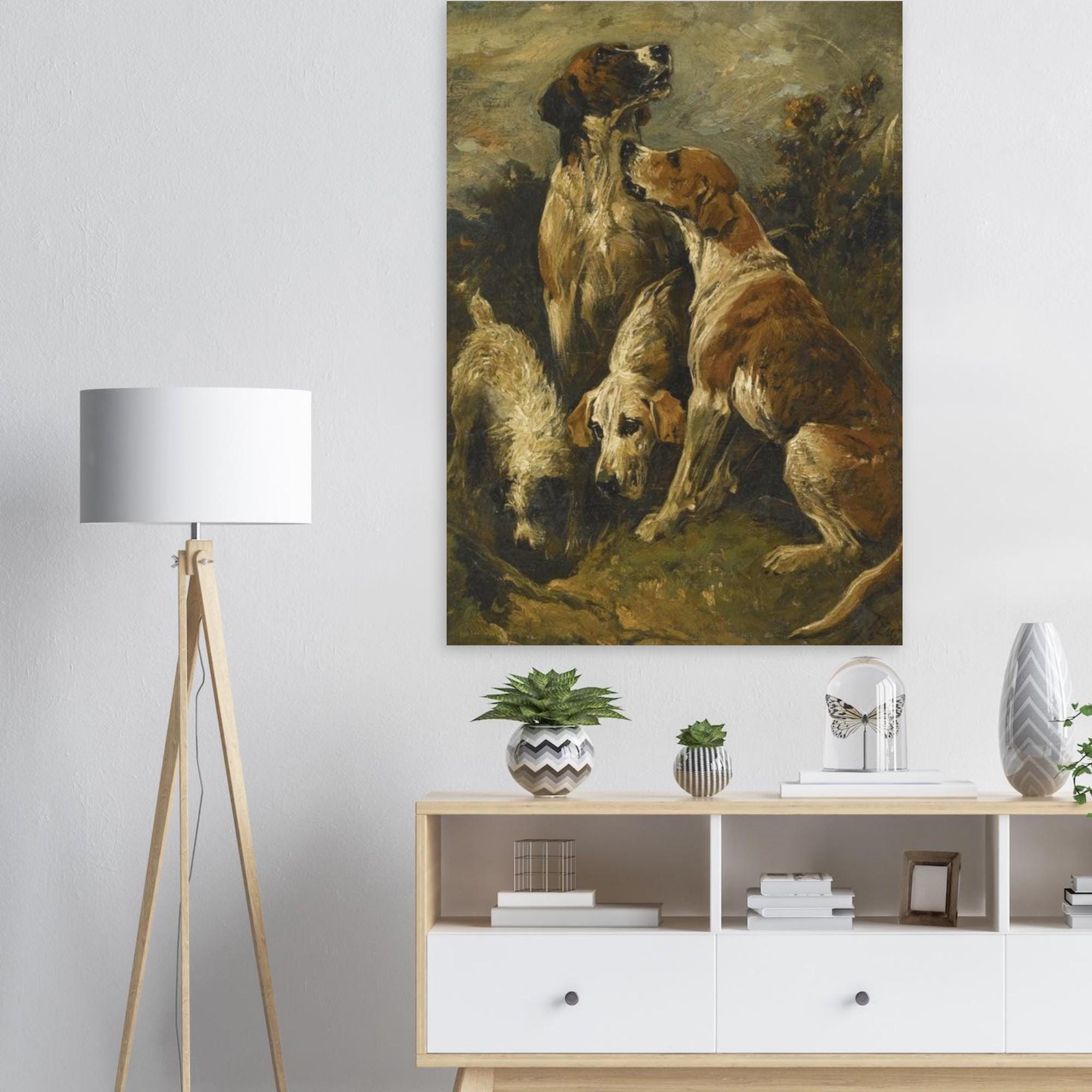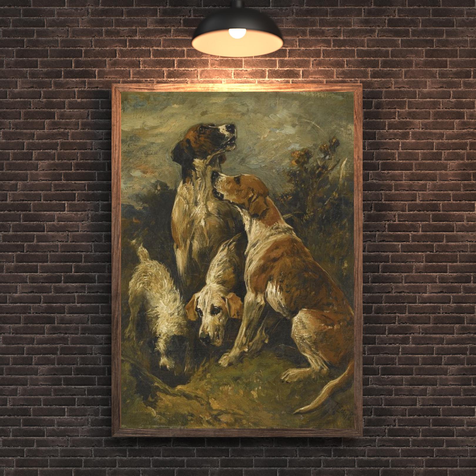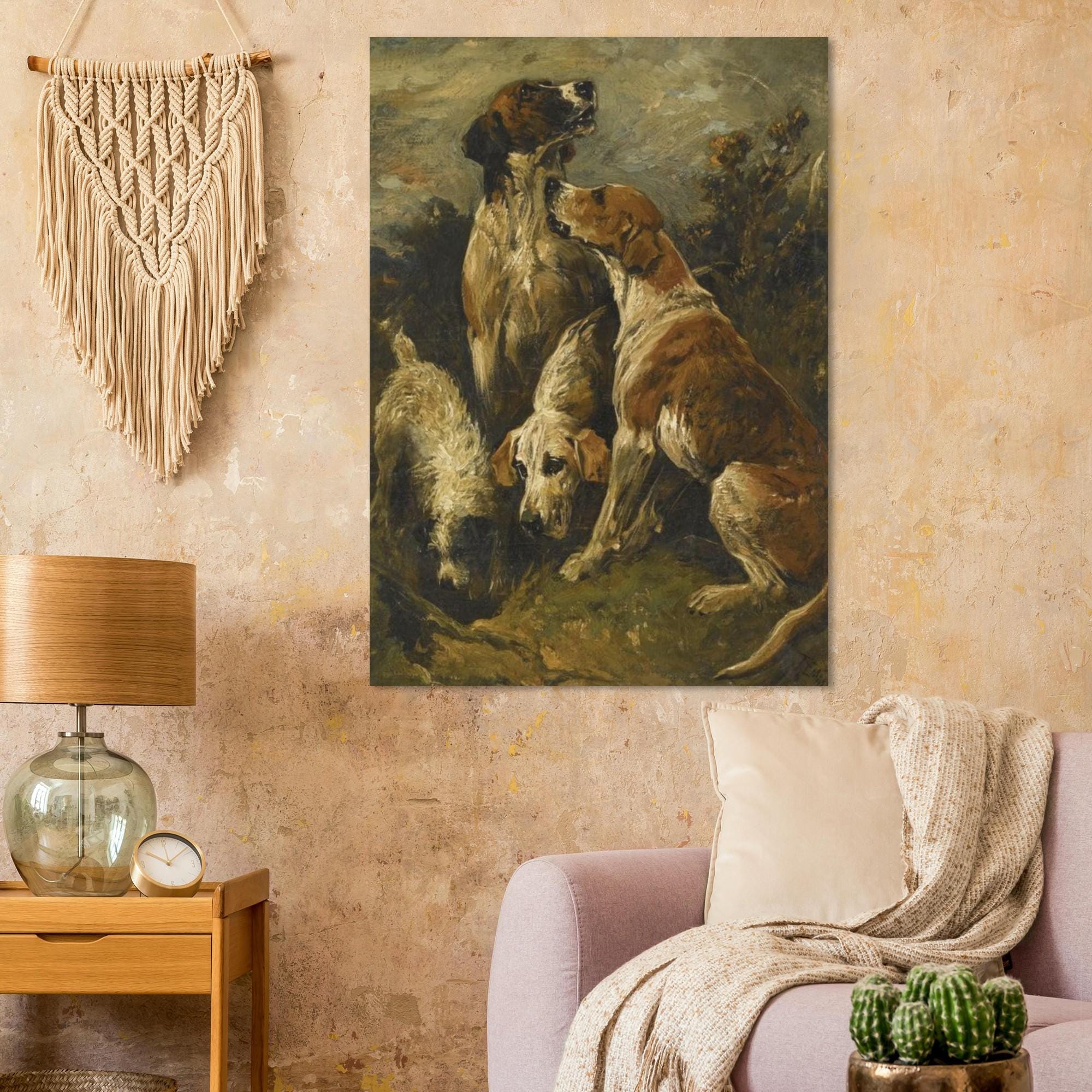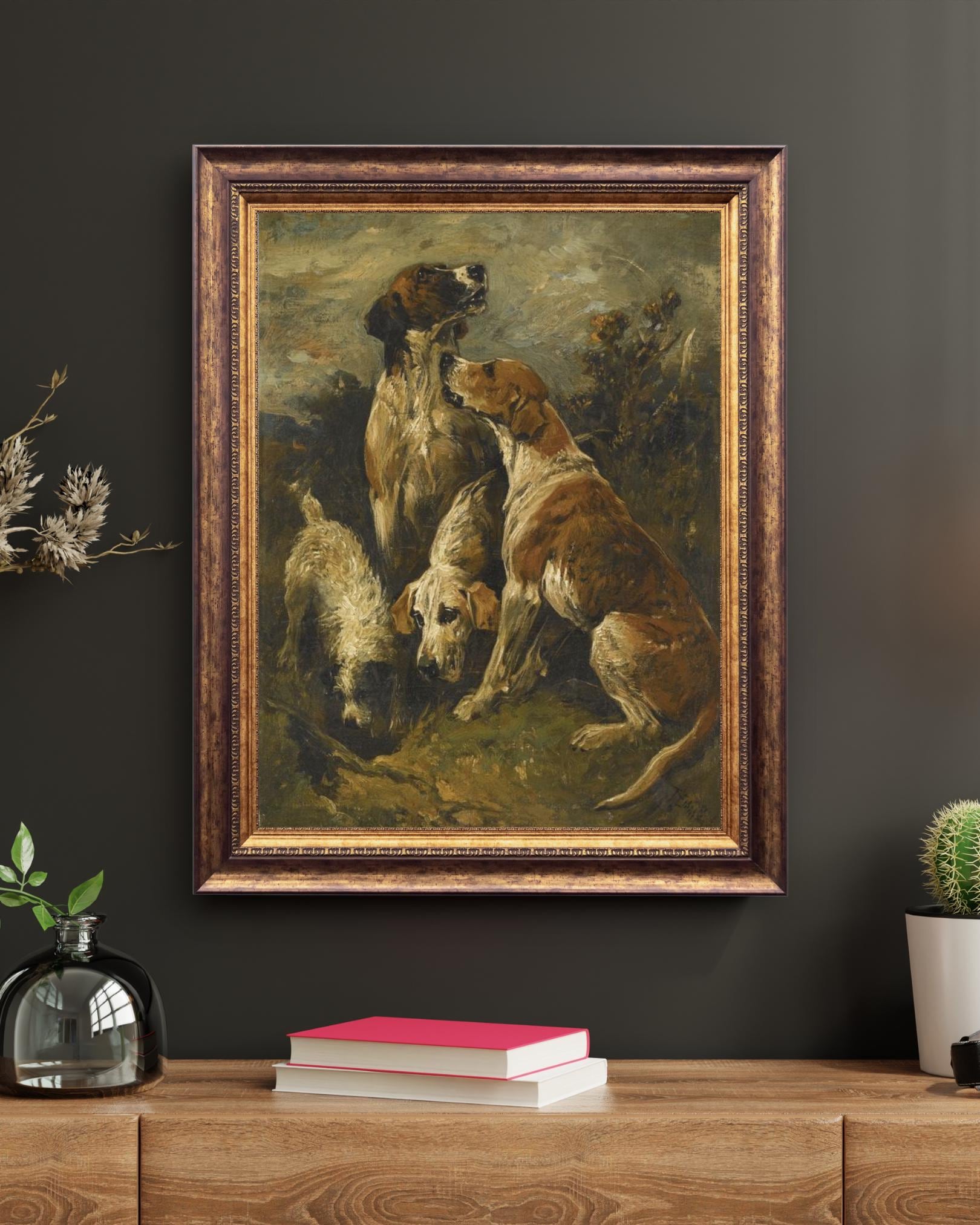 Push past common decor with this captivating **Antique Hunting Dogs Portrait Canvas Print**, capturing the rugged spirit and loyalty of sporting canines. This antique-style animal painting, reminiscent of 19th-century masters, features three loyal hunting dogs in a rustic landscape. The loose, earthy brushwork and focused gaze make it a perfect fit for a **Farmhouse** or **Cabin** setting, bringing traditional, wild warmth to your space.