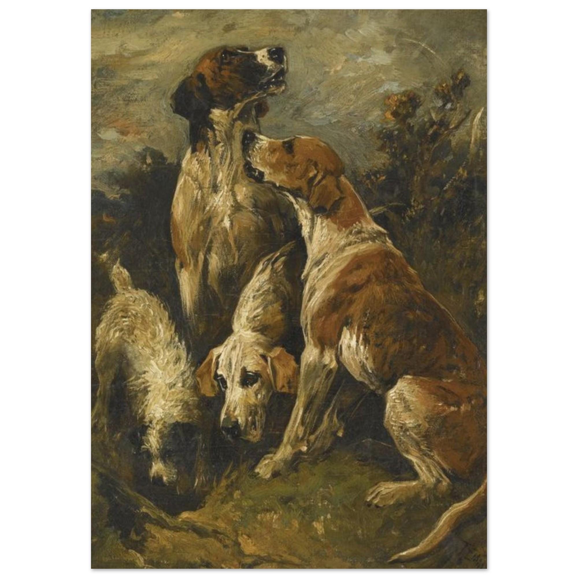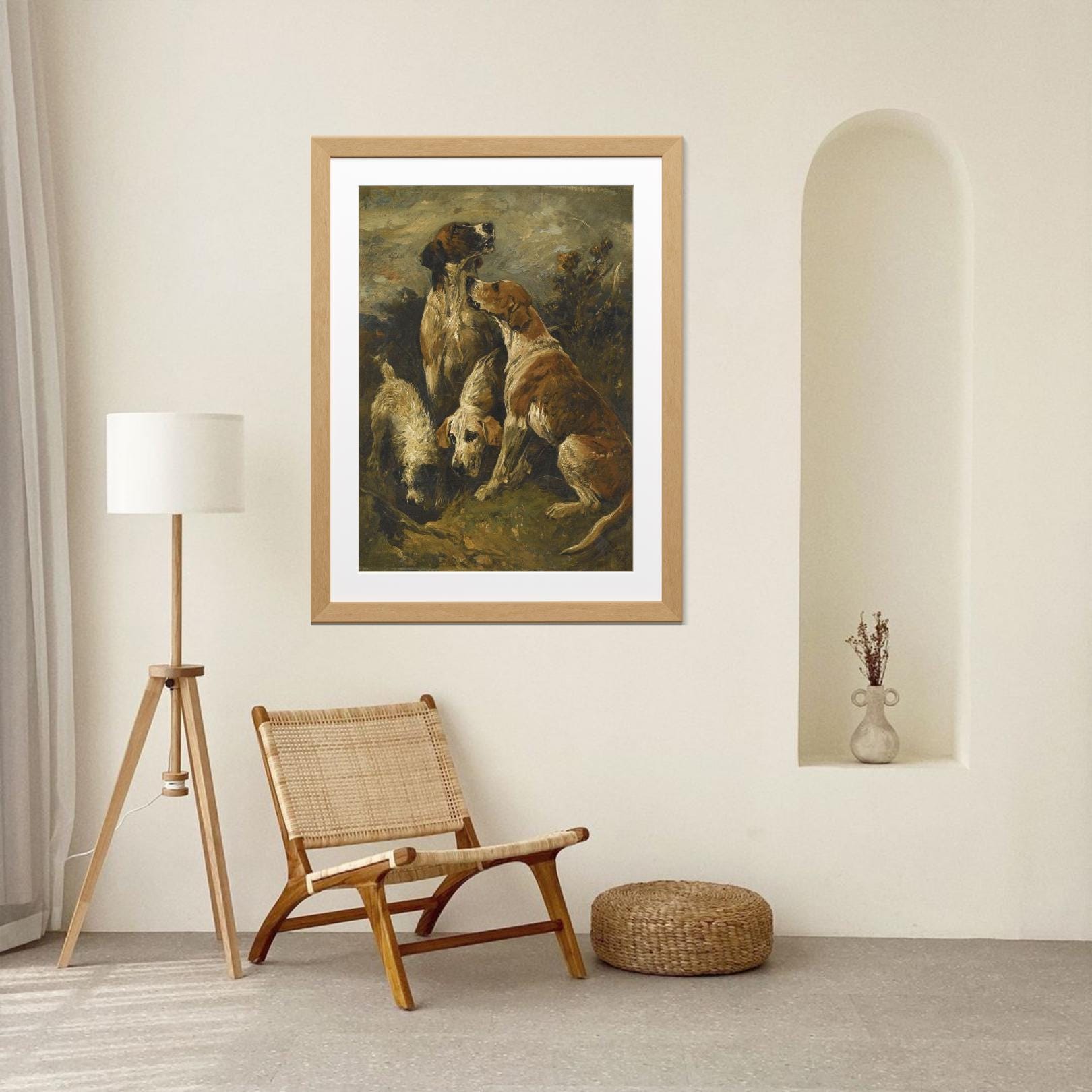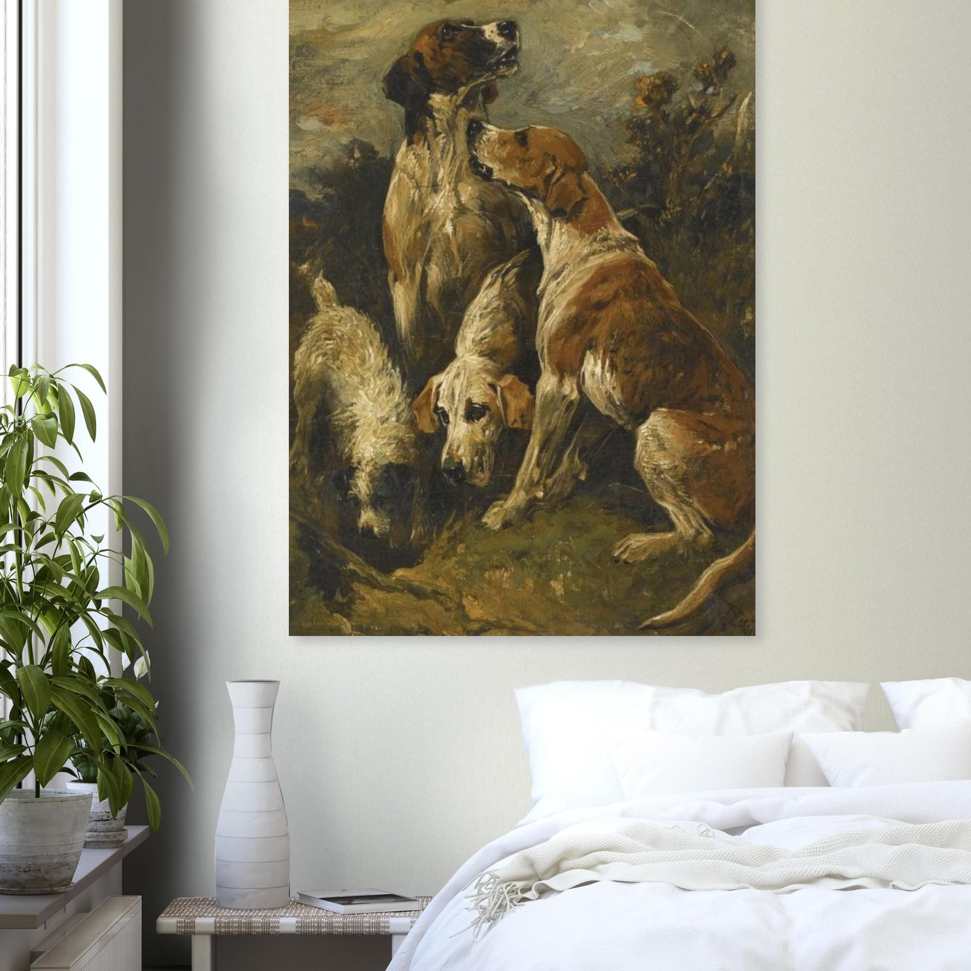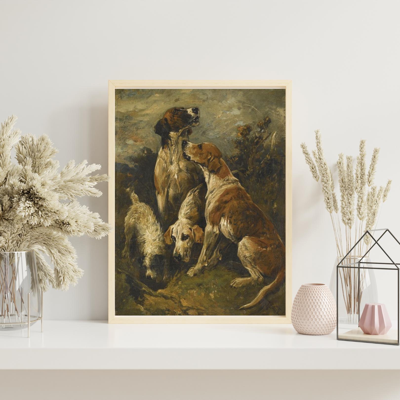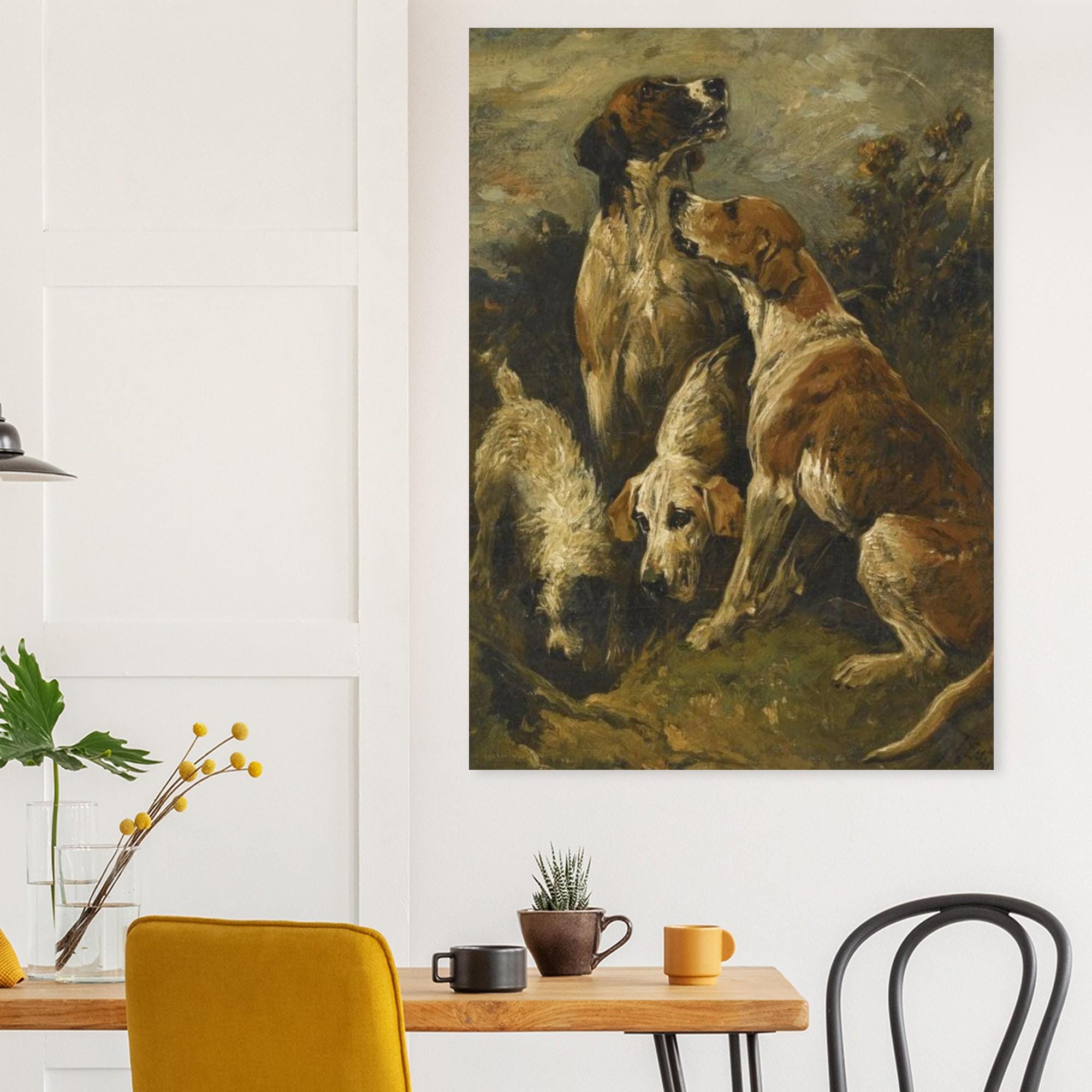 Push past common decor with this captivating **Antique Hunting Dogs Portrait Canvas Print**, capturing the rugged spirit and loyalty of sporting canines. This antique-style animal painting, reminiscent of 19th-century masters, features three loyal hunting dogs in a rustic landscape. The loose, earthy brushwork and focused gaze make it a perfect fit for a **Farmhouse** or **Cabin** setting, bringing traditional, wild warmth to your space.