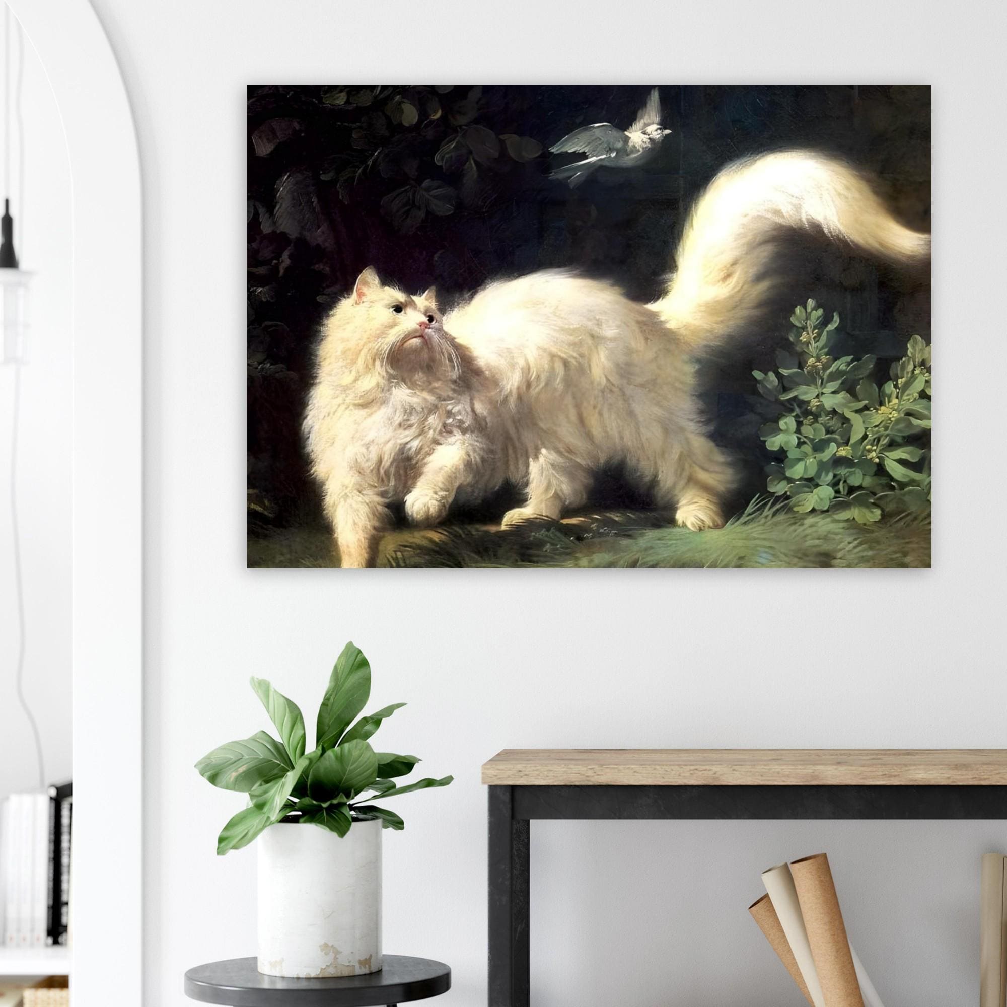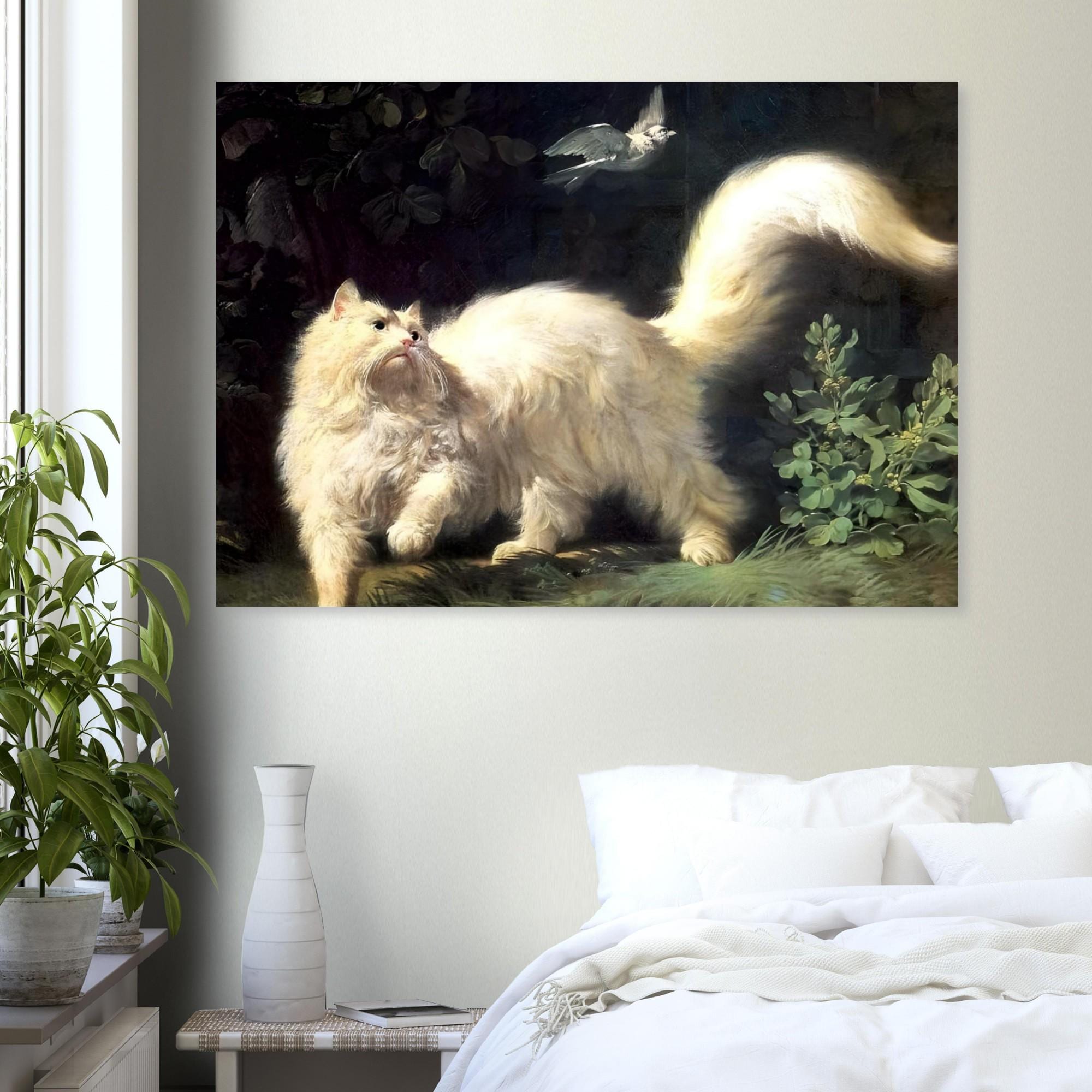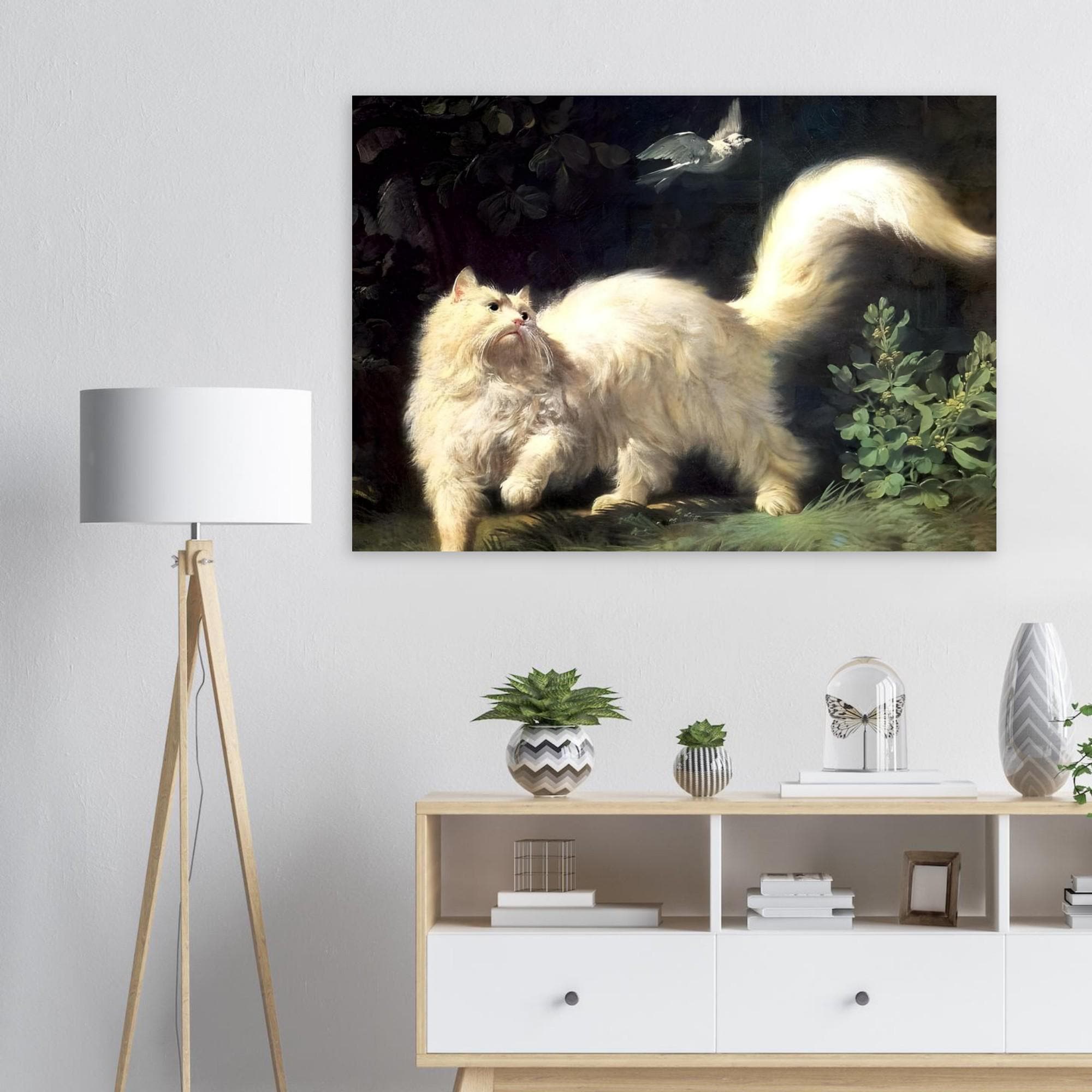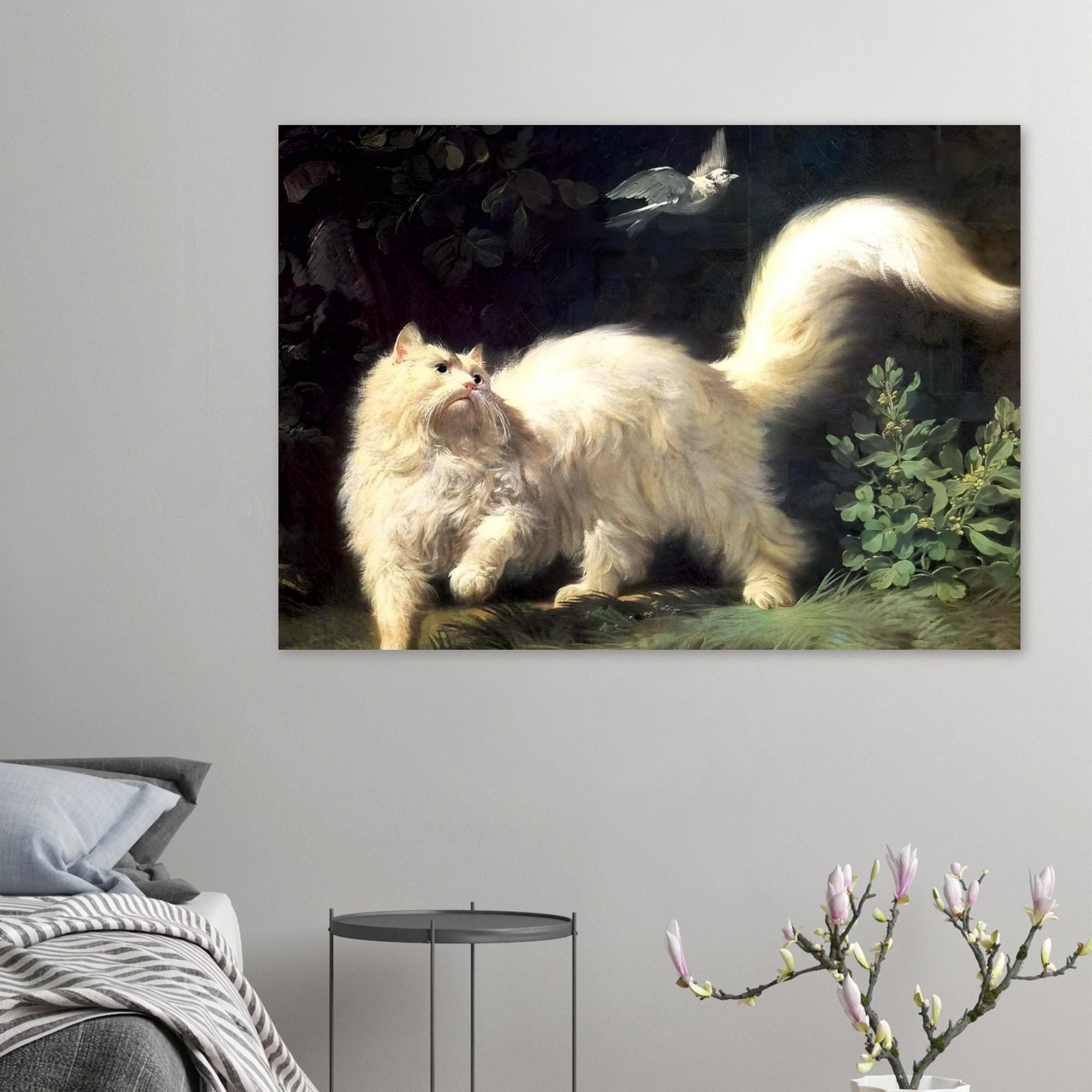 Push past common decor with this captivating Jean-Jacques Bachelier's A Cat Stalking a Bird Canvas Print. This highly detailed painting from the 18th century captures a dramatic moment as a majestic, fluffy white cat intensely focuses on a bird in flight. The luminous treatment of the cat's fur against the dark, mysterious background showcases the skill of the **Rococo** master. This piece is perfect for cat lovers, collectors of old masters, and anyone who appreciates historical animal portraiture with dramatic flair.
