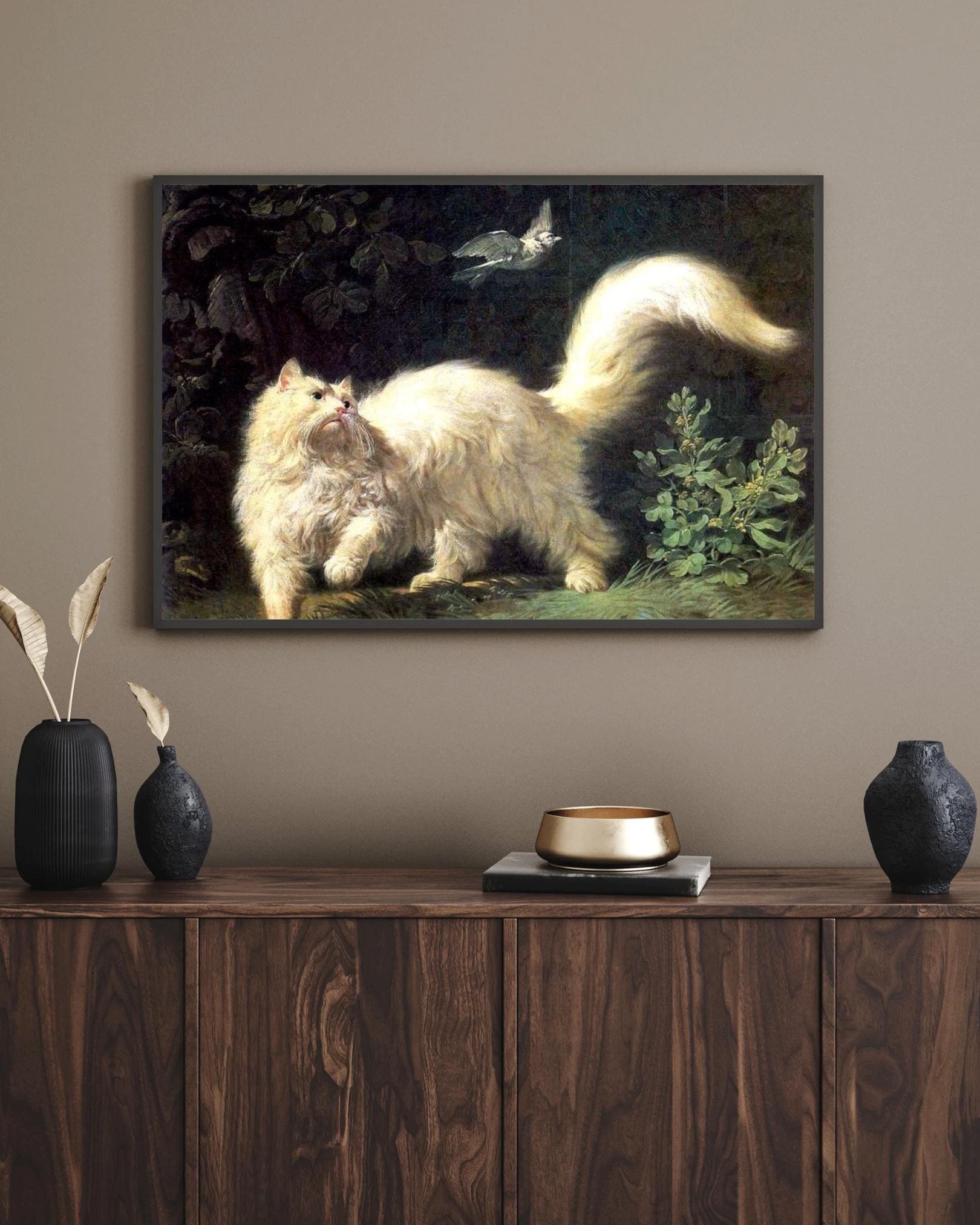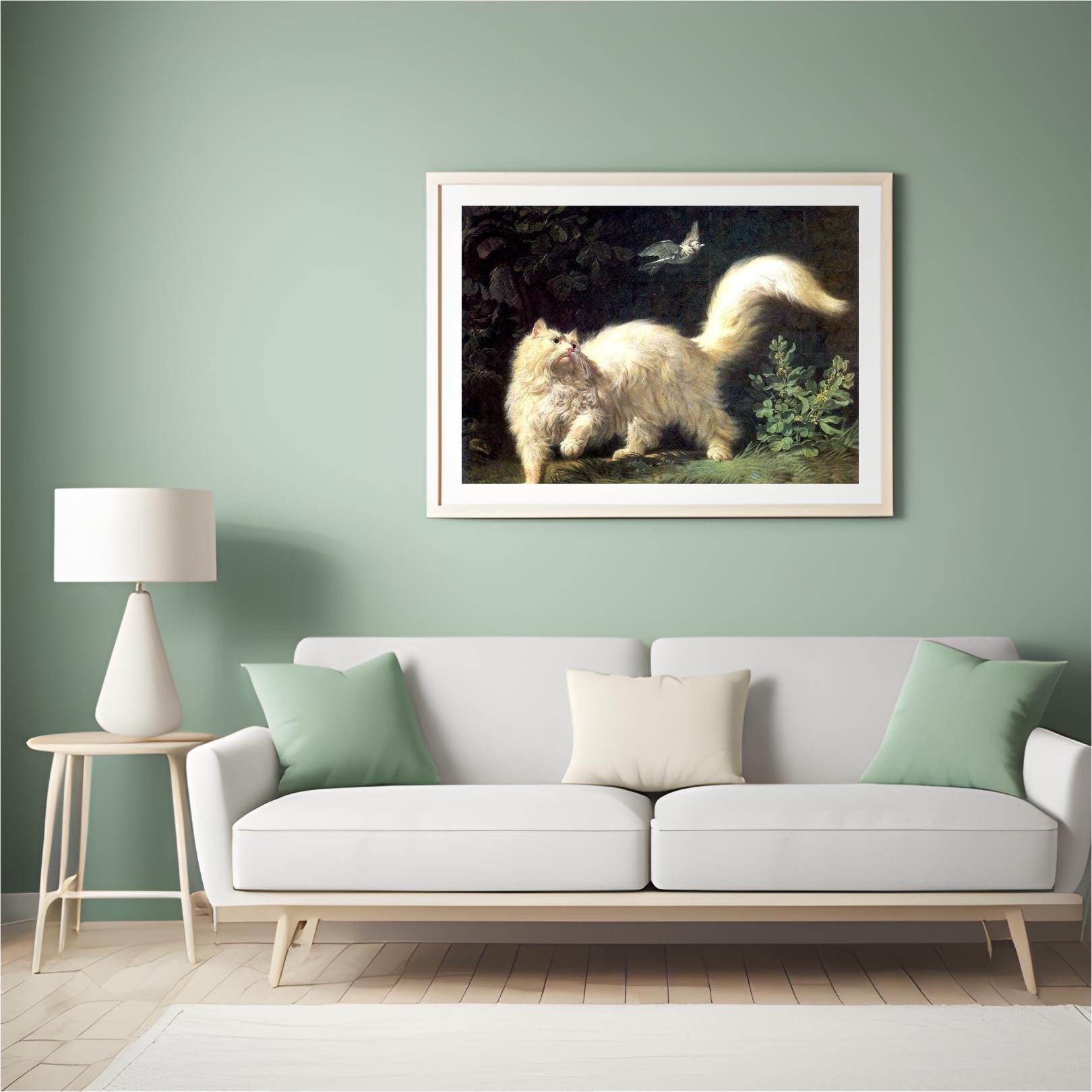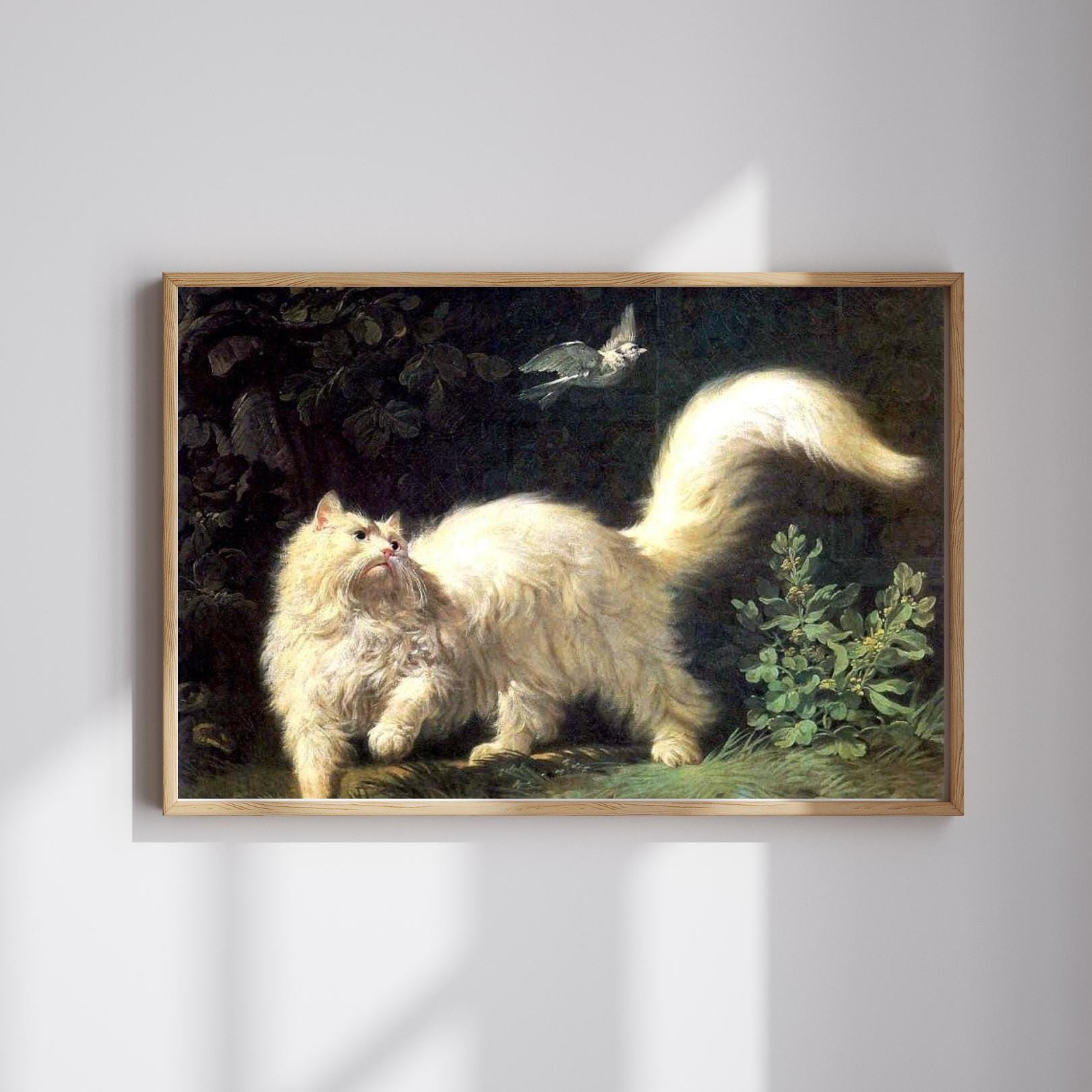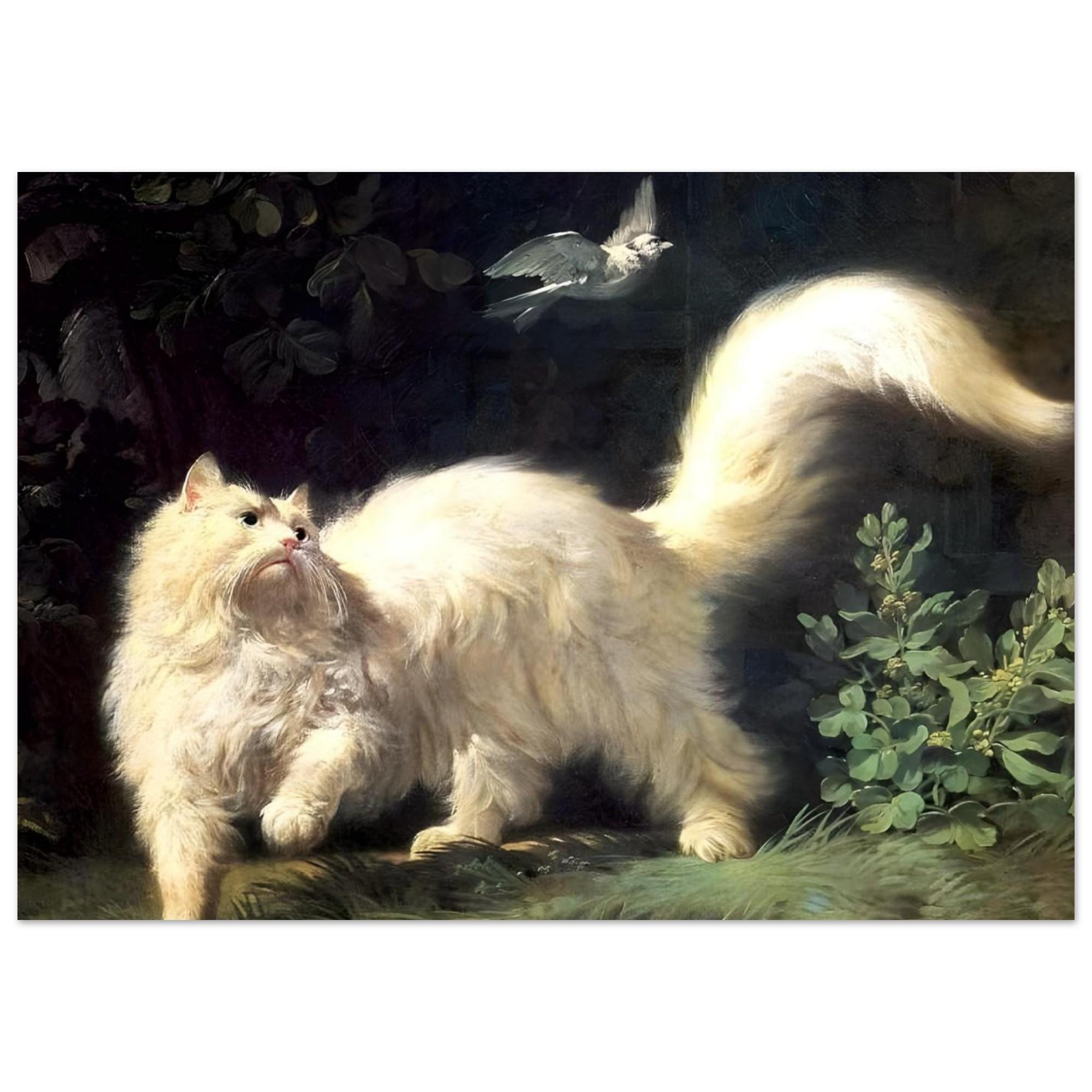 Push past common decor with this captivating Jean-Jacques Bachelier's A Cat Stalking a Bird Canvas Print. This highly detailed painting from the 18th century captures a dramatic moment as a majestic, fluffy white cat intensely focuses on a bird in flight. The luminous treatment of the cat's fur against the dark, mysterious background showcases the skill of the **Rococo** master. This piece is perfect for cat lovers, collectors of old masters, and anyone who appreciates historical animal portraiture with dramatic flair.