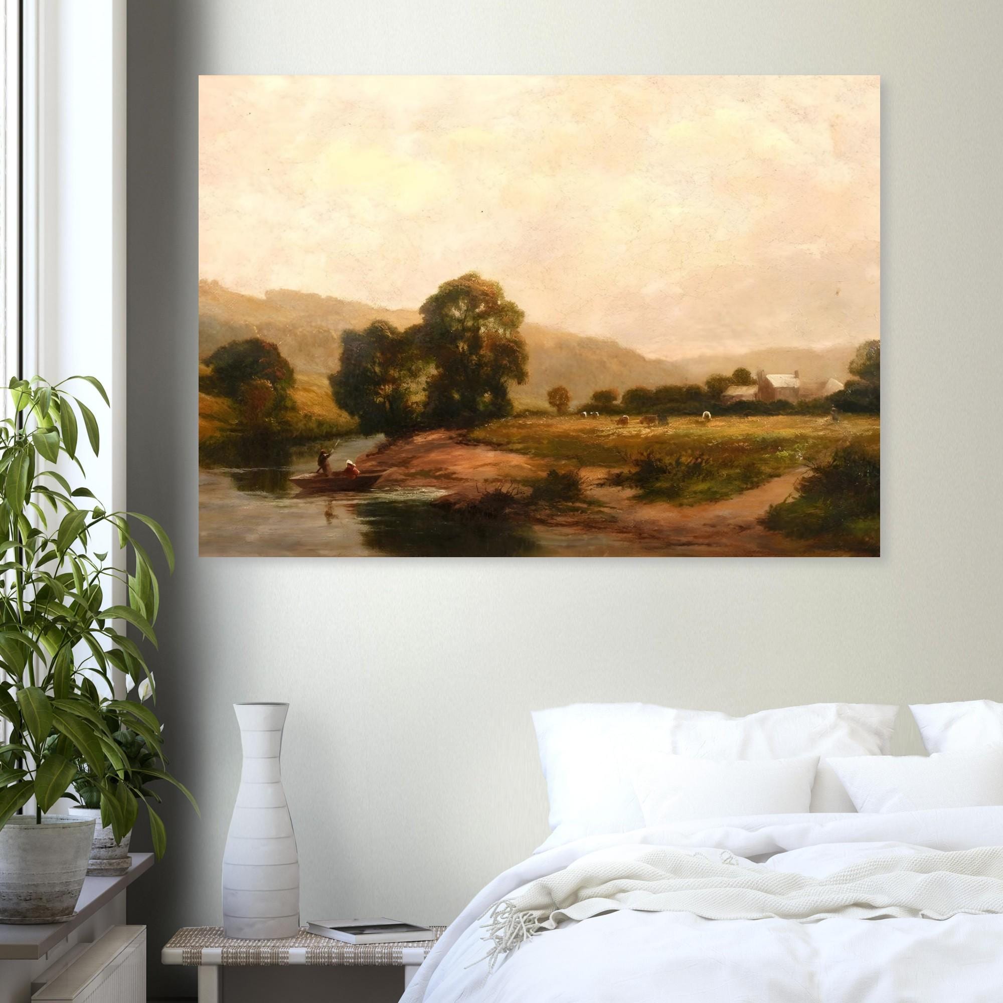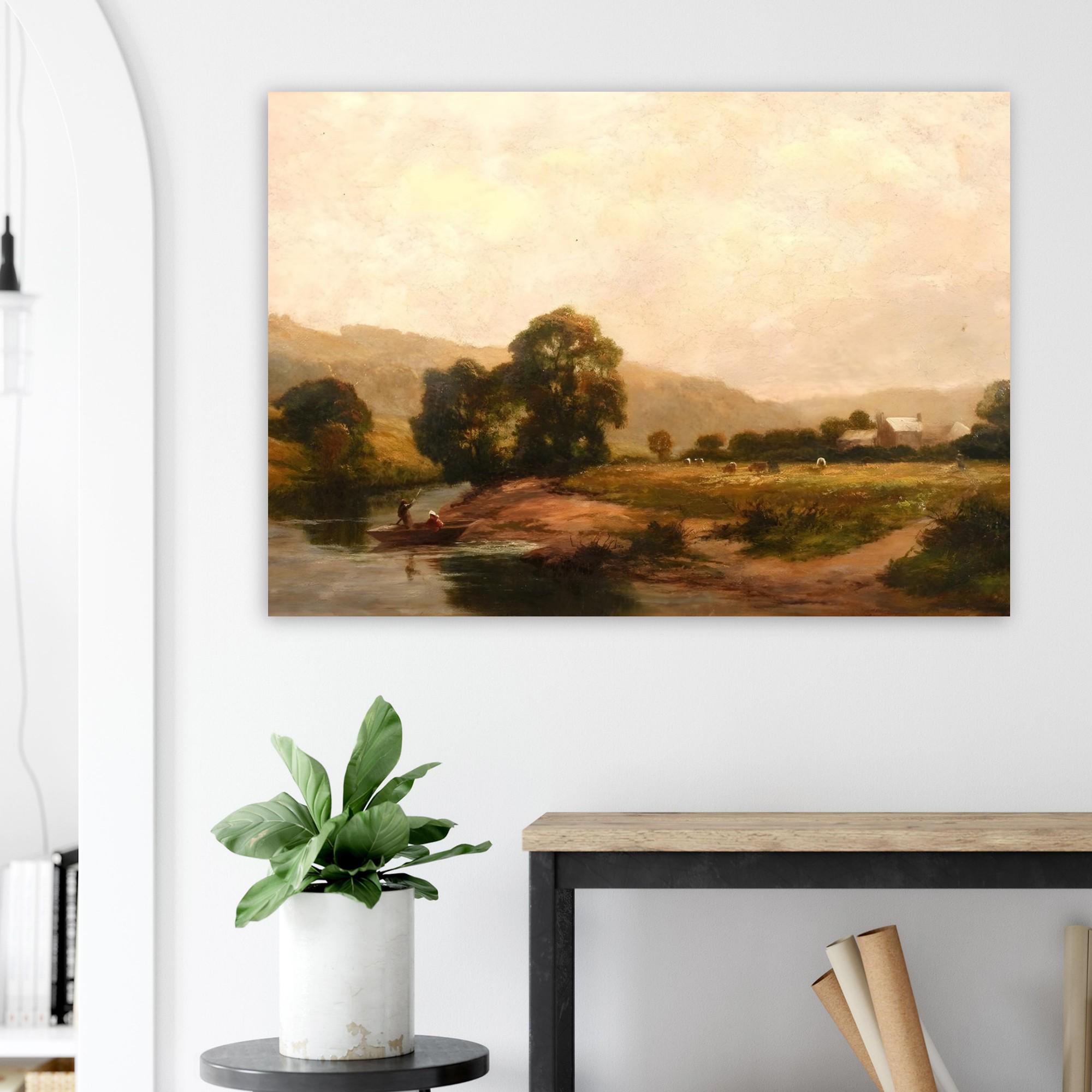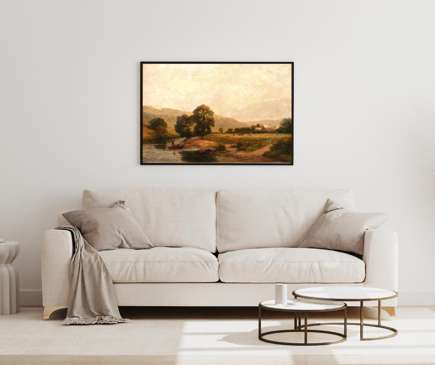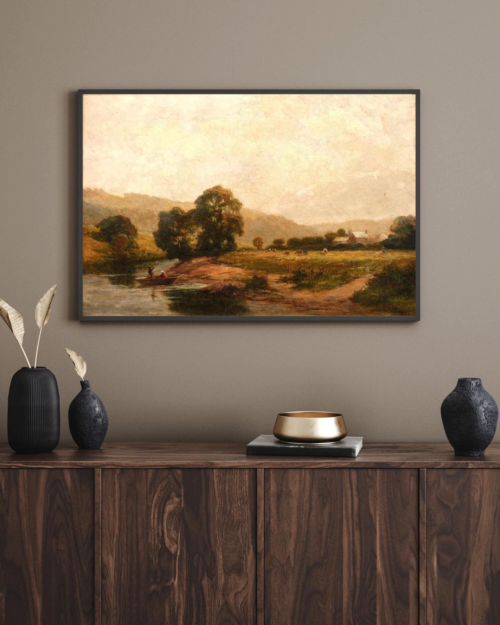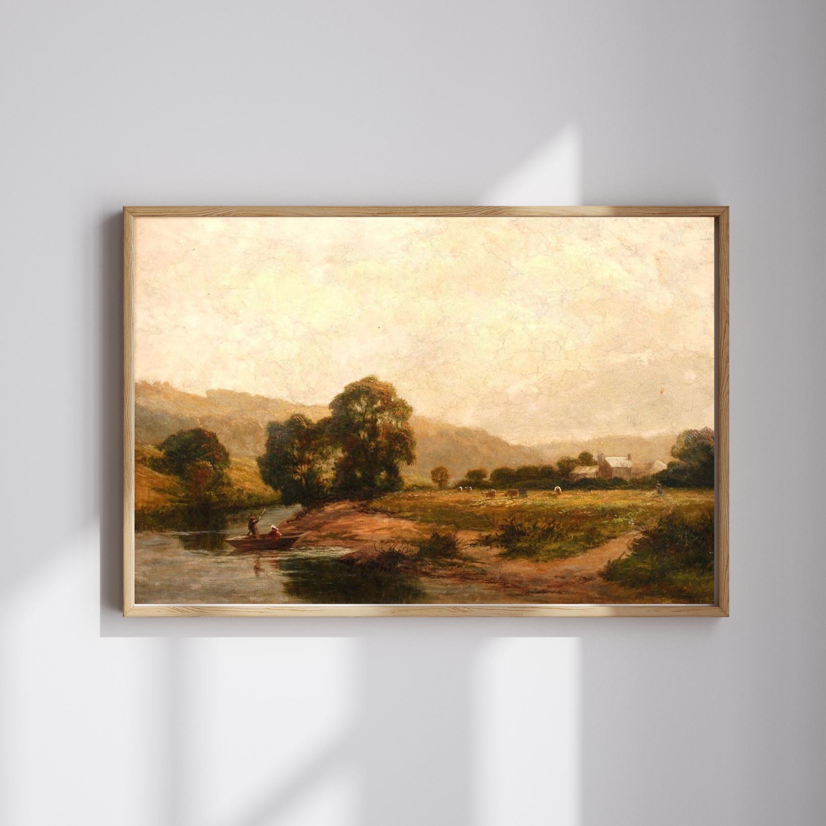 Push past common decor with this captivating **Vintage Countryside Landscape Canvas Print**, capturing the timeless tranquility and atmospheric beauty of a rural river scene. This antique-style oil painting, reminiscent of 19th-century English Romanticism, features a serene river with a small boat, a quaint country house in the distance, and cows grazing peacefully under a soft, moody sky. It's perfect for bringing a **Moody Rustic Farmhouse** charm and traditional character to your space.