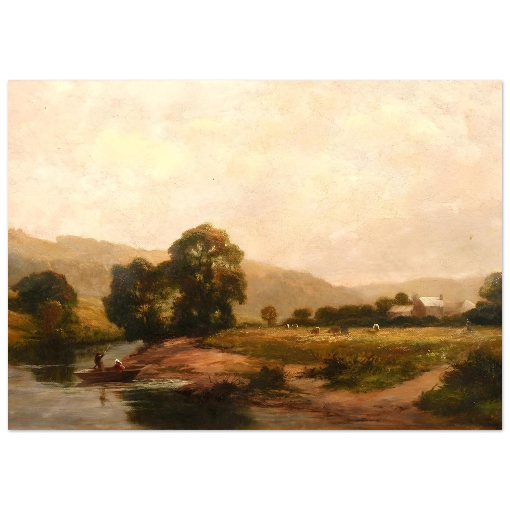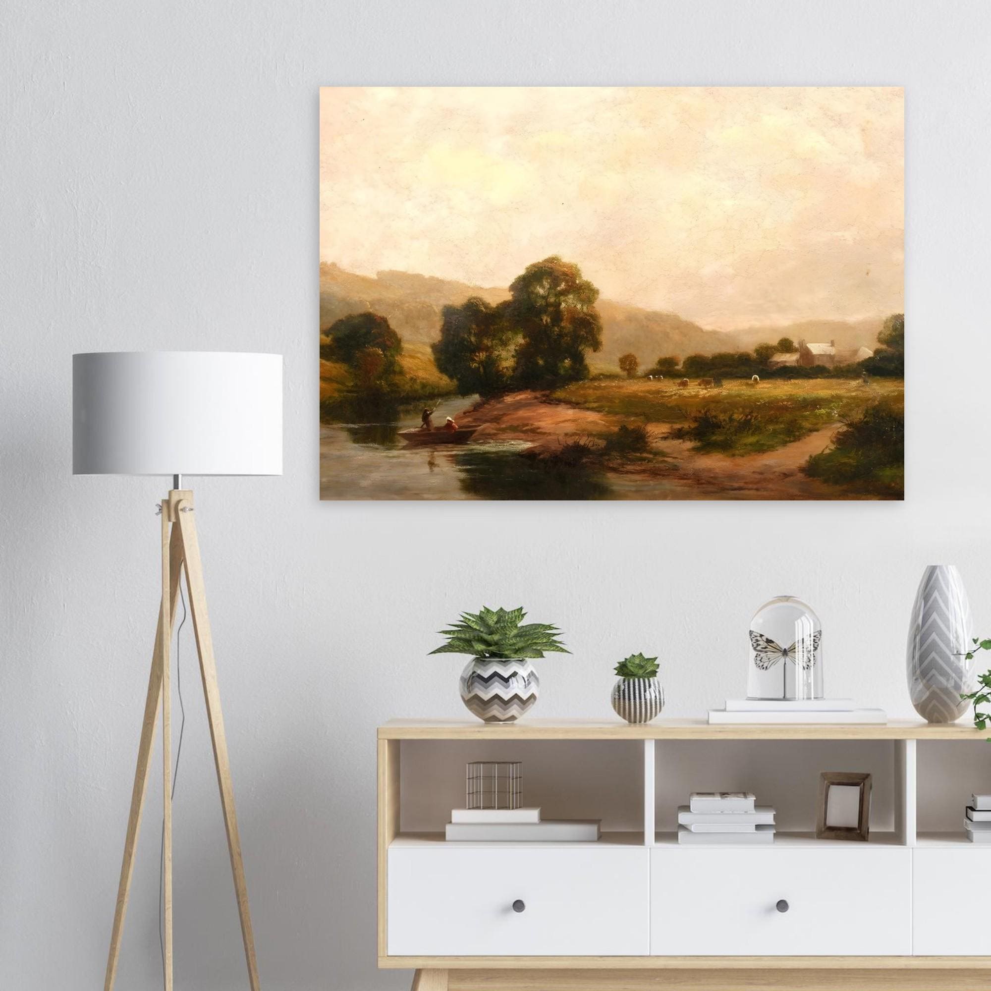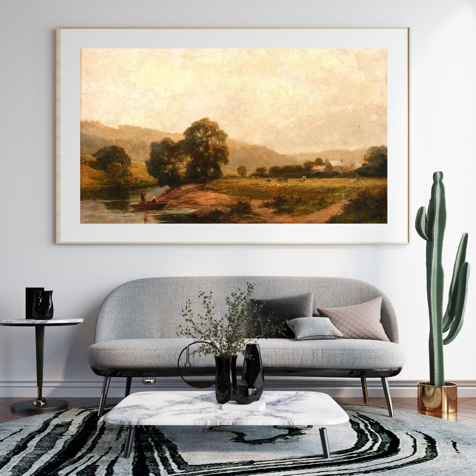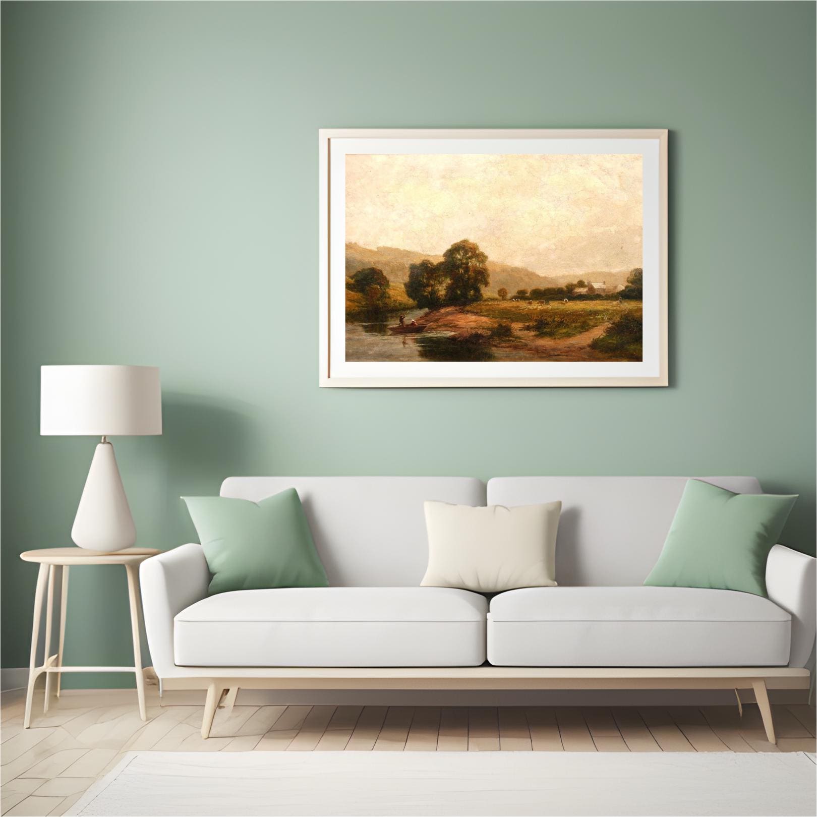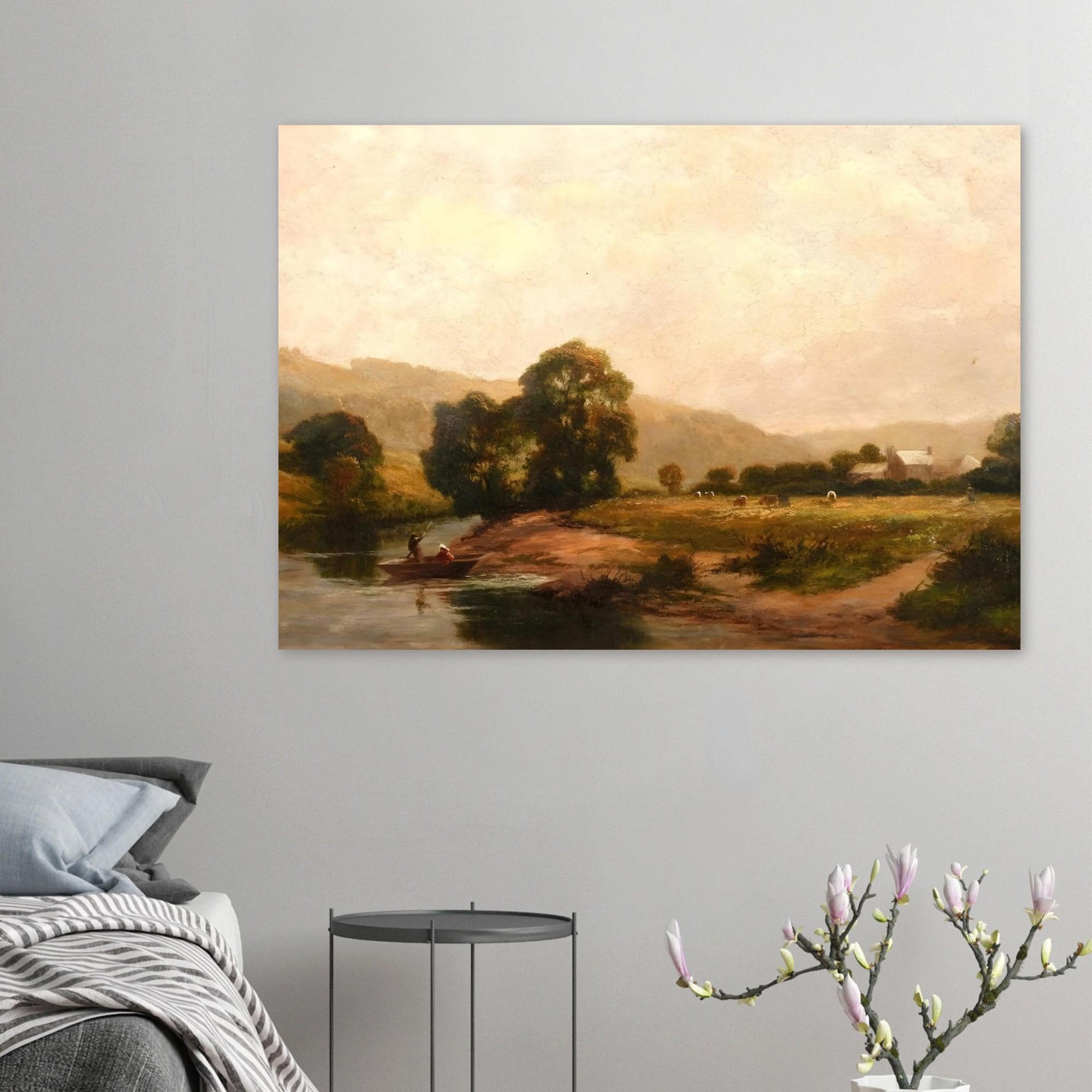 Push past common decor with this captivating **Vintage Countryside Landscape Canvas Print**, capturing the timeless tranquility and atmospheric beauty of a rural river scene. This antique-style oil painting, reminiscent of 19th-century English Romanticism, features a serene river with a small boat, a quaint country house in the distance, and cows grazing peacefully under a soft, moody sky. It's perfect for bringing a **Moody Rustic Farmhouse** charm and traditional character to your space.