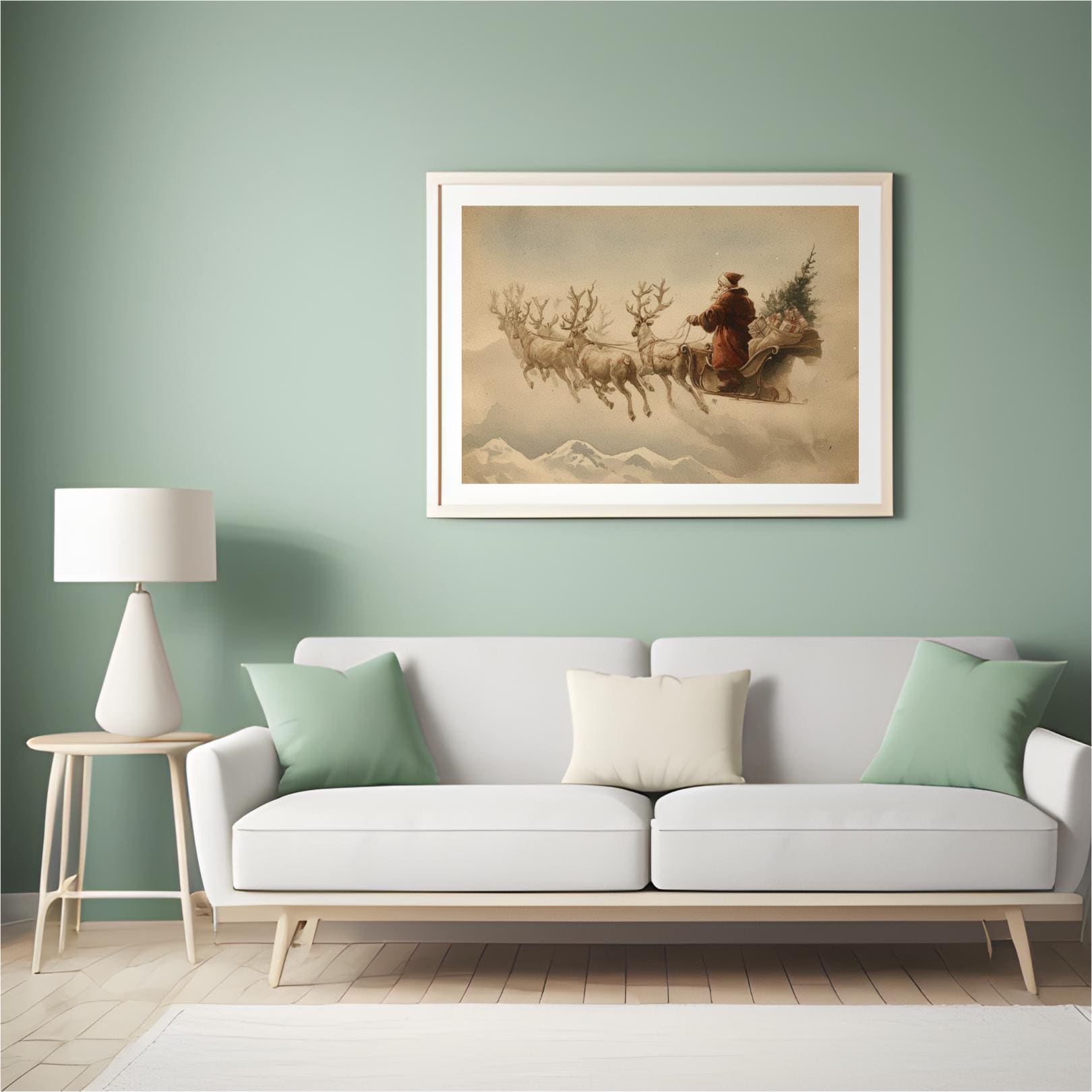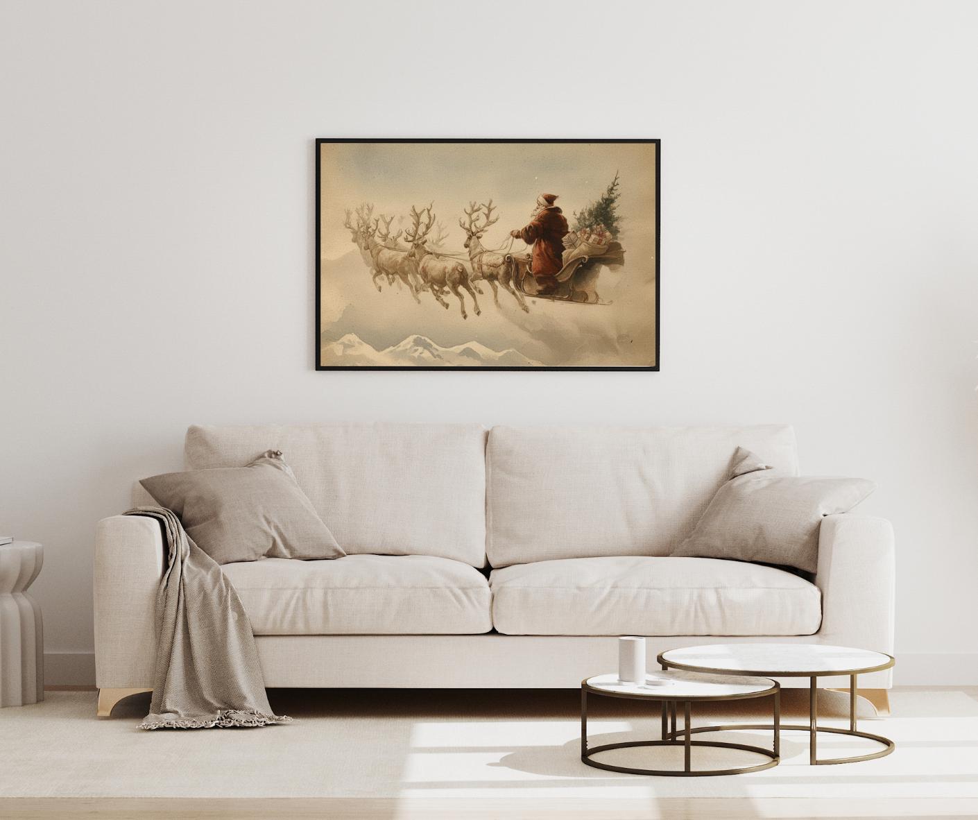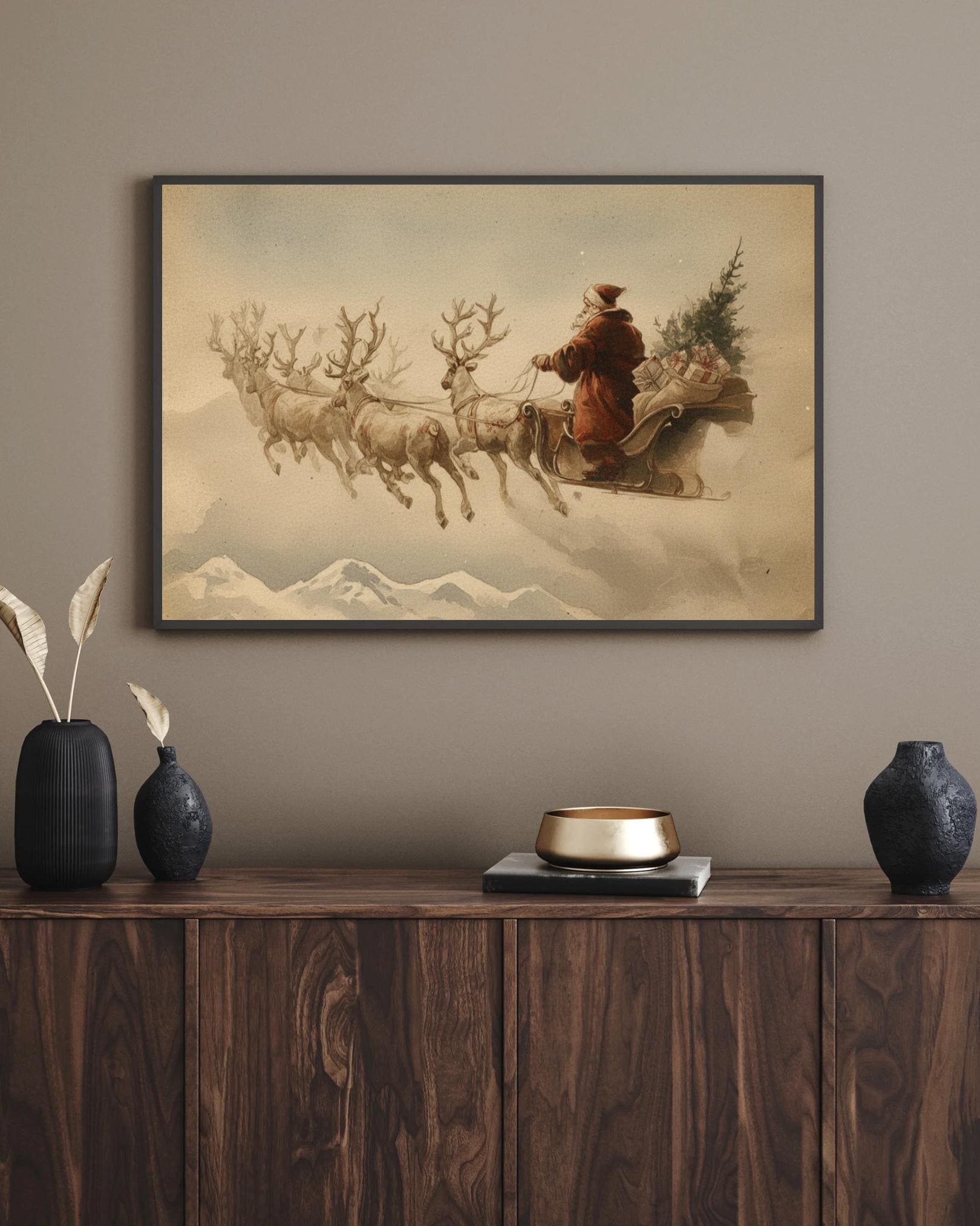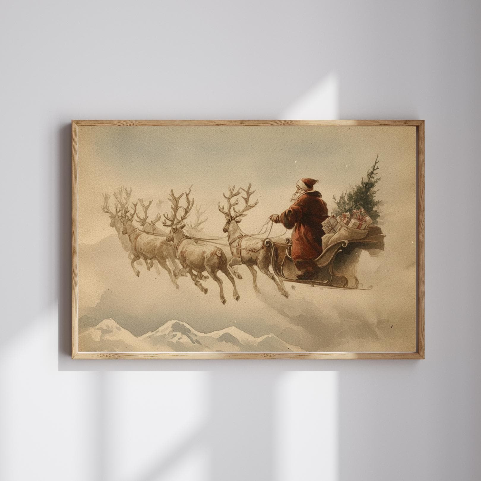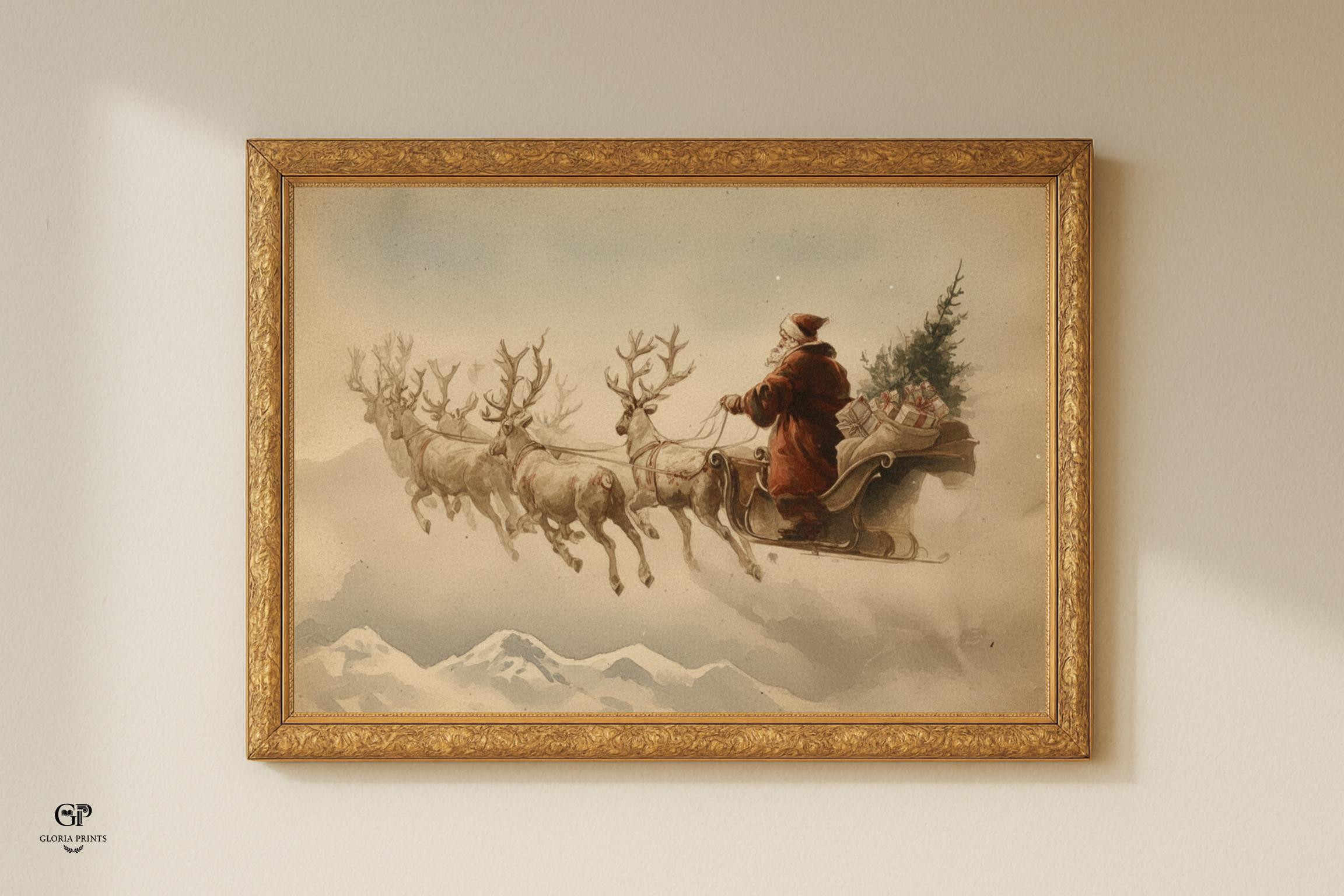 - A nostalgic Christmas print capturing the classic image of Santa Claus in his sleigh. Ideal for adding rustic farmhouse charm and festive Christmas art to your holiday space. The vintage watercolor style perfectly evokes the magic and nostalgia of traditional holiday illustrations.