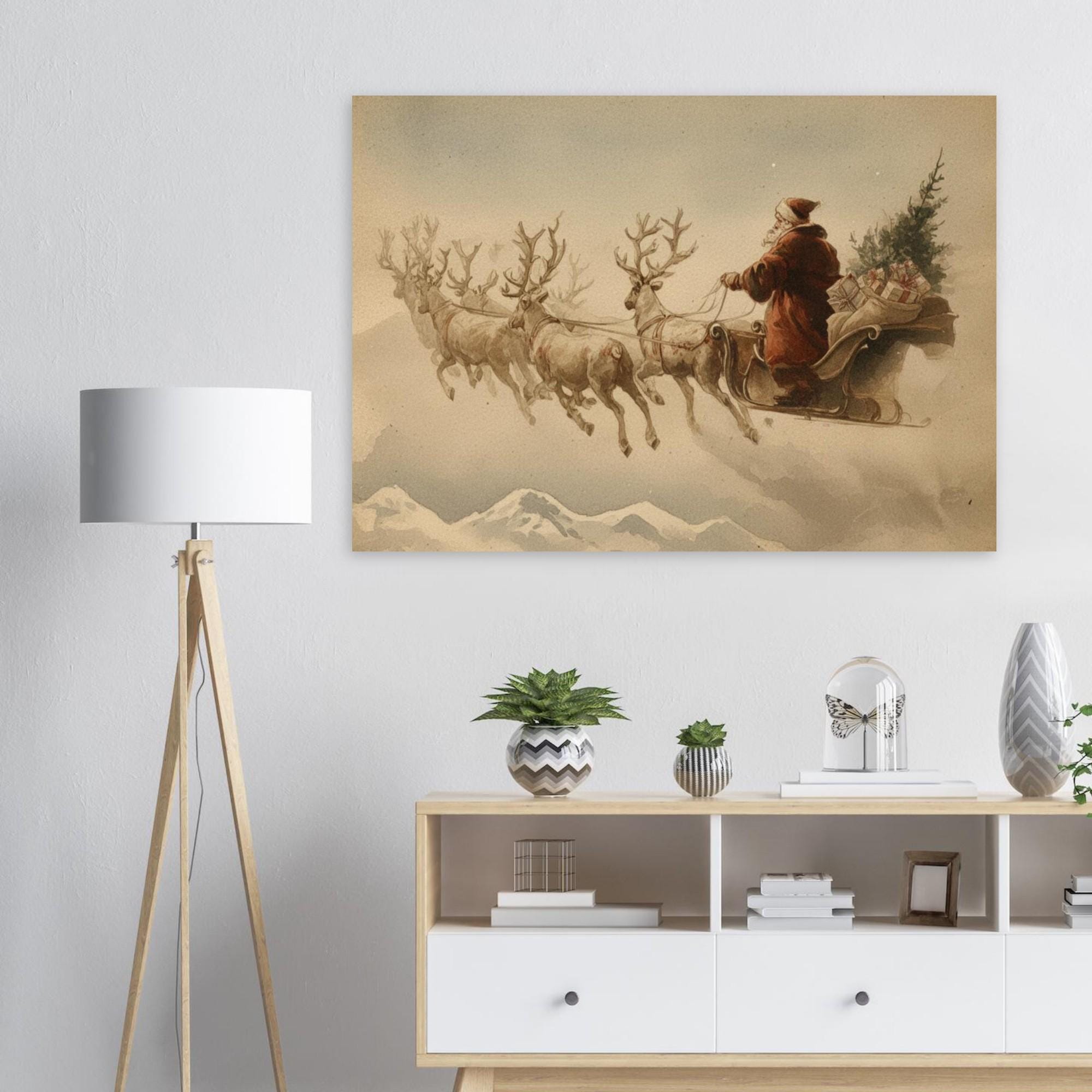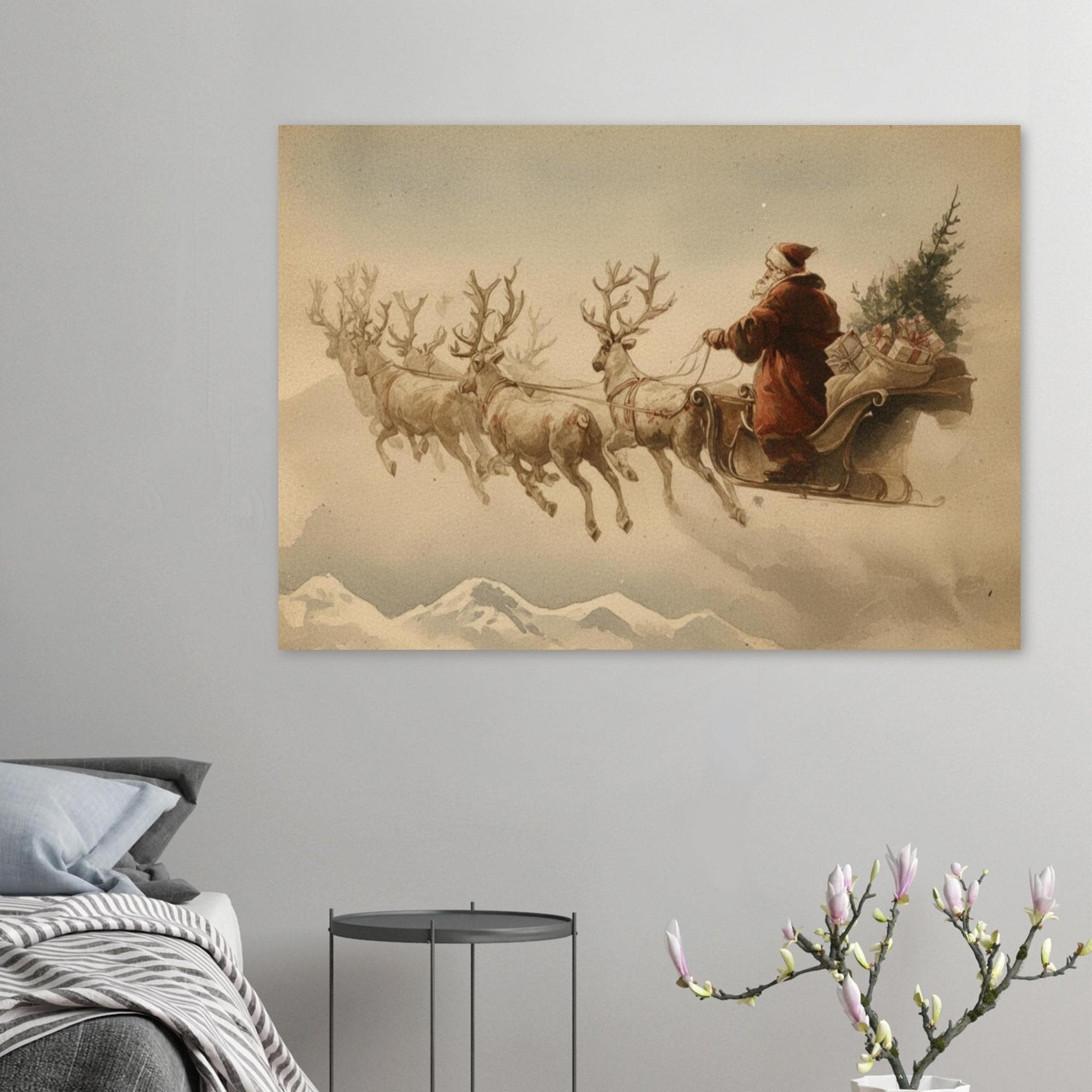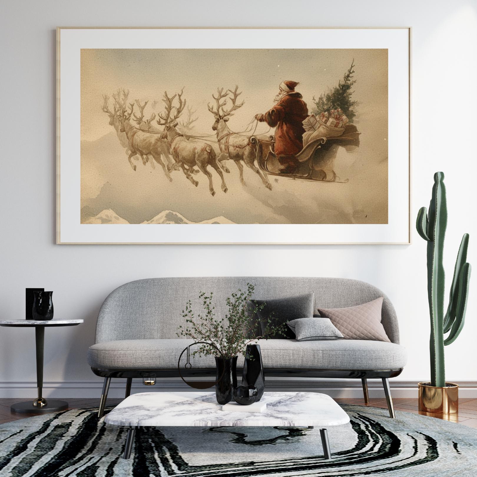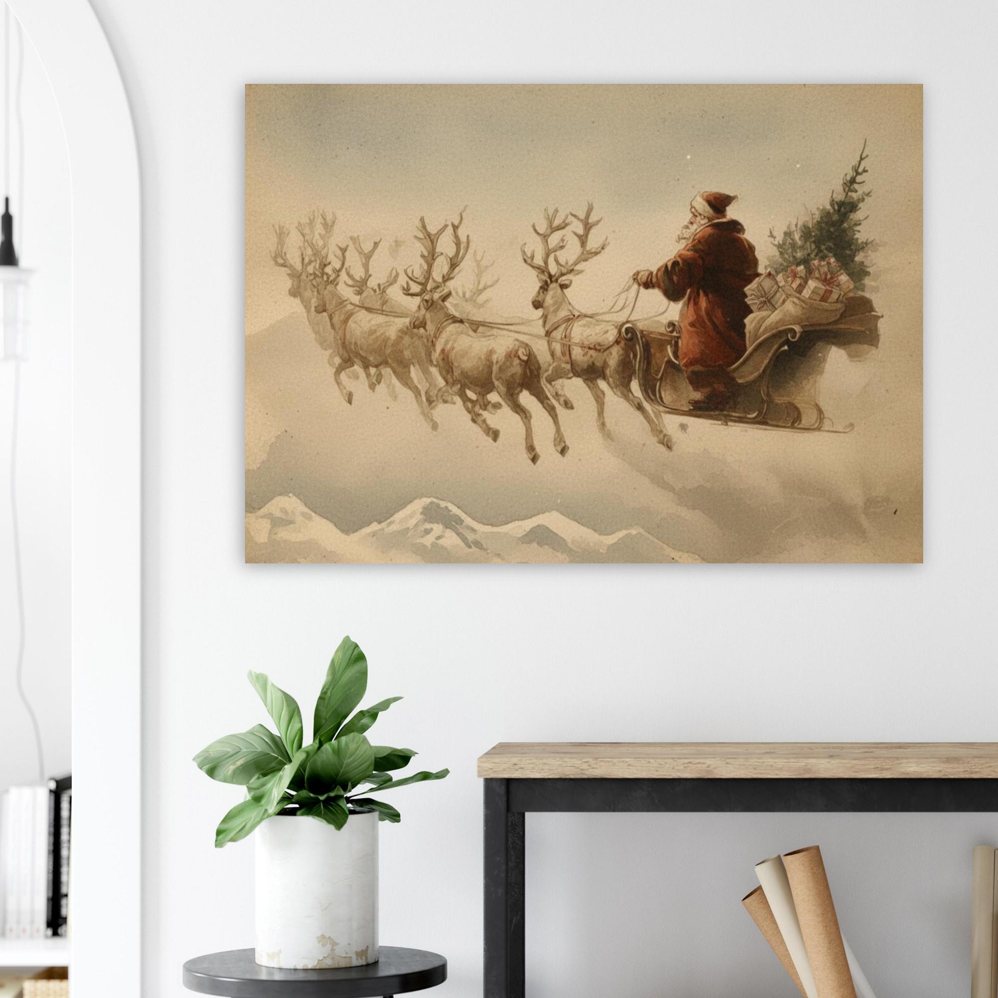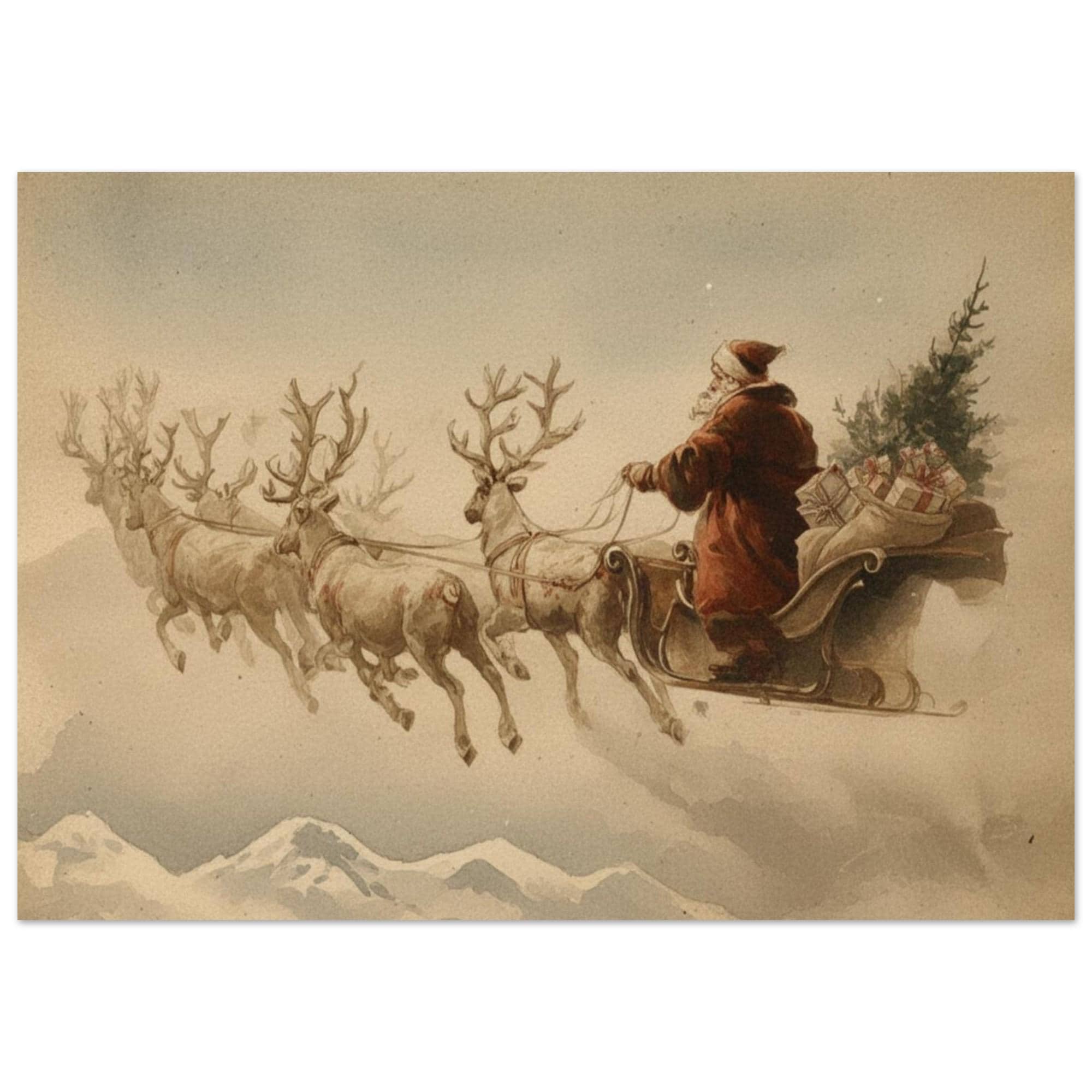 - A nostalgic Christmas print capturing the classic image of Santa Claus in his sleigh. Ideal for adding rustic farmhouse charm and festive Christmas art to your holiday space. The vintage watercolor style perfectly evokes the magic and nostalgia of traditional holiday illustrations.