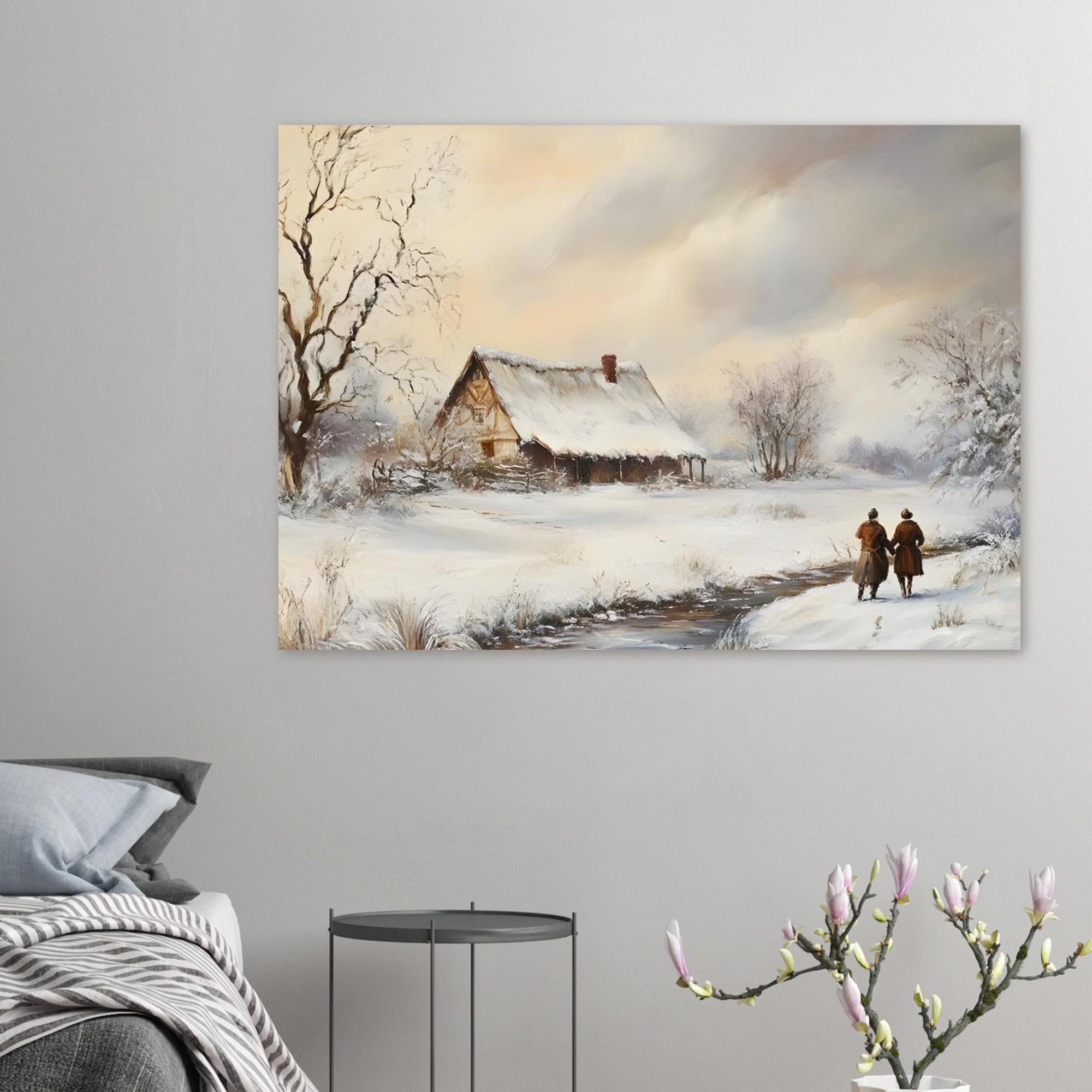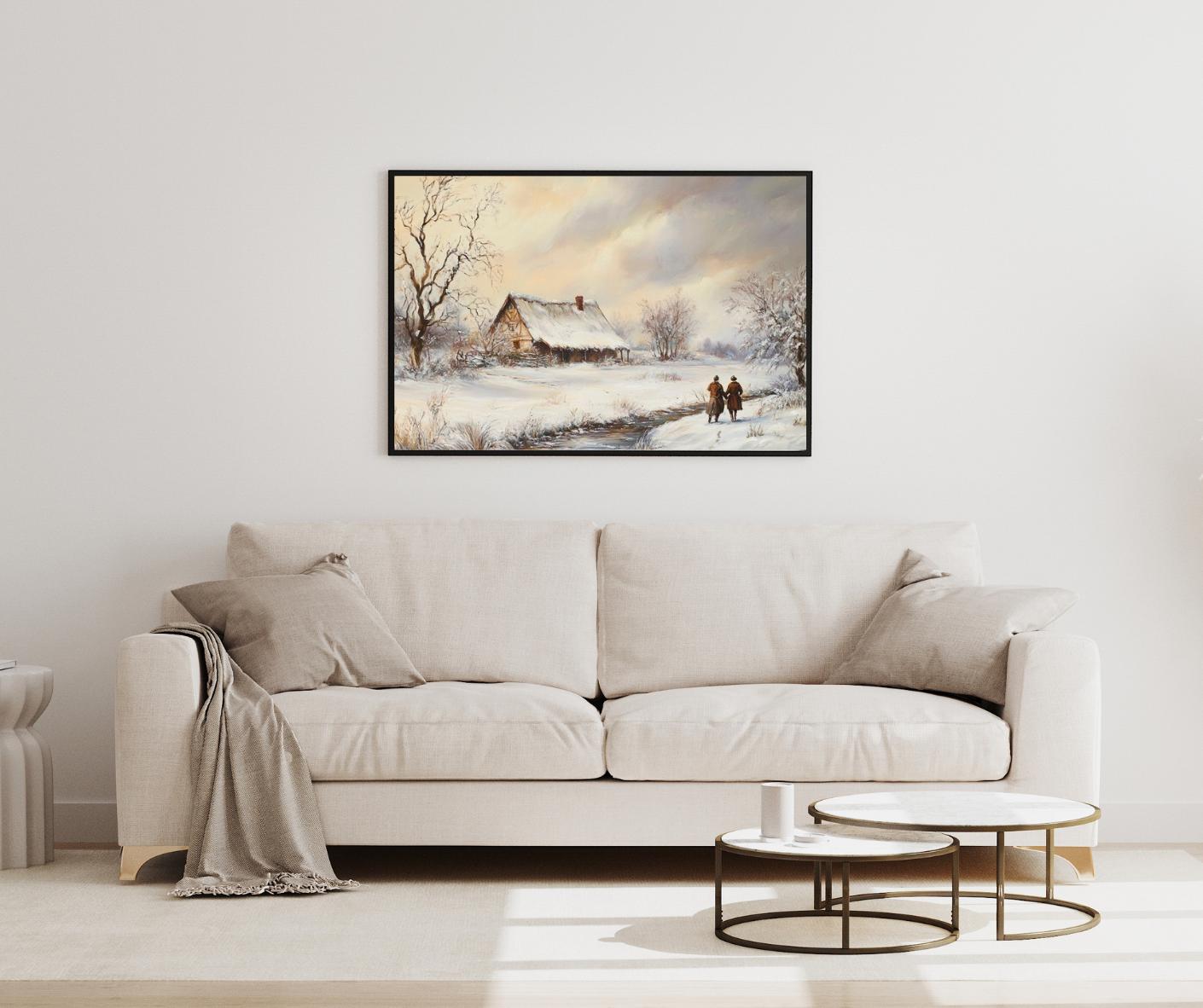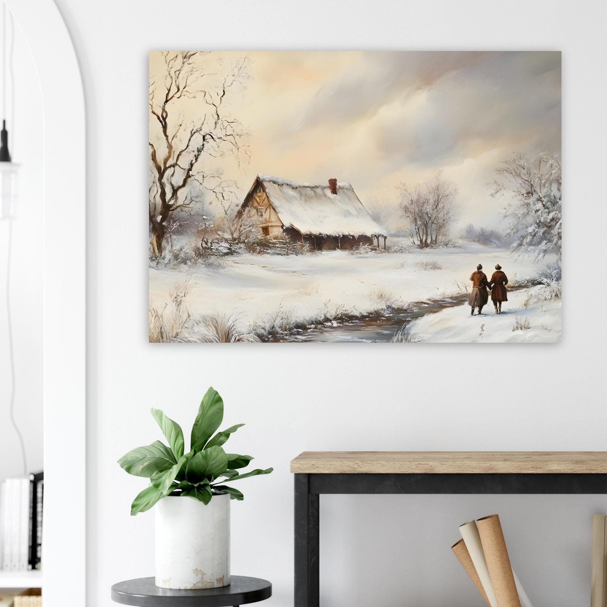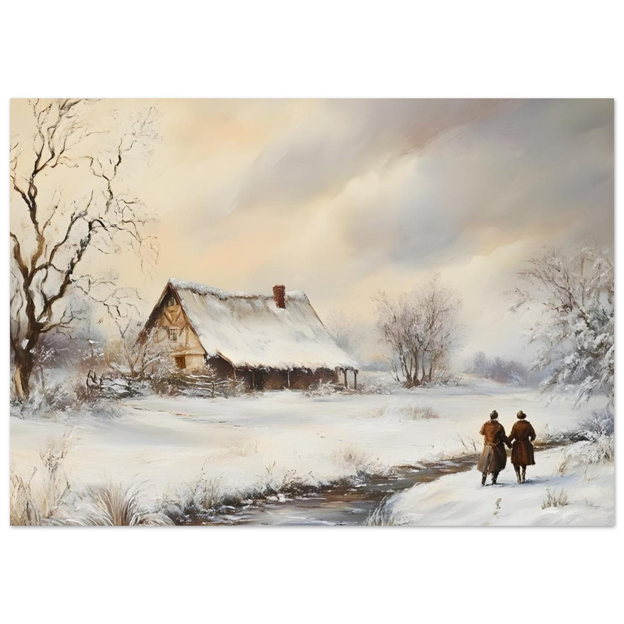 - A serene vintage print capturing a snowy countryside landscape. Ideal for adding a peaceful, rustic farmhouse charm and winter atmosphere to your space. The painting features a snow-covered cottage by a stream, with two figures walking along the path, evoking a sense of quiet companionship and nostalgic winter beauty.