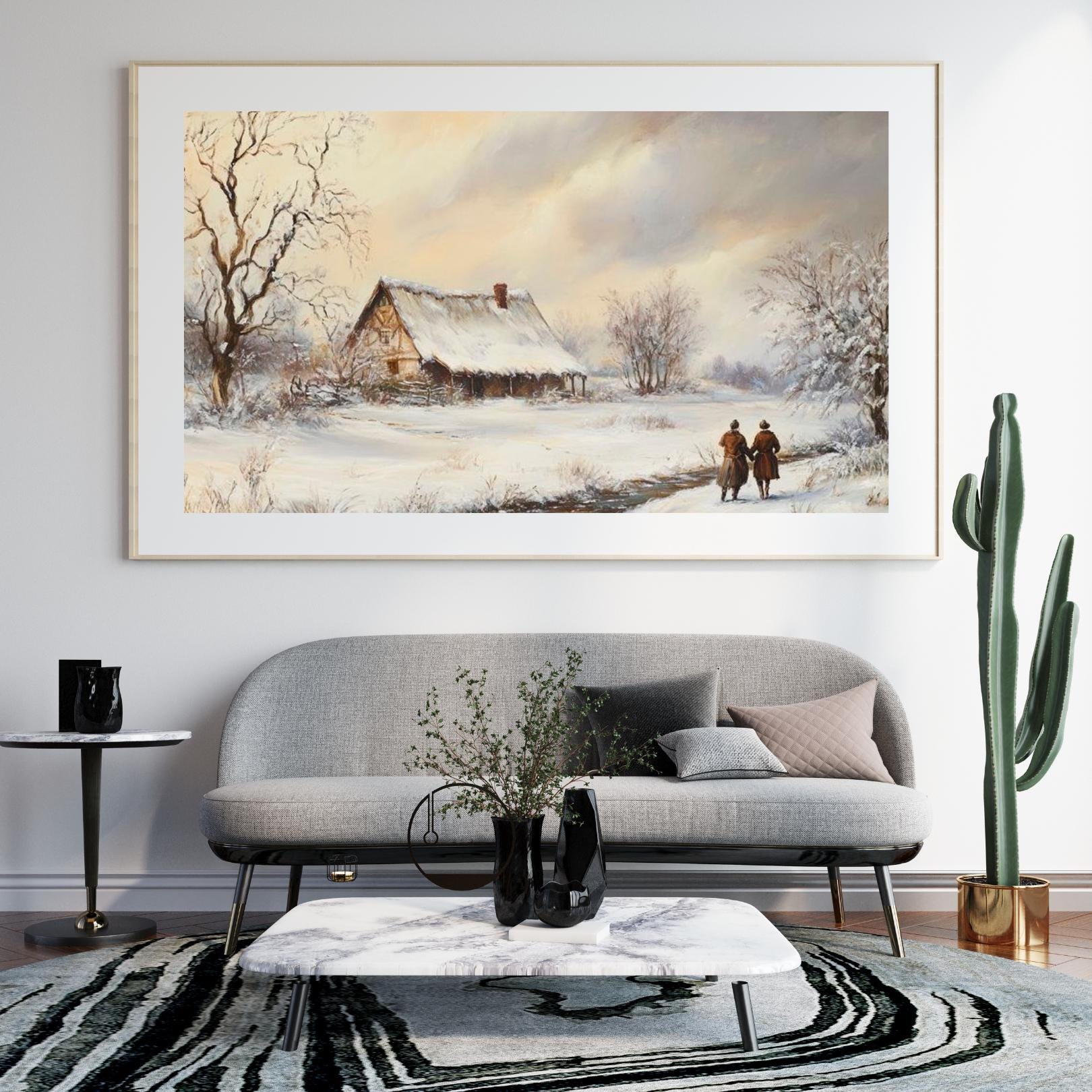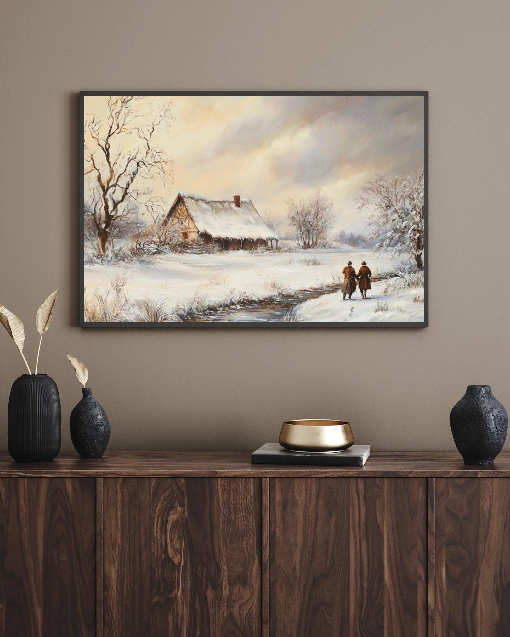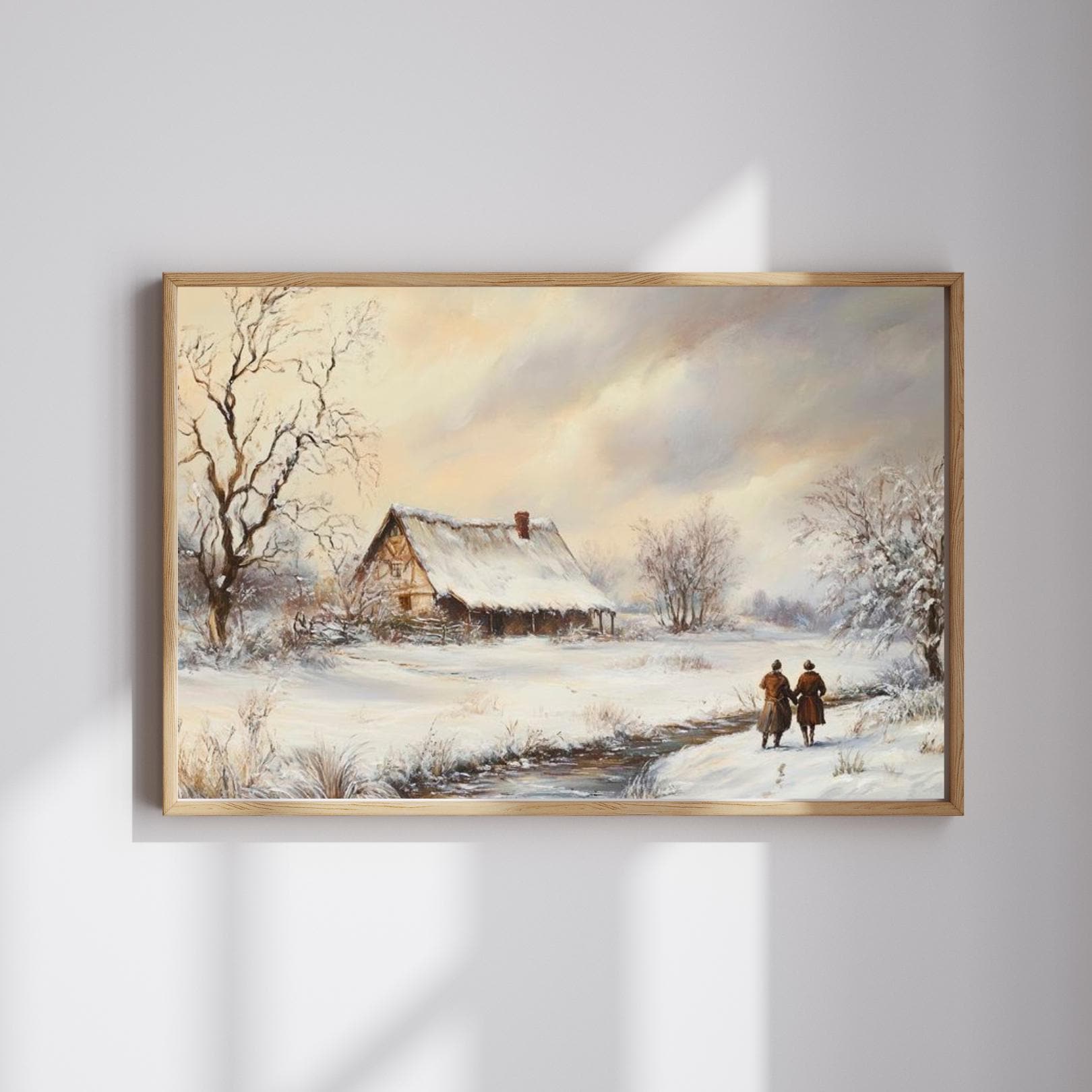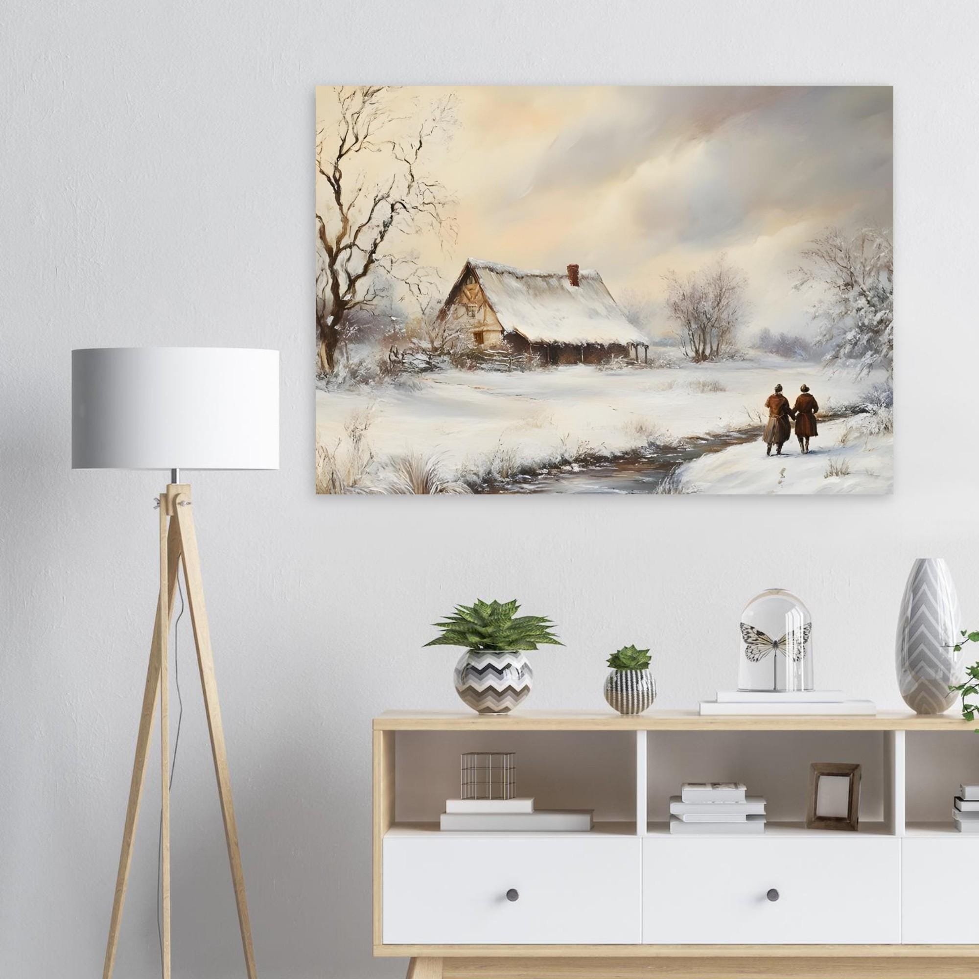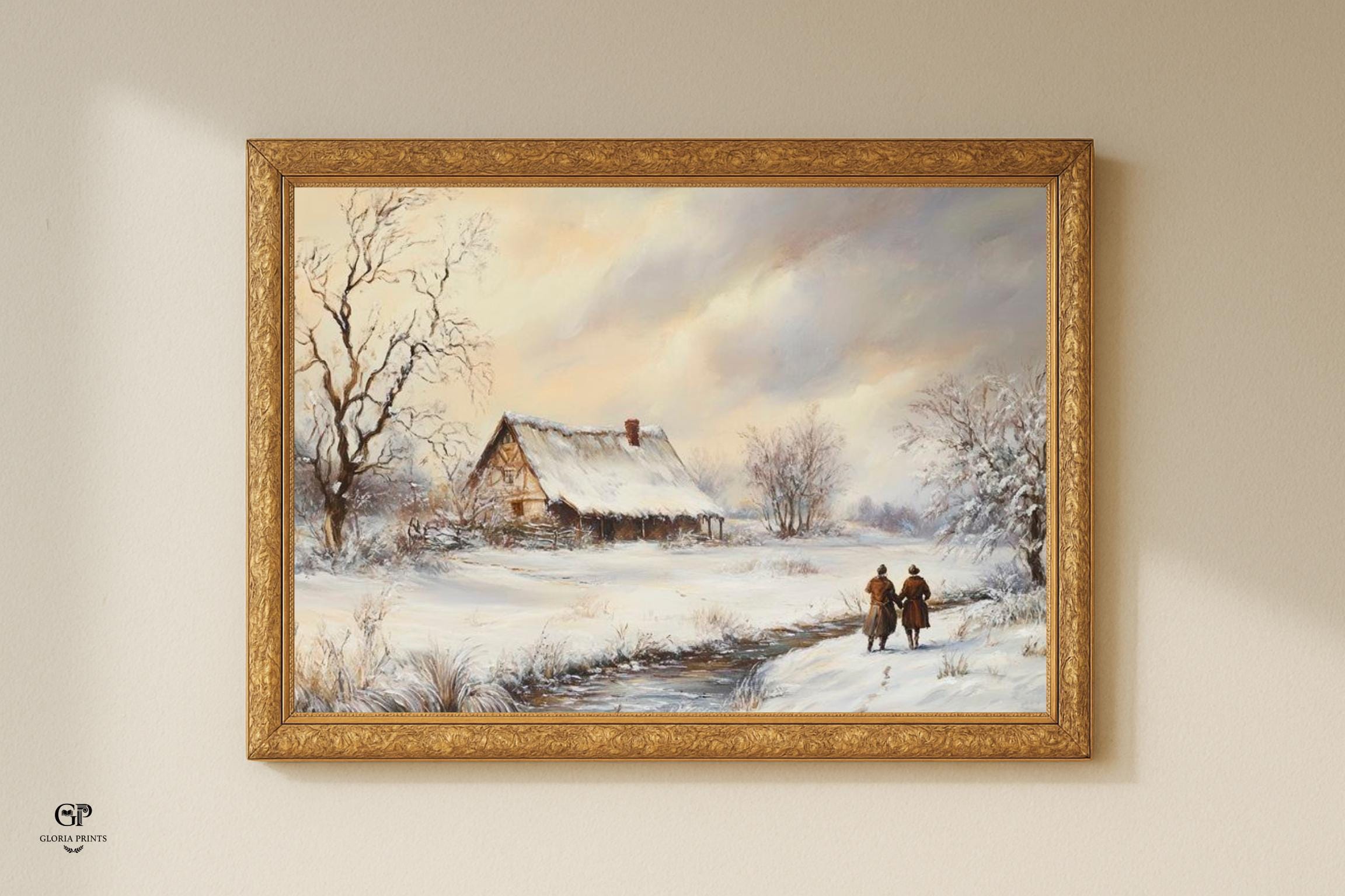 - A serene vintage print capturing a snowy countryside landscape. Ideal for adding a peaceful, rustic farmhouse charm and winter atmosphere to your space. The painting features a snow-covered cottage by a stream, with two figures walking along the path, evoking a sense of quiet companionship and nostalgic winter beauty.