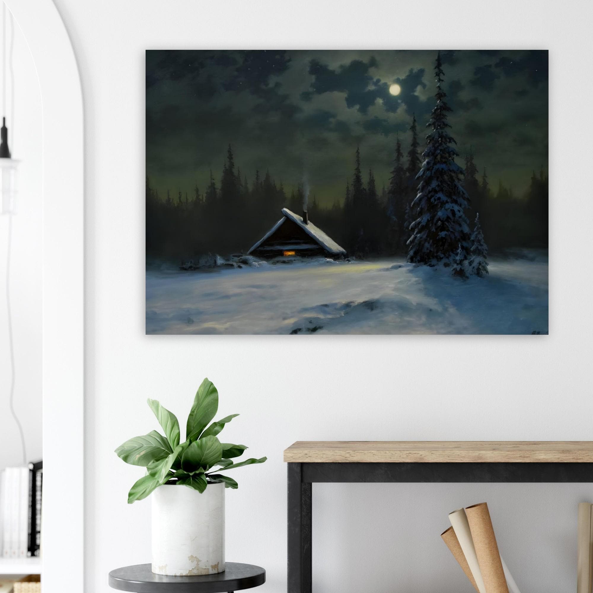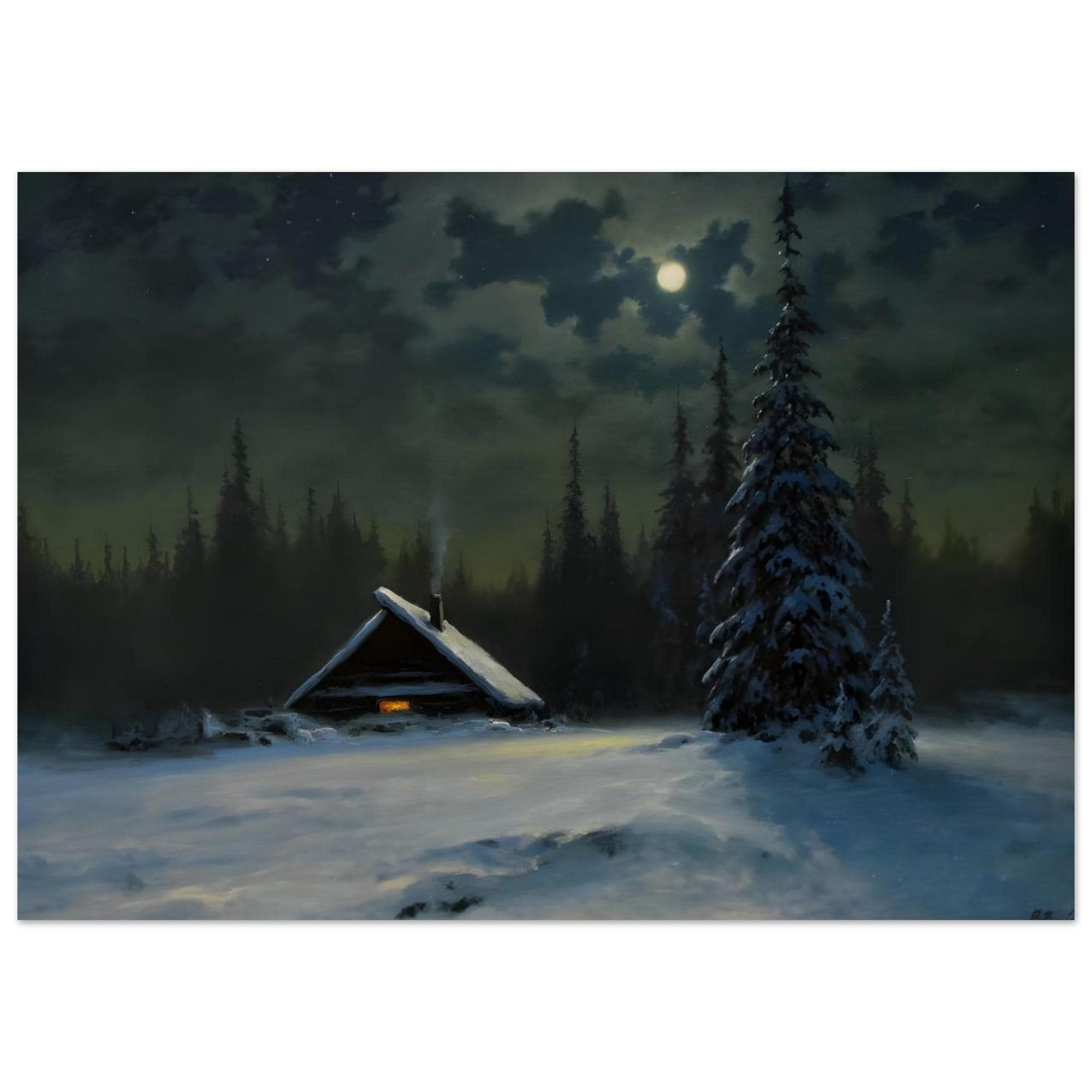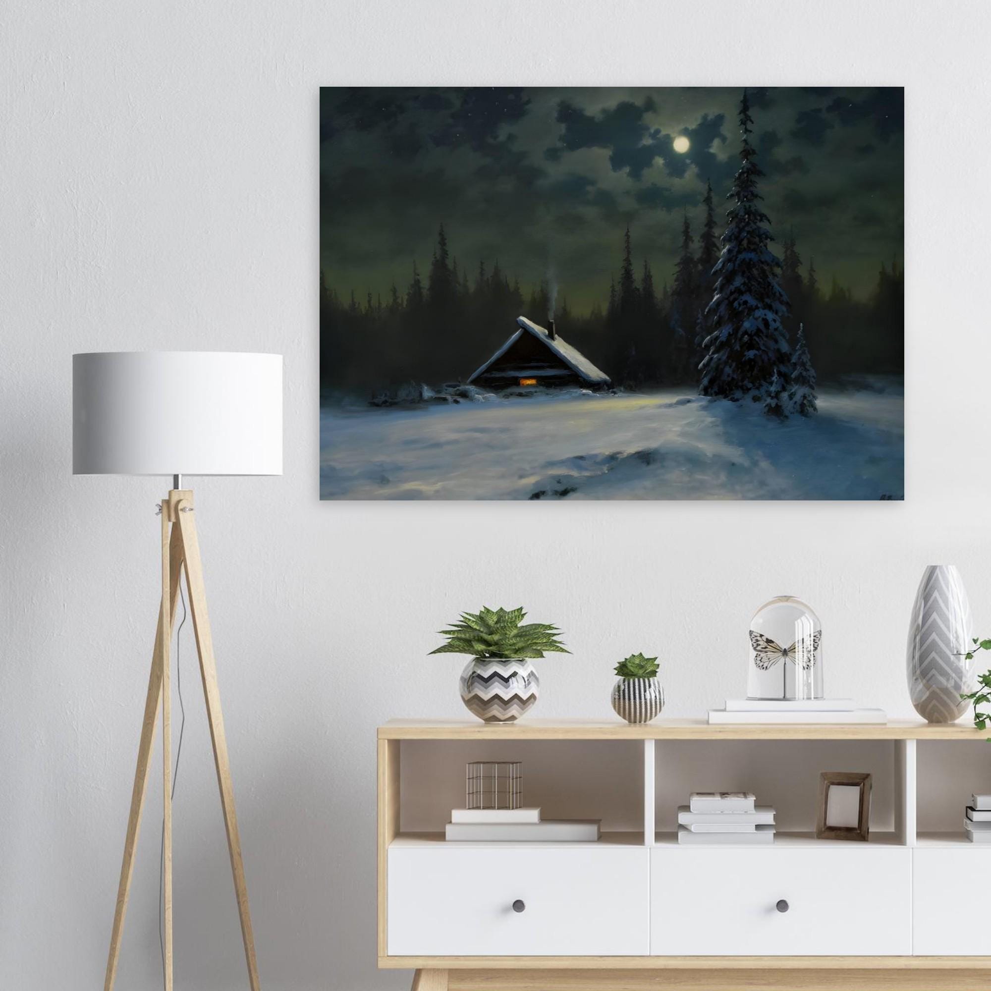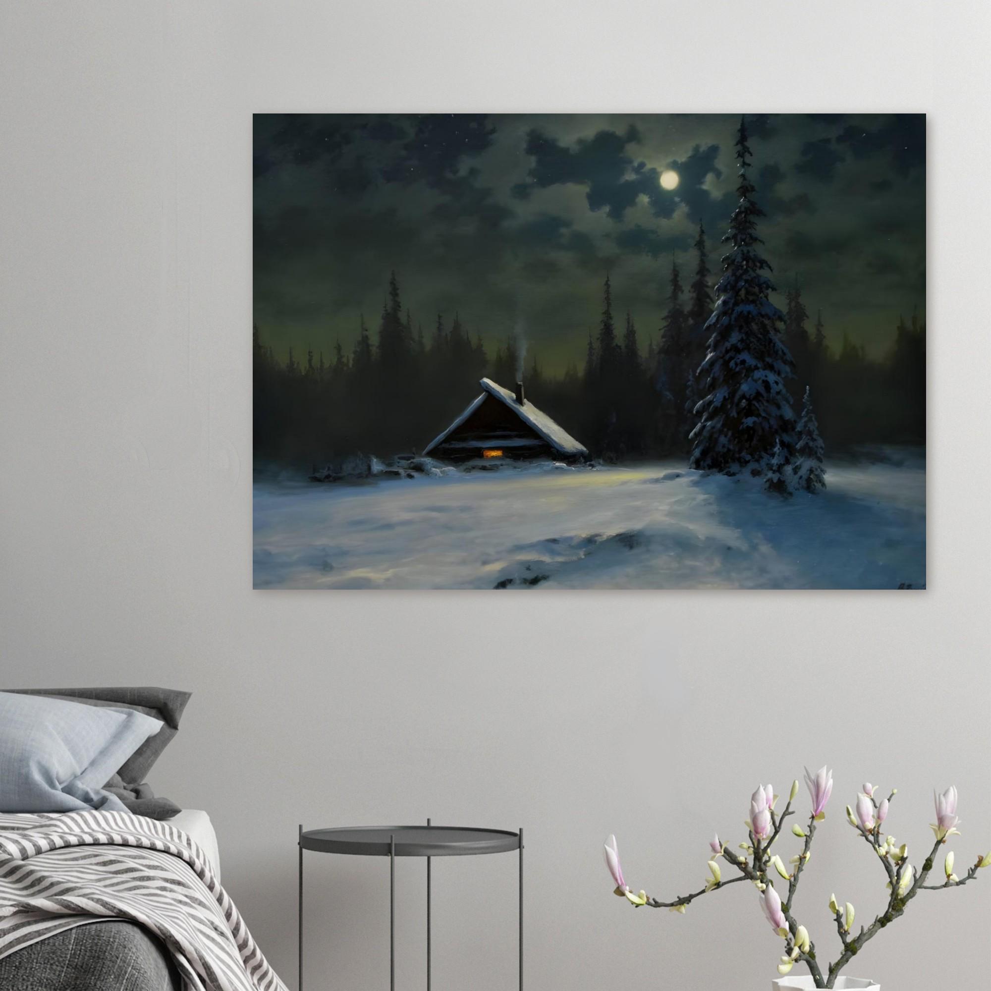 - A captivating vintage-style print capturing a serene winter night scene. Ideal for adding a moody, atmospheric charm and rustic coziness to your space. The painting features a solitary snow-covered cabin with a warm glowing window, nestled among dark pine trees under the soft light of a full moon.