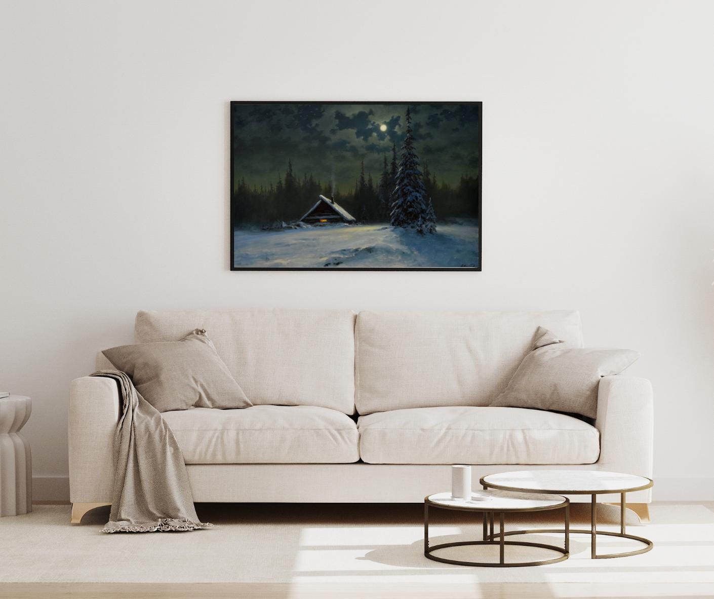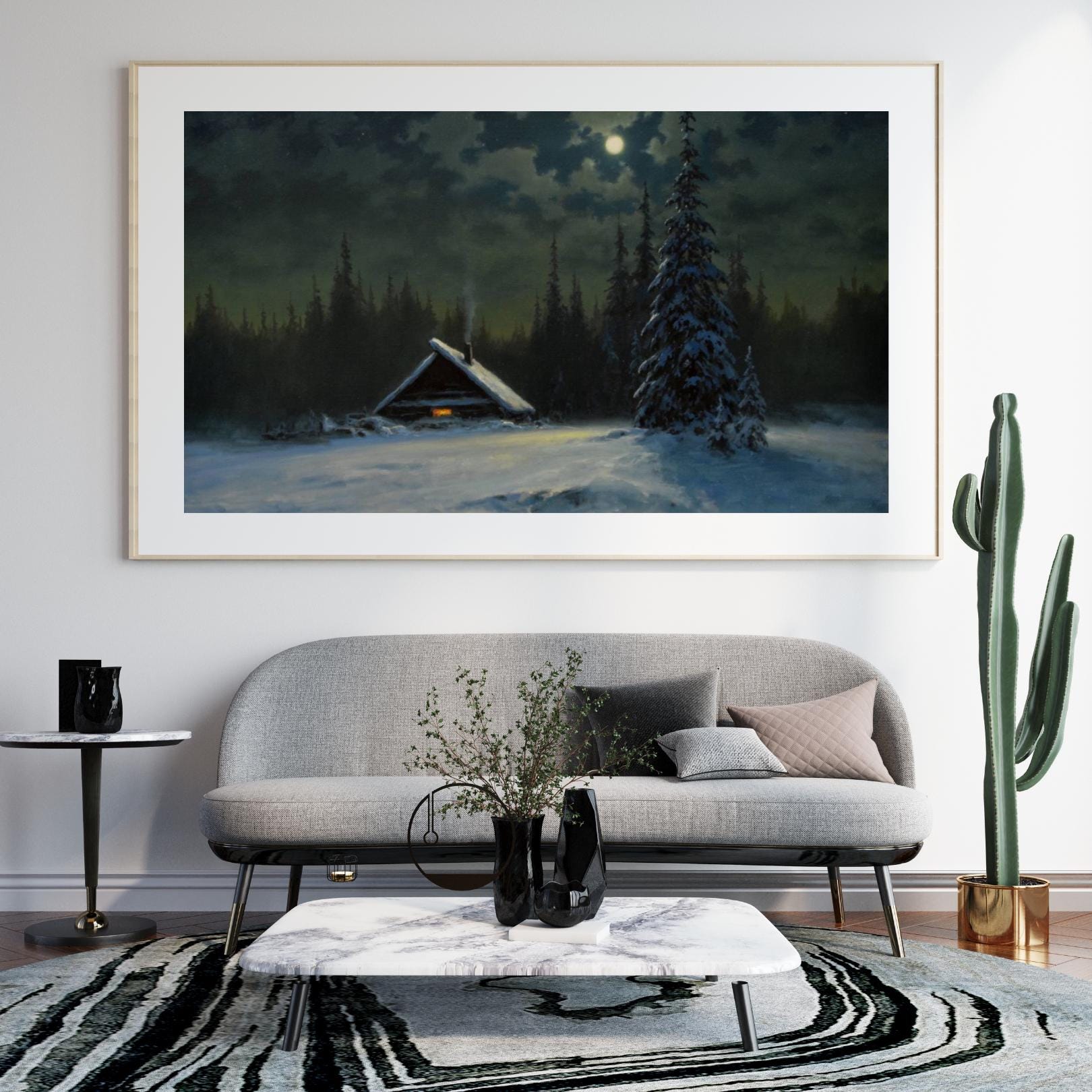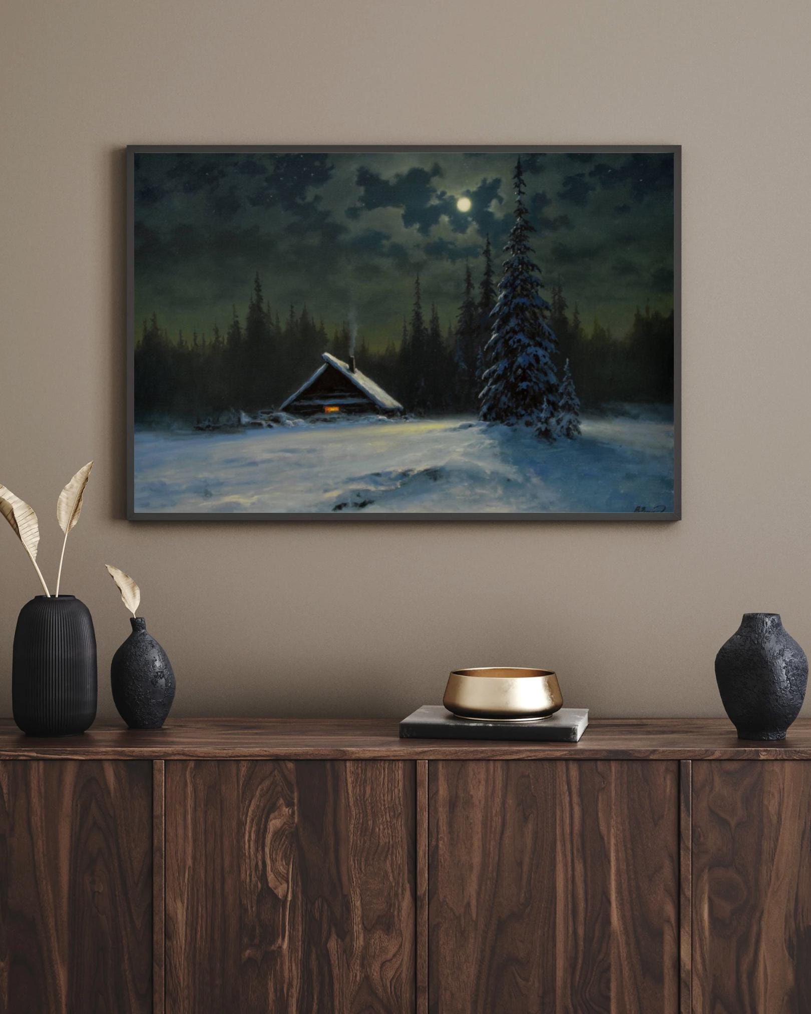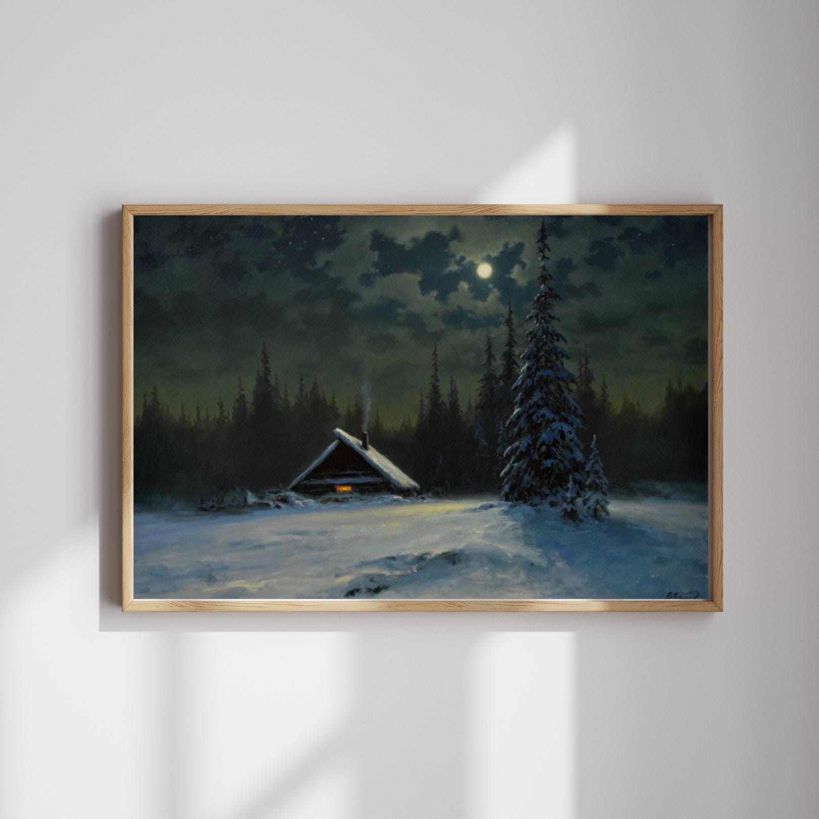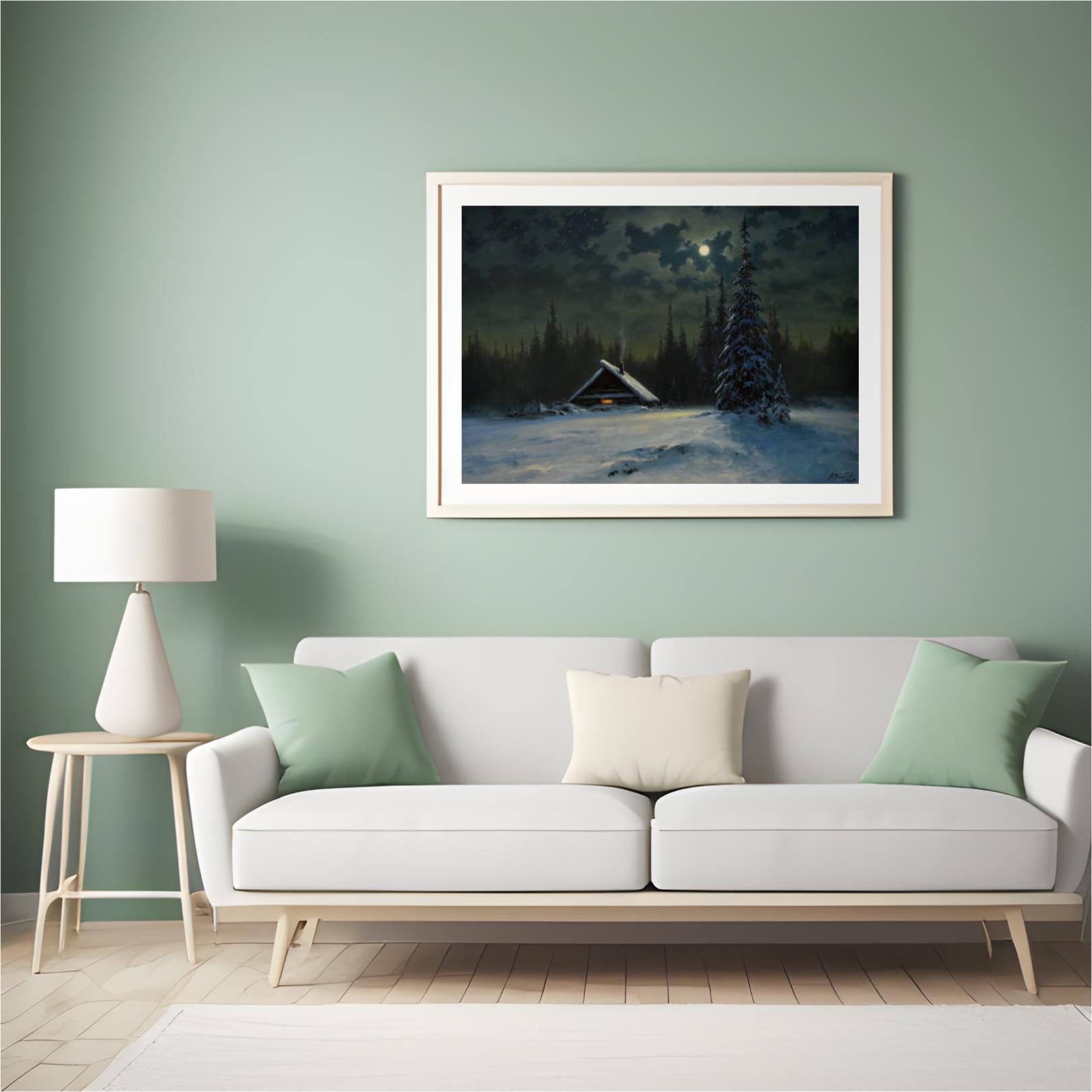 - A captivating vintage-style print capturing a serene winter night scene. Ideal for adding a moody, atmospheric charm and rustic coziness to your space. The painting features a solitary snow-covered cabin with a warm glowing window, nestled among dark pine trees under the soft light of a full moon.